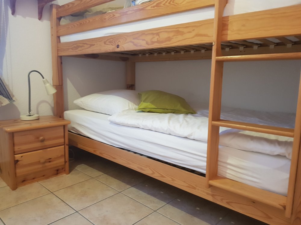 Die drei modern eingerichteten Schlafzimmer sind einmal mit 1 Doppelbett, das zweite mit zwei Einzelbetten und das dritte mit einem Etagenbett gibt ein geräumiges Bad mit Fenster und ein Gäste WC, die Küche ist vollständig ausgestattet ,im Haus befindet sich ein Spielzimmer.