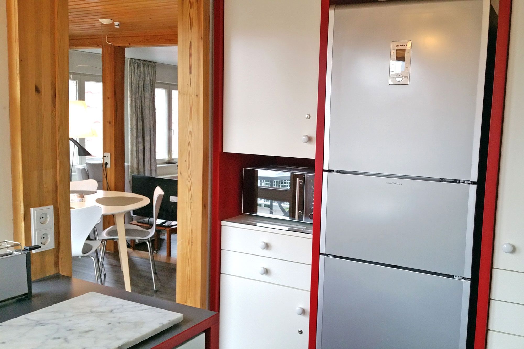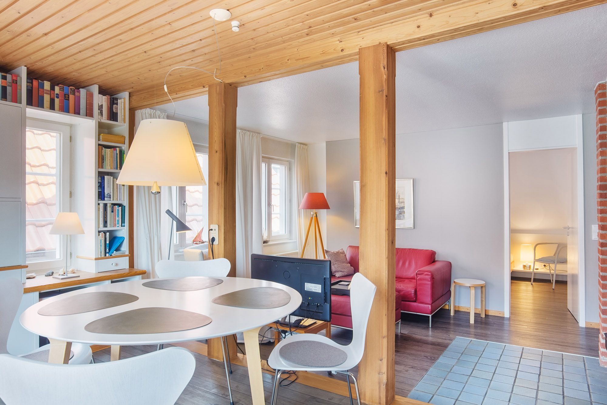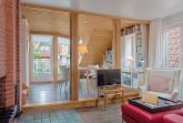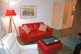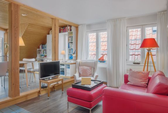 Der stilvolle Wohnbereich mit roter Couch, TV, WLAN und Kamin (nicht nutzbar) ist mit einem Laminat-Fußboden ausgestattet. Im angeschlossenen Essbereich und der Leseecke lassen Sie Ihren Gedanken freien Lauf. Die Einrichtung besticht durch LCD-TV und stimmungsvolle Möbel.