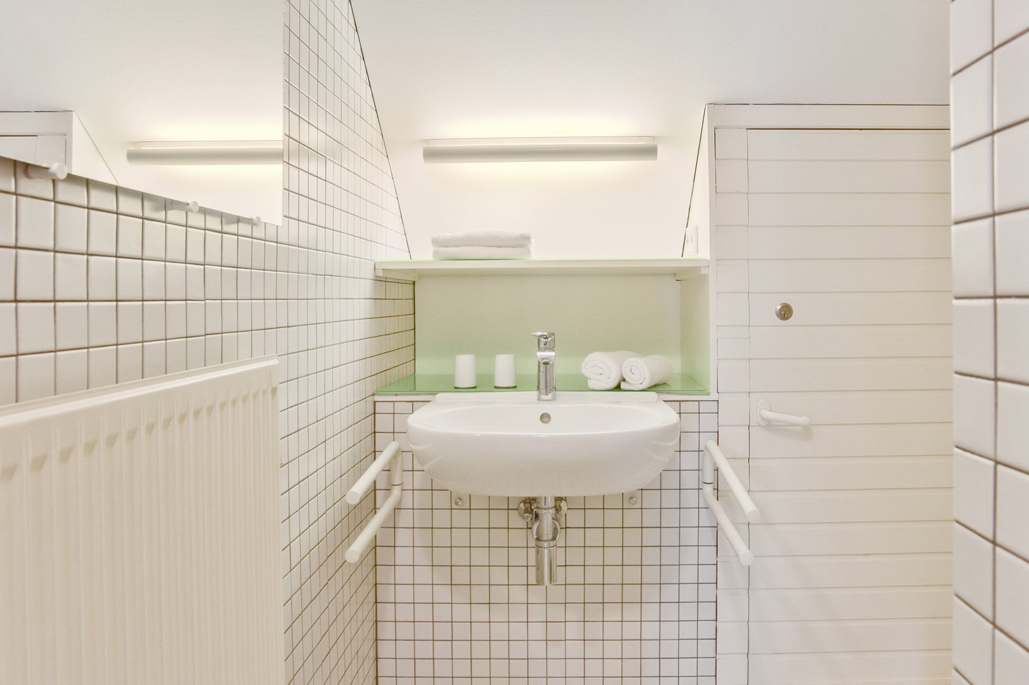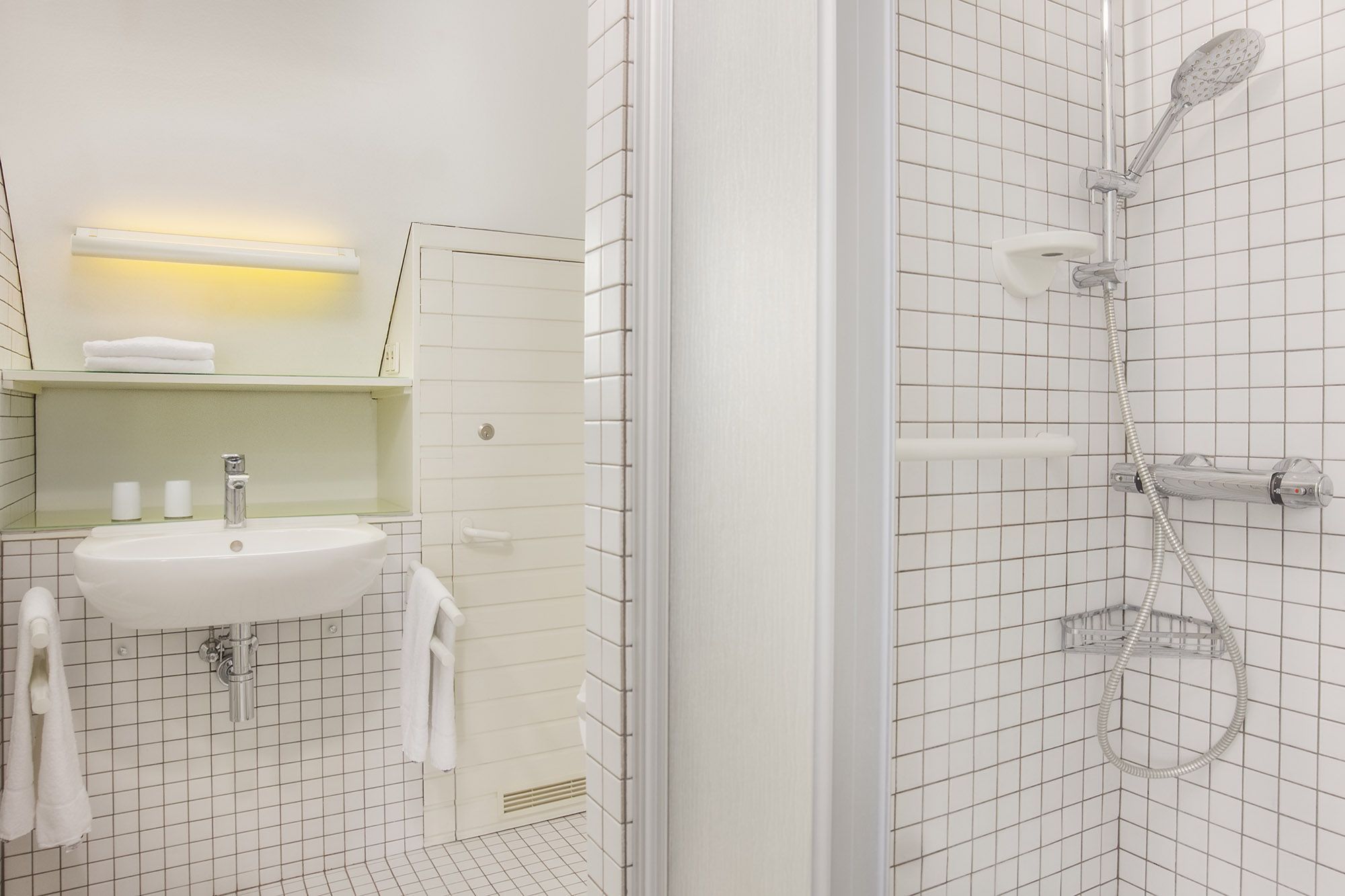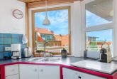 Das innenliegende Badezimmer mit Dusche und WC ist hell gefliest. Die Küche ist mit einem Herd mit Ceranfeld, Kaffeemaschine, Spülmaschine, Mikrowelle etc. ausgestattet. Hier sehen Sie beim Kochen und mit gutem Auge und Sicht in der Ferne die Ostsee und Fehmarn.