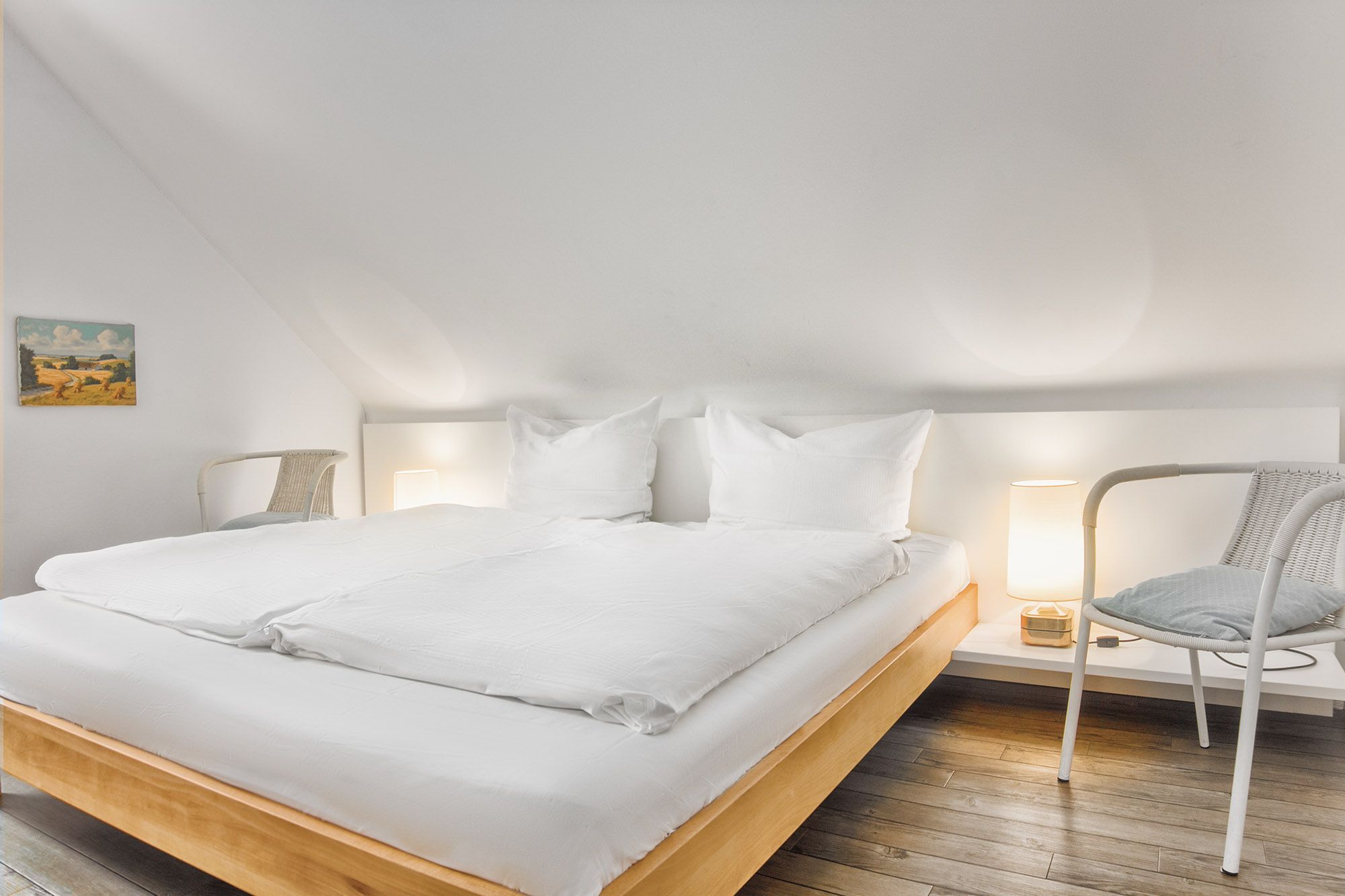 Für weitere Entspannung sorgt der möblierte Balkon mit Blick auf den idyllischen Garten. Trinken Sie hier Ihren Kaffee in der Sonne oder genießen Sie ein kühles Glas Wein am Abend. Der Garten mit Holz-Sitzmöbeln lädt ebenfalls zum Verweilen ein.