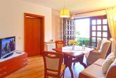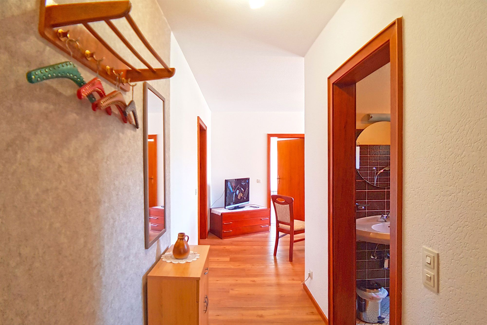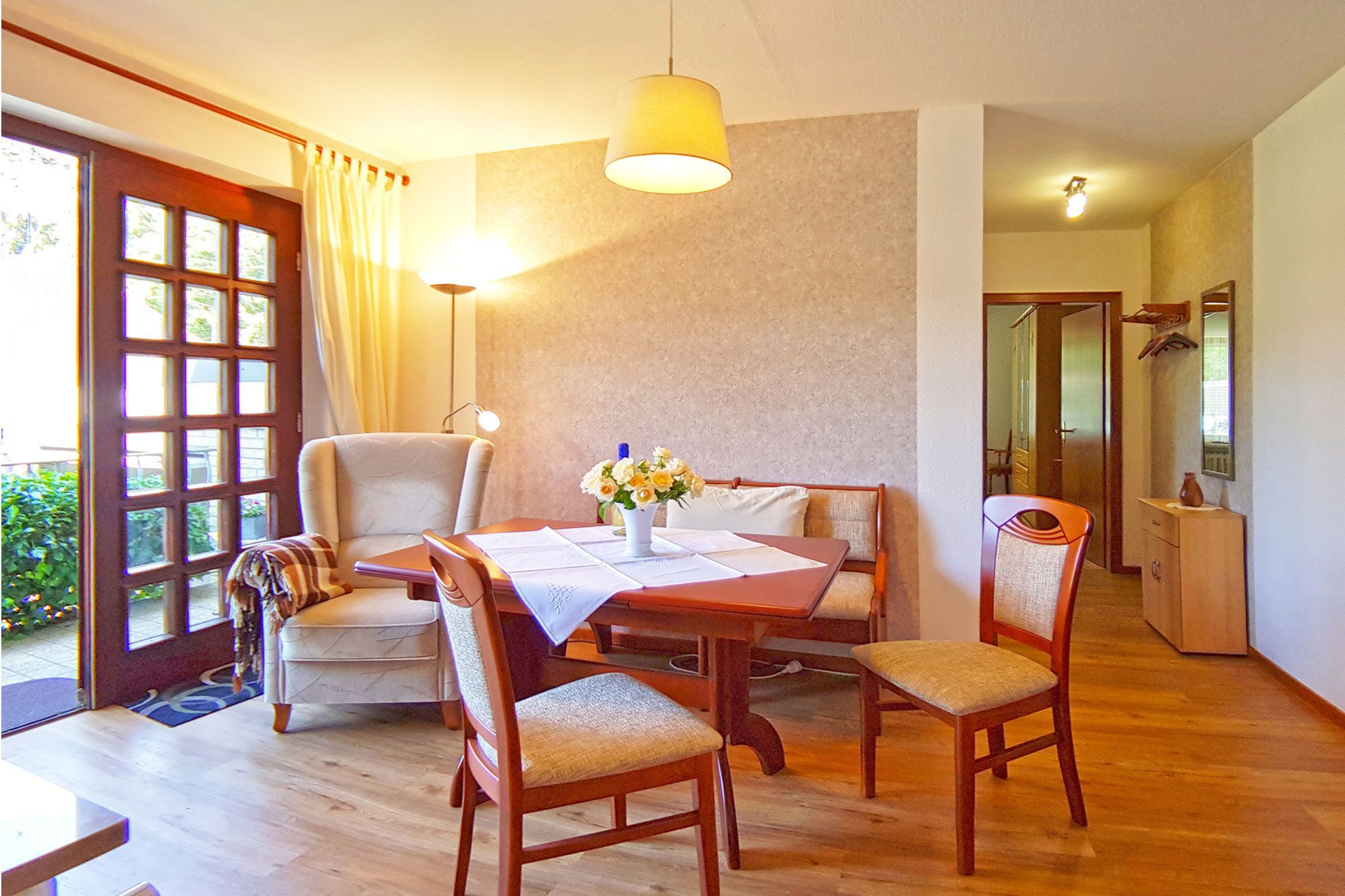 Die schöne, lichtdurchflutete Wohnung bietet viel Platz, ist stimmungsvoll eingerichtet und hat eine große Terrasse und Garten zur Südseite. Diese lädt zum Verweilen und Grillen ein. Sie ist interessant für Familien oder max. 4 Erwachsene mit 1 kleinem Kind, da sie über zwei Schlafzimmer mit Doppelbetten, sowie ein Baby-Reisebett verfügt. Hochstuhl und Wickeltisch verfügbar. Für Abdunklung sorgen die Außenjalousien. Der Wohnbereich ist teilweise mit einem Teppich-Fußboden ausgestattet, das Badezimmer ist gefliest. Die Einrichtung ist wohnfreundlich mit Flat-TV, WLAN und wohnungstypischen Möbeln versehen. Die Küche ist mit einem Herd mit vier Platten, Backofen mit Grill, Spüler, Kaffeemaschine, Wasserkocher etc. ausgestattet. Waschmaschine beim Vermieter auf Nachfrage.