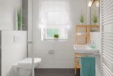 Das Badezimmer mit Dusche lädt auch an ungemütlicheren Tagen zur Entspannung ein. Eine Waschmaschine ist in der Unterkunft selbstverständlich vorhanden.