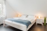 Die Ferienwohnung verfügt im ersten Schlafzimmer über ein Doppelbett (180x200). Das zweite Schlafzimmer im Dachgeschoss ist mit zwei Einzelbetten (90x200) ausgestattet. Ein Kleiderschrank bzw. Kommode bietet dabei viel Stauraum. Safe, Reisebettchen (ohne Bettzeug) und Hochstuhl sind vorhanden. Rollläden sorgen bei Bedarf für die nötige Verdunklung.