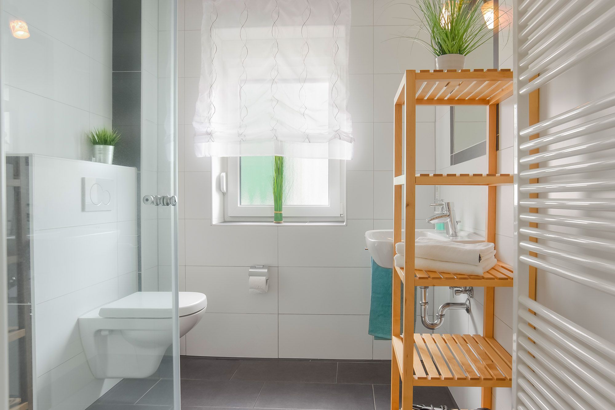 Das Badezimmer mit Dusche lädt auch an ungemütlicheren Tagen zur Entspannung ein. Eine Waschmaschine ist in der Unterkunft selbstverständlich vorhanden.