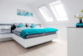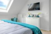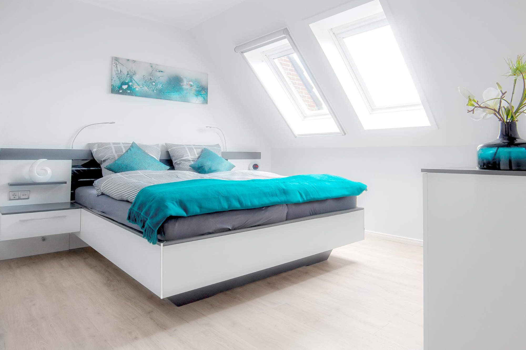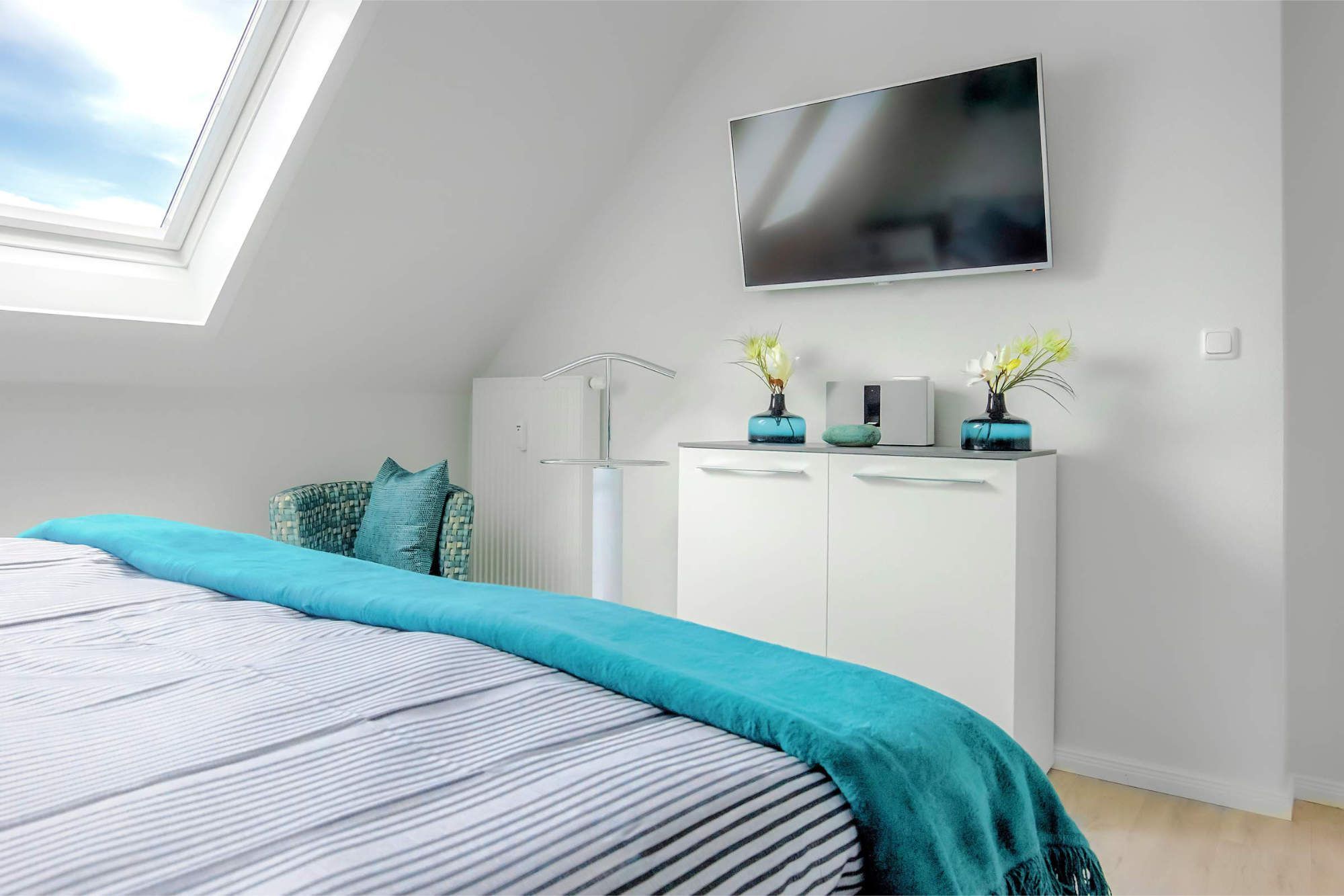 Die Ferienwohnung Seewind verfügt im Schlafzimmer über ein erhöhtes Doppelbett (180x200). Ein großer Kleiderschrank bietet dabei viel Stauraum. Rollos sorgen für Verdunklung. Eine Entertainment-Ausstattung mit HD-TV, Internet-Radio und Beleuchtungselementen gehört hier auch dazu.