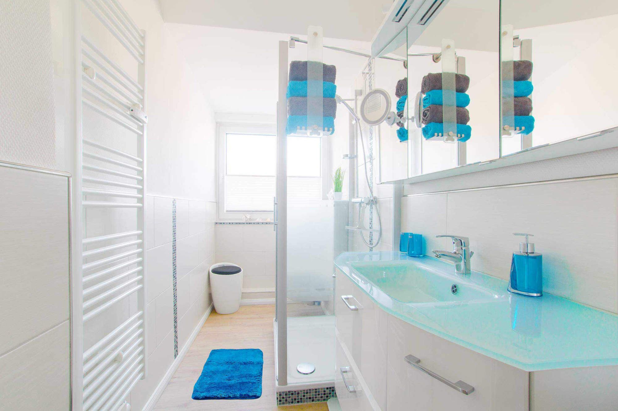 Das Wohlfühl-Badezimmer mit Fenster, ebenerdiger Dusche und Handtuchwärmer lädt auch an ungemütlicheren Tagen zur Entspannung ein. Ein Waschmaschine-Trockner-Kombigerät ist in der Unterkunft selbstverständlich vorhanden.