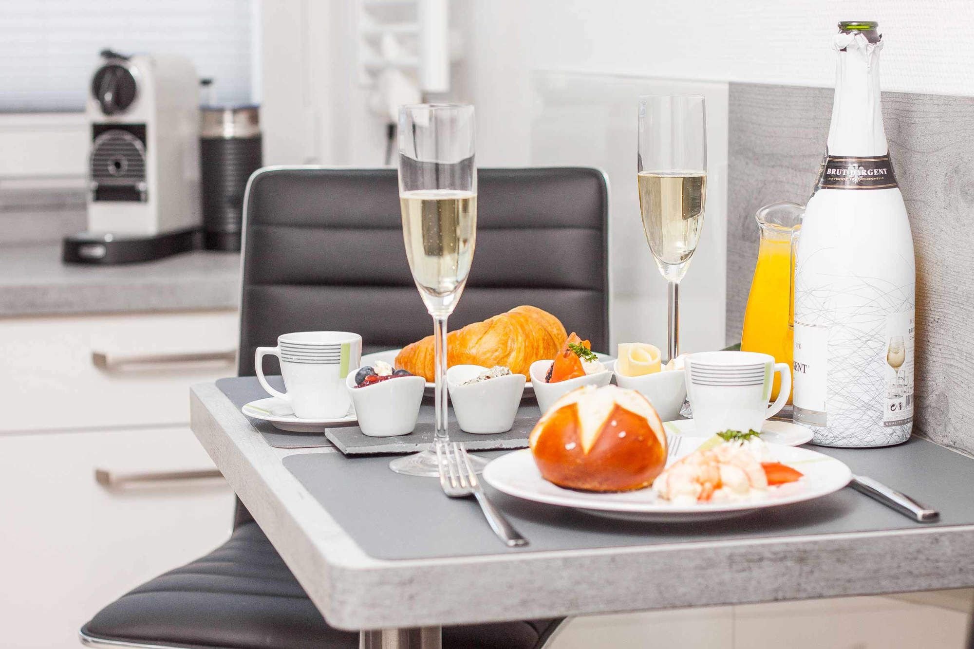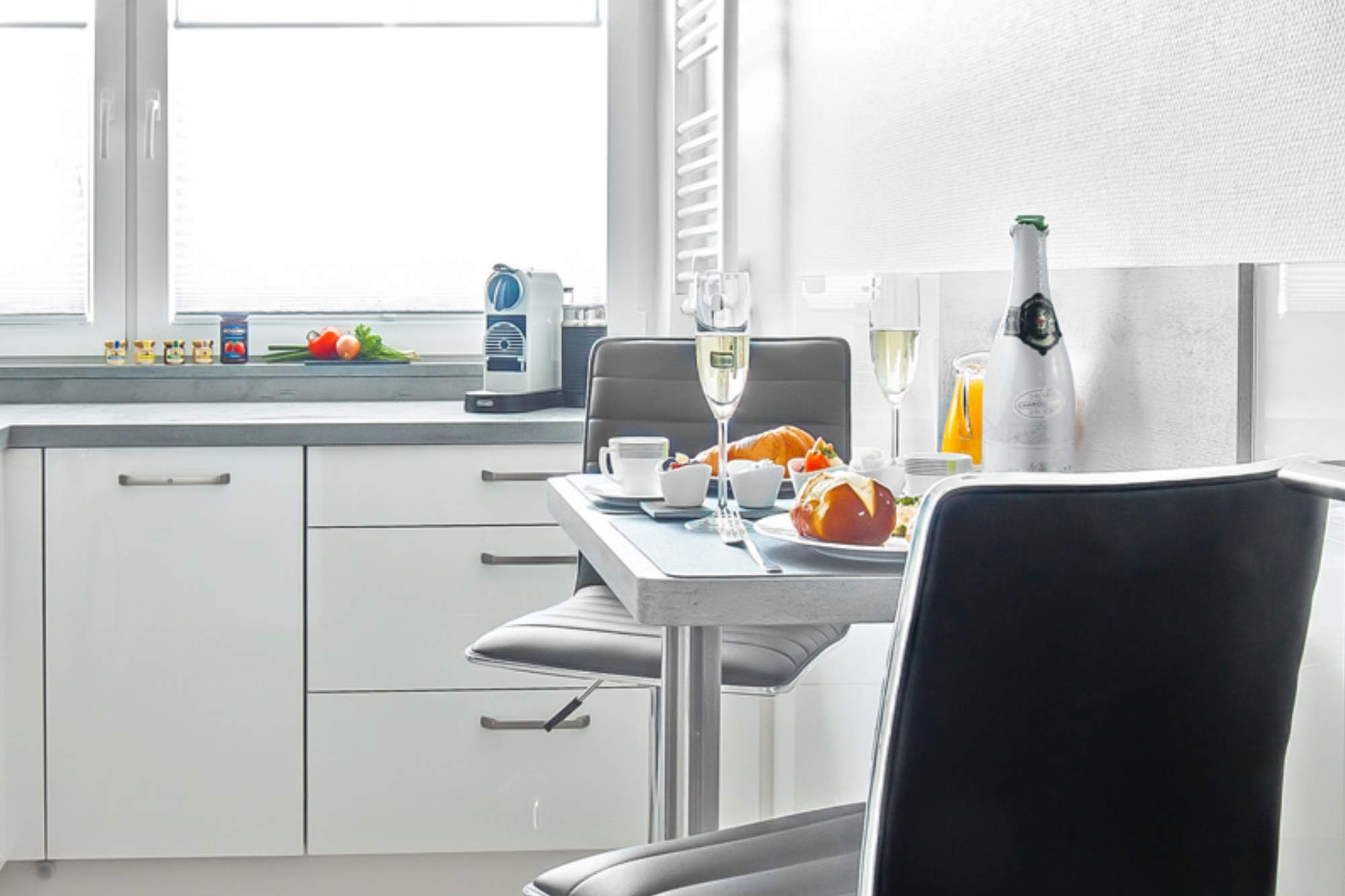 Die separate Küche mit kompletter Ausstattung, sowie Bistrotisch und Tresen Stühlen für den kleinen Hunger ist zudem sehr komfortabel. Es ist alles an Geräten und Utensilien vorhanden, was Sie für Ihren hochwertigen Urlaub erwarten. Der Kulinarik steht nichts im Wege. Dafür sorgt auch der Essbereich des Wohnzimmers mit Sitzkomfort und ausziehbarem Esstisch. Begrüßen Sie hier doch einfach Urlaubsbekanntschaften zum gepflegten Beisammensein.