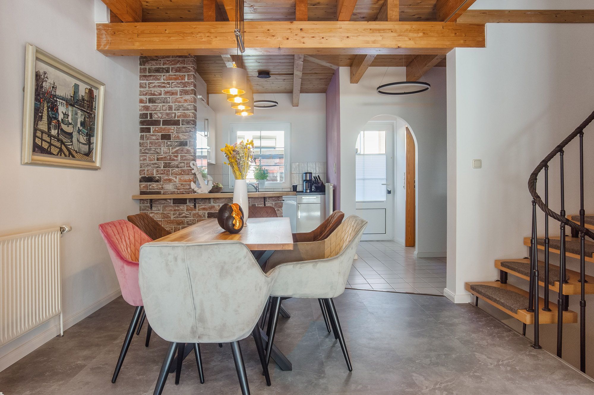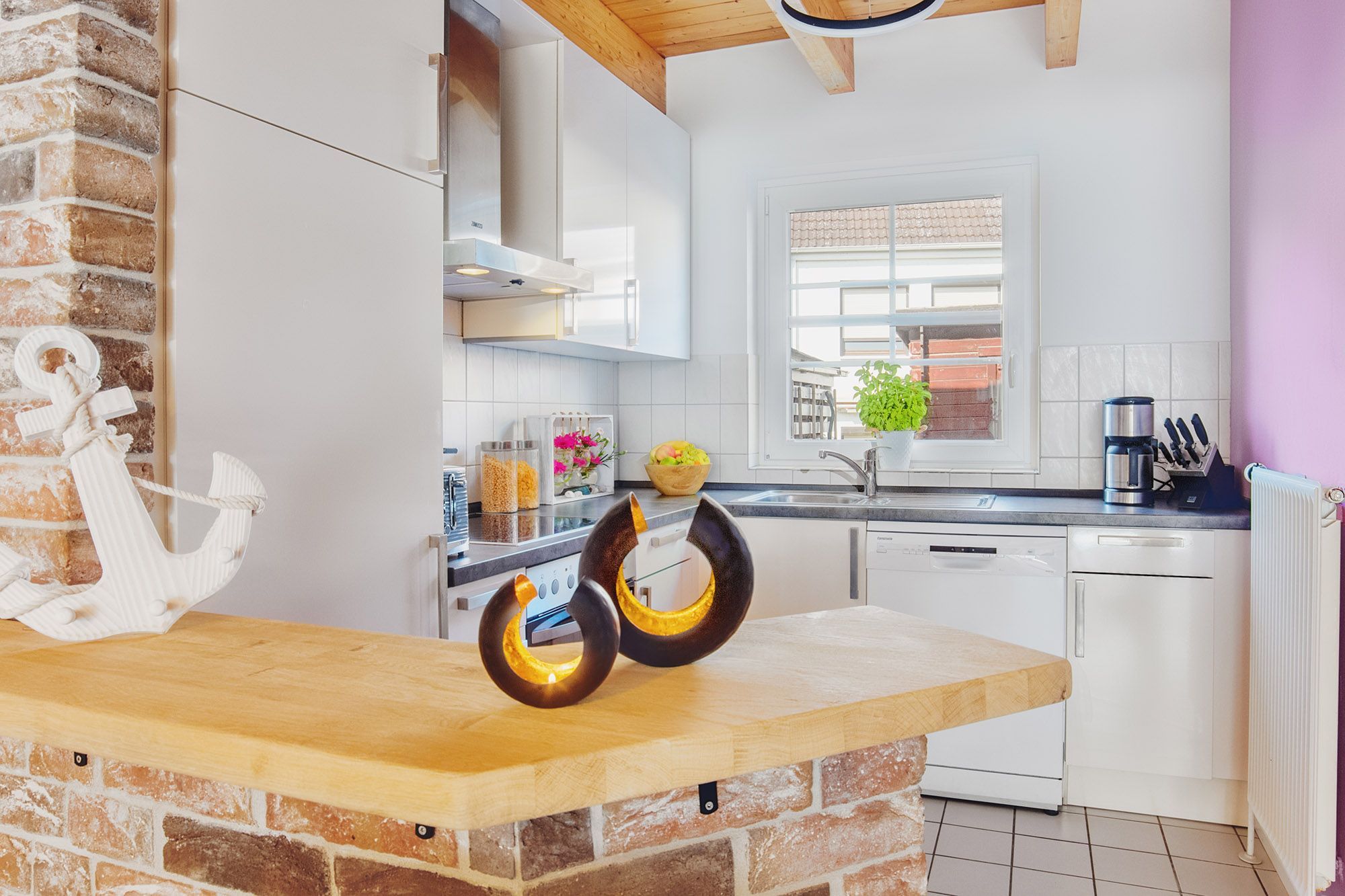 Der Essbereich, welcher an die offene Küche (mit Spüler und mit kleinem Tresen) grenzt, ist ein wenig das Zentrum des Sünnhus. Utensilien, welche Sie für Ihren Urlaub in einem Ferienhaus erwarten dürfen, sind vorhanden. Der Kulinarik steht nichts im Wege.
