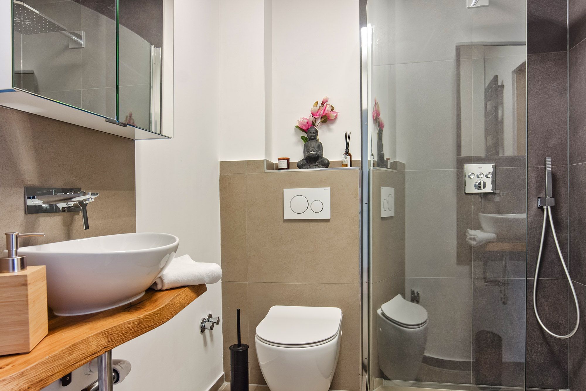 Das Sünnhus hat 2 Duschbäder. Ein kleines im 1.OG ist von den Schlafzimmern direkt erreichbar und bietet mit Handtuchwärmer und ebenerdige Dusche Komfort und Annehmlichkeit. Eine weitere ebenerdige Dusche ist in den großen Kellerraum integriert. Hier stehen zudem eine Waschmaschine und ein Trockner zur Verfügung. Später soll hier noch eine Sauna Einzug halten. Ein separates Gäste-WC finden Sie im Erdgeschoss.