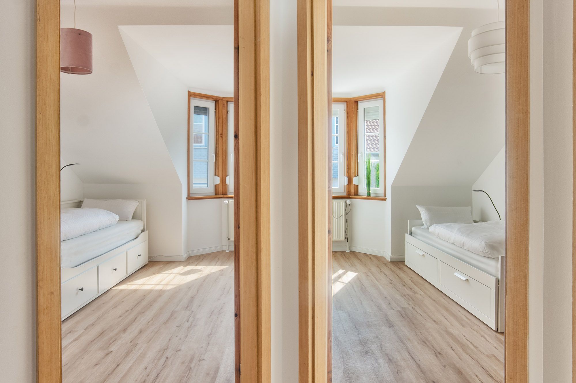 Das Ferienhaus verfügt über maximal 6 Schlafmöglichkeiten durch 3 separate Schlafzimmer. Einmal mit Doppelbett (180x200) und zwei kleinere Schlafzimmer als Kinderzimmer konzipiert mit Einzelbett (80x200) und Ausziehfunktion (je +1 Pers). Alle Räume haben TV und Rollläden bzw. sind zusätzlich mit Plissees und Vorhängen zum Sichtschutz und zur Verdunklung ausgestattet.