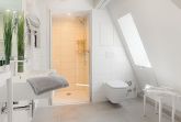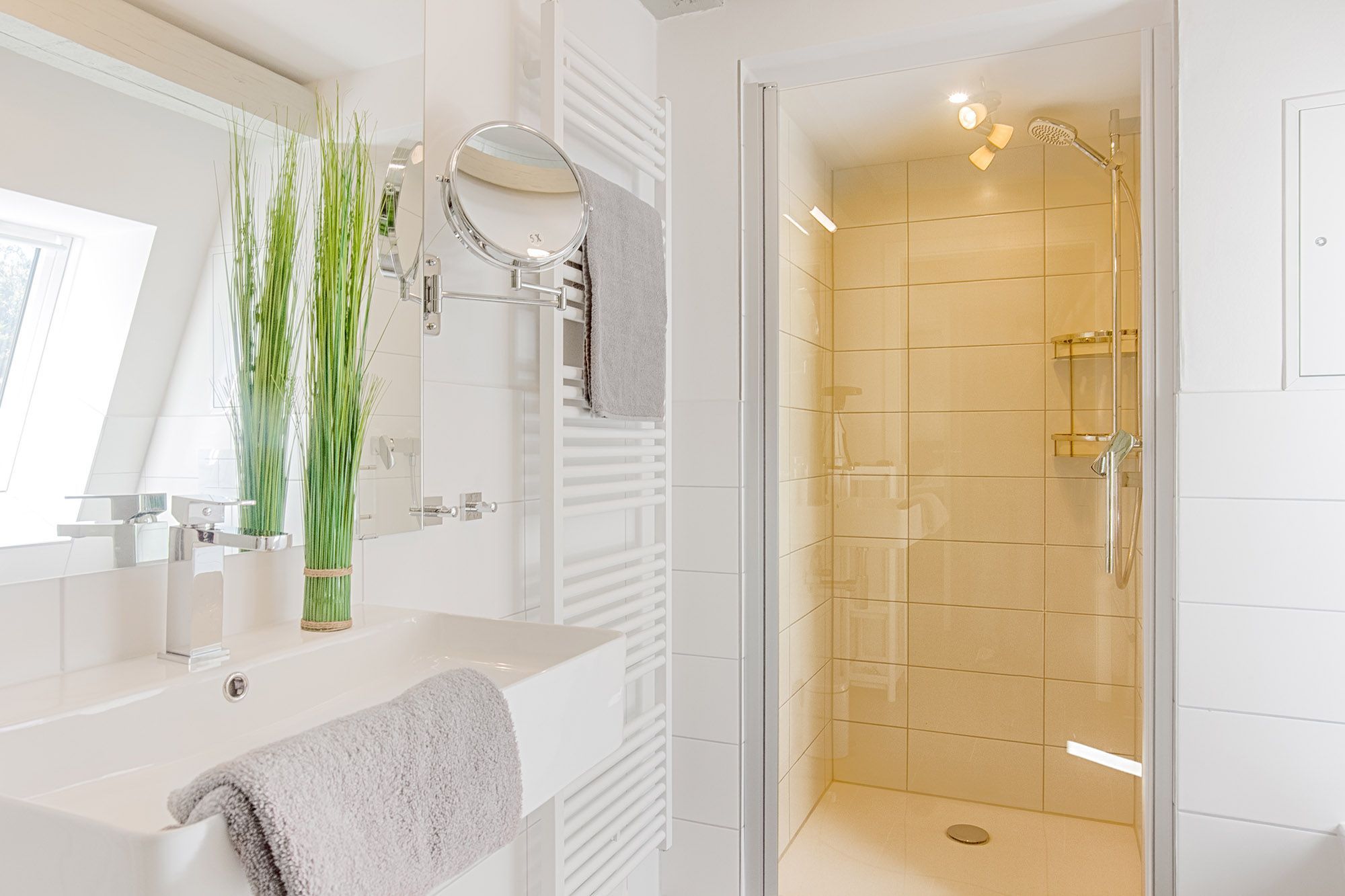 Das moderne Badezimmer mit ebenerdiger Dusche, Handtuchwärmer, Waschbecken und WC ist von den Schlafzimmern aus bequem erreichbar. Ein separater Raum im Erdgeschoss steht allen Gästen des Gutshauses zur Verfügung und bietet zusätzlichen Komfort mit Waschmaschine, Bügeleisen und -brett.