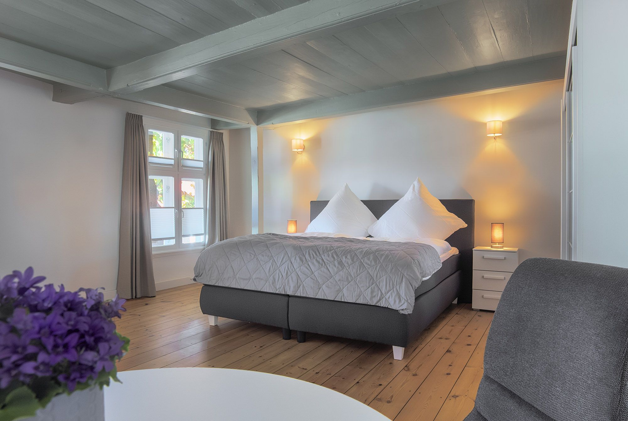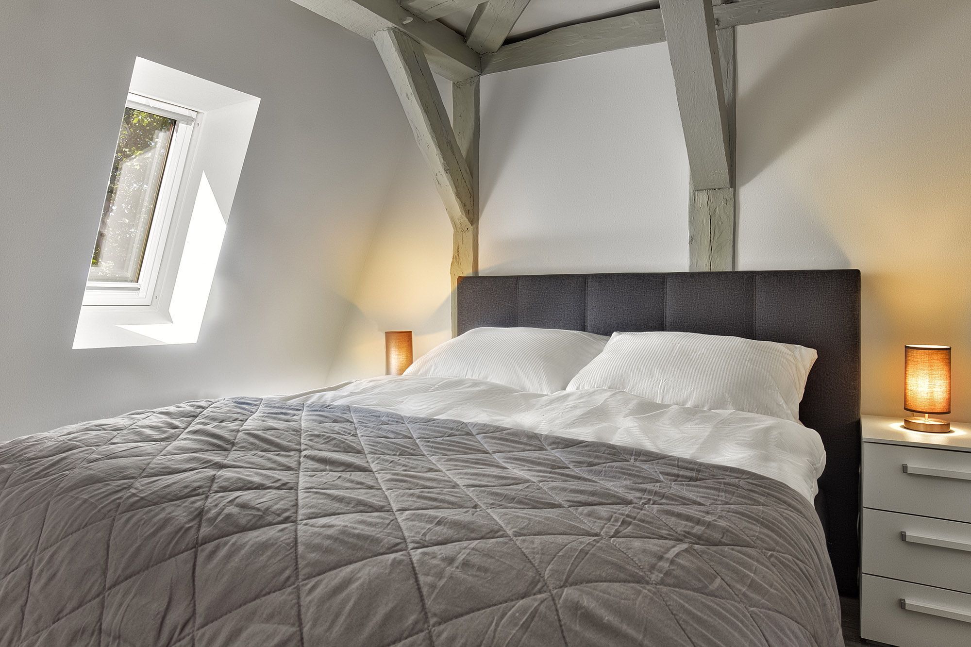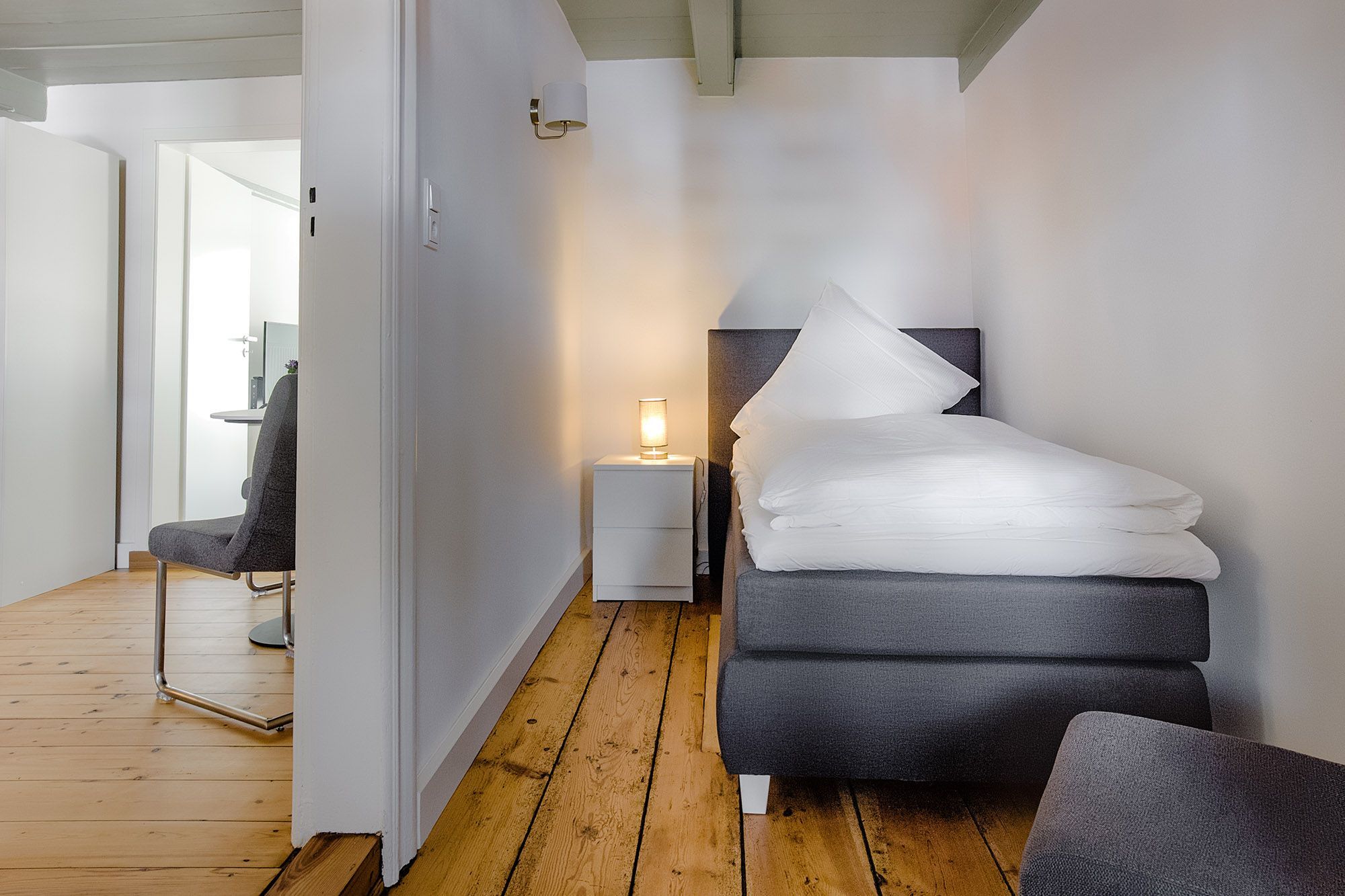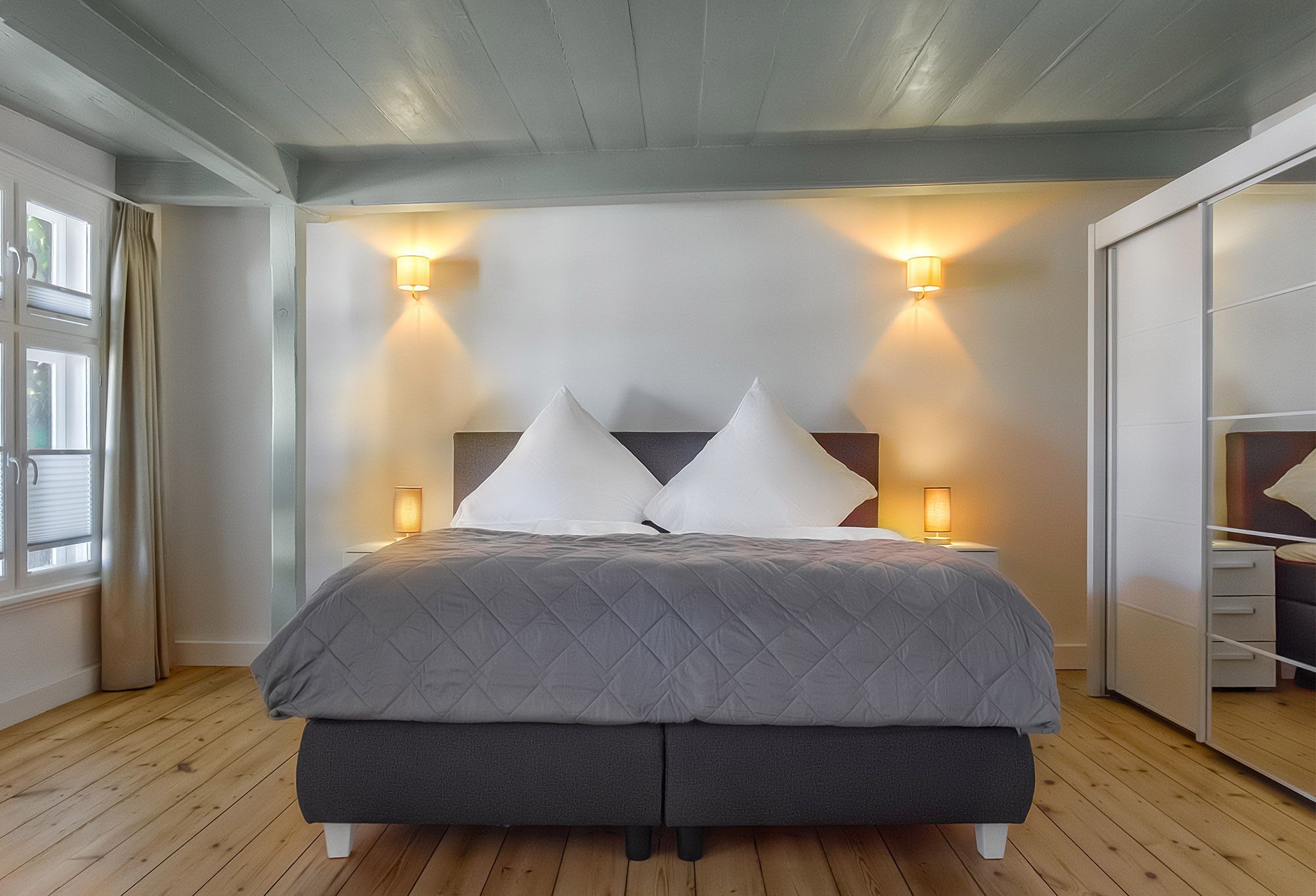 Die Ferienwohnung eignet sich besonders für Familien, da sie über drei Schlafzimmer verfügt. Das erste Schlafzimmer mit einem Doppelboxspringbett (180x200) dient als Durchgangszimmer zum zweiten Schlafzimmer mit einem Doppelboxspringbett (140x200). Das dritte Schlafzimmer ist mit einem Einzelboxspringbett (100x200) ausgestattet. Allergiker-geeignete Bettwäsche, Handtuchsets, ein Babyreisebett (ohne Bettzeug) und ein Hochstuhl können bei Bedarf gegen Gebühr geliehen werden. Für Verdunklung und eine angenehme Nachtruhe sorgen blickdichte Plissees.