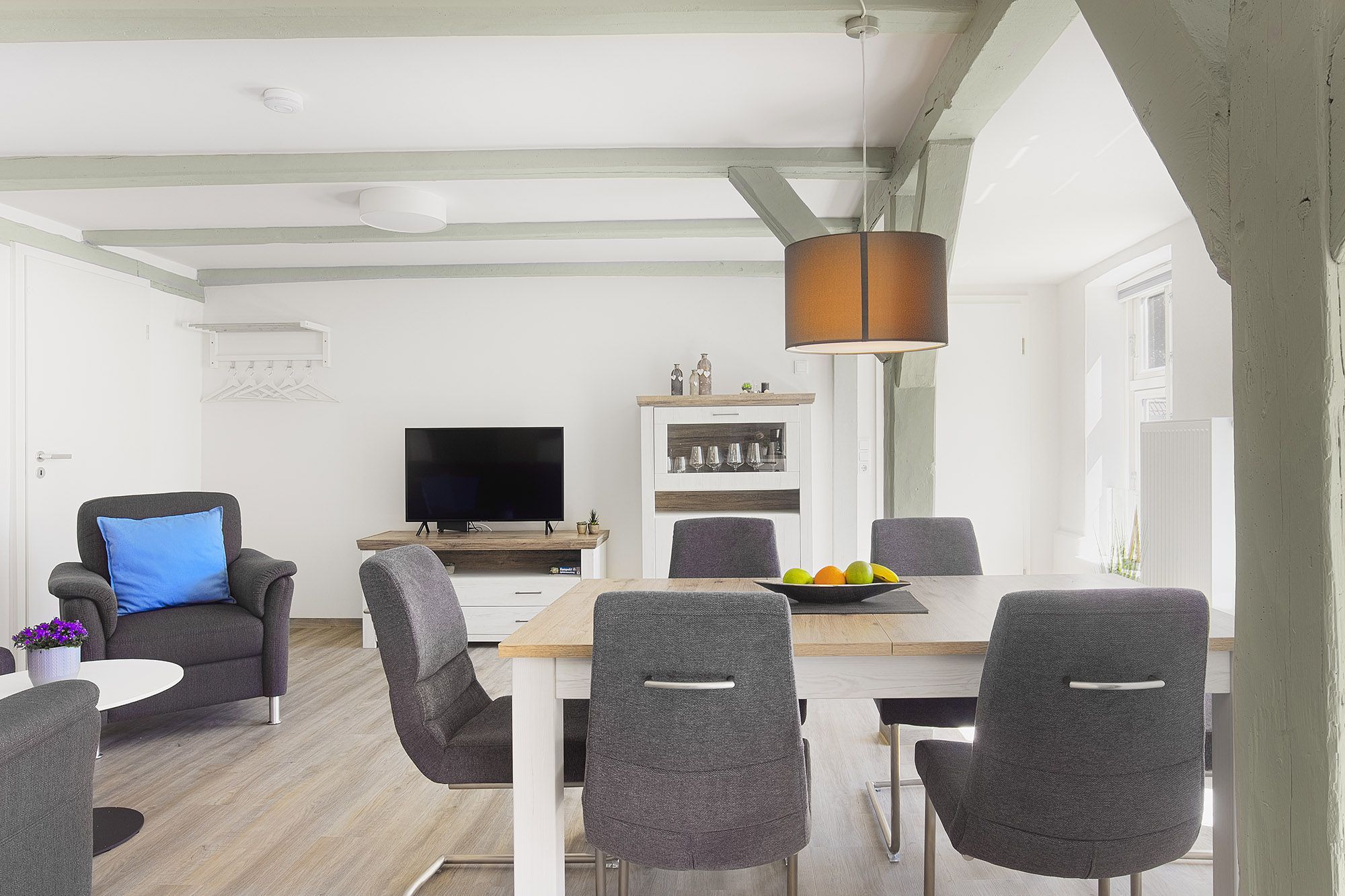 Der geschmackvolle Wohnbereich ist offen gestaltet und mit einer gemütlichen Couch, Smart-TV und WLAN für Unterhaltung ausgestattet. Große Fenster sorgen für viel Tageslicht und bieten vom Sofa aus einen direkten Blick ins Fischerdorf Heiligenhafen.