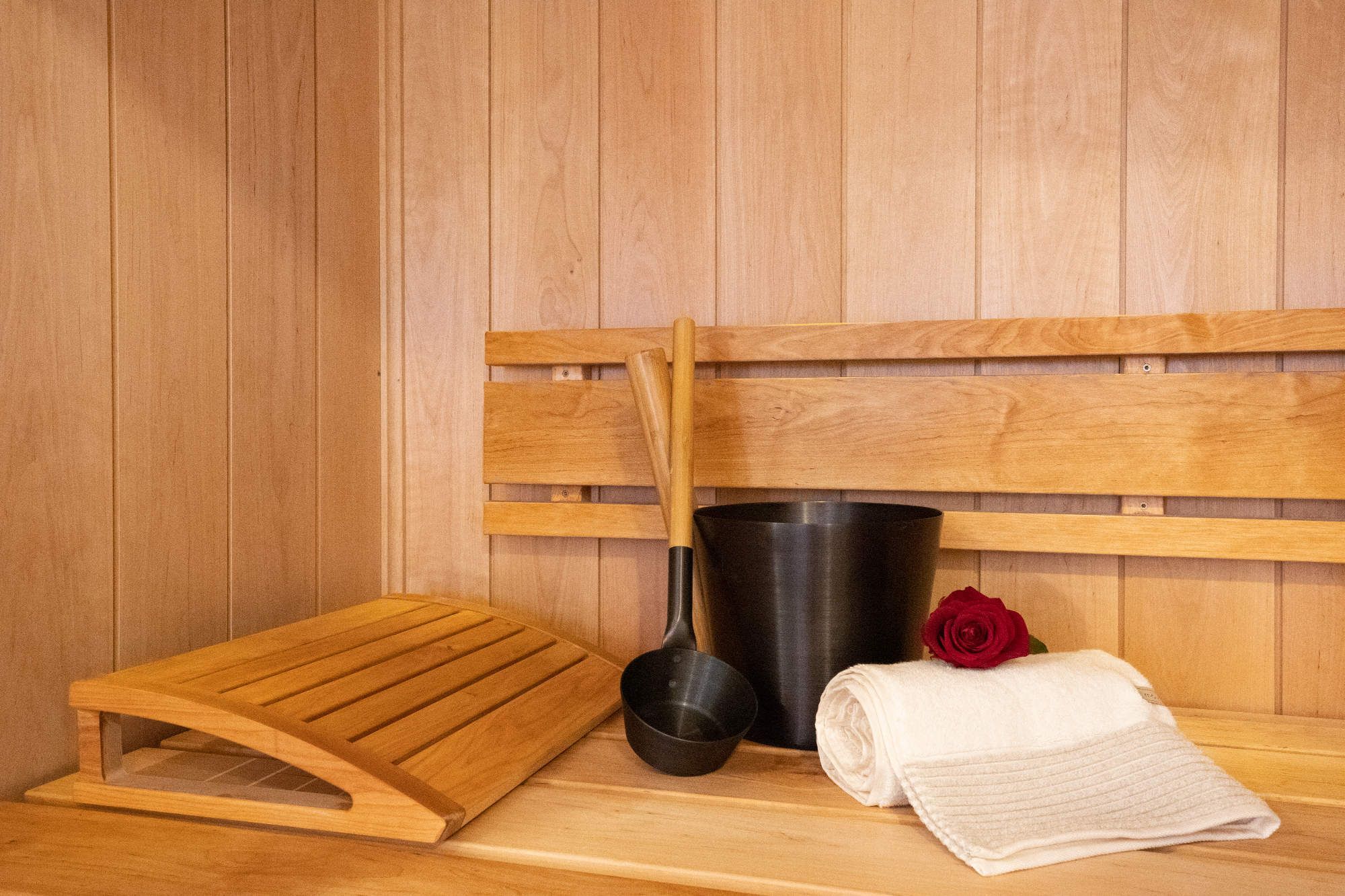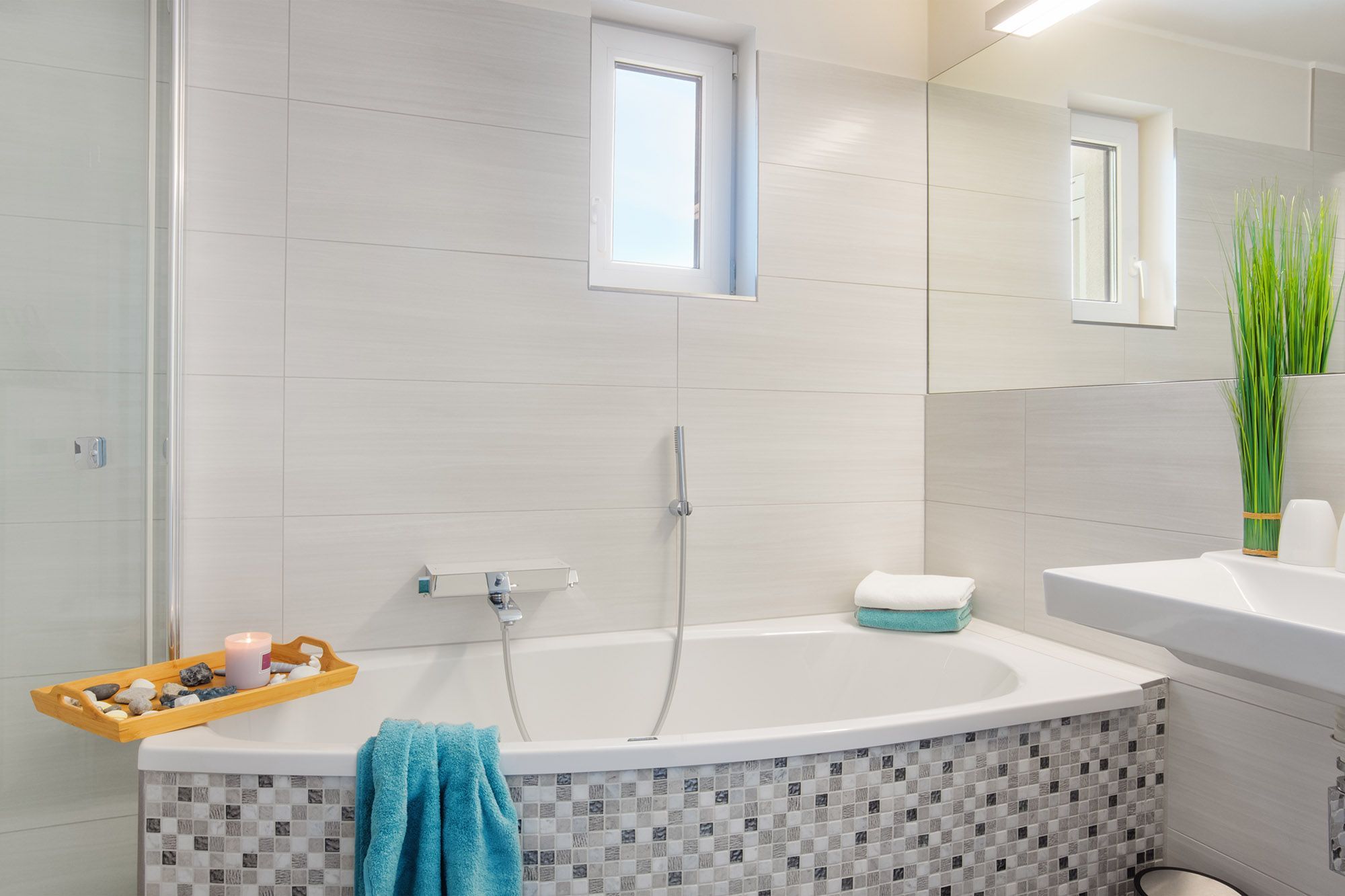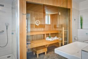 Die Wellness-Bäder, eines mit eigener Sauna und von einem Schlafzimmer direkt erreichbar, laden auch an grauen und kalten Tagen zur Entspannung ein. Handtuchwärmer, große Dusche oder Wanne sorgen für extra Annehmlichkeit. Eine Waschmaschine + Trockner (Münznutzung) stehen zudem im Erdgeschoss des Hauses zur Nutzung bereit. Als Besonderheit hierbei sei das kleine Fenster der Sauna, mit direktem Blick auf die Ostsee, genannt.
