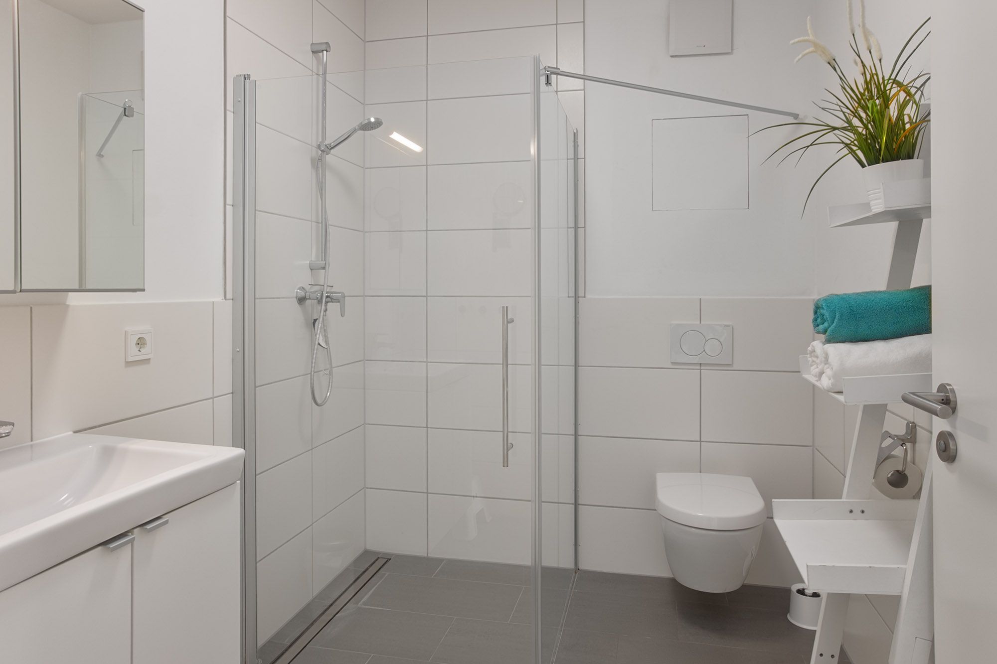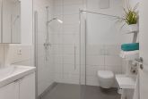 Das geräumige Badezimmer ist mit einer ebenerdigen Dusche, einem Waschbecken und einem WC ausgestattet. Ein separater Abstellraum mit Waschtrockner und Staubsauger sorgt für zusätzlichen Komfort.