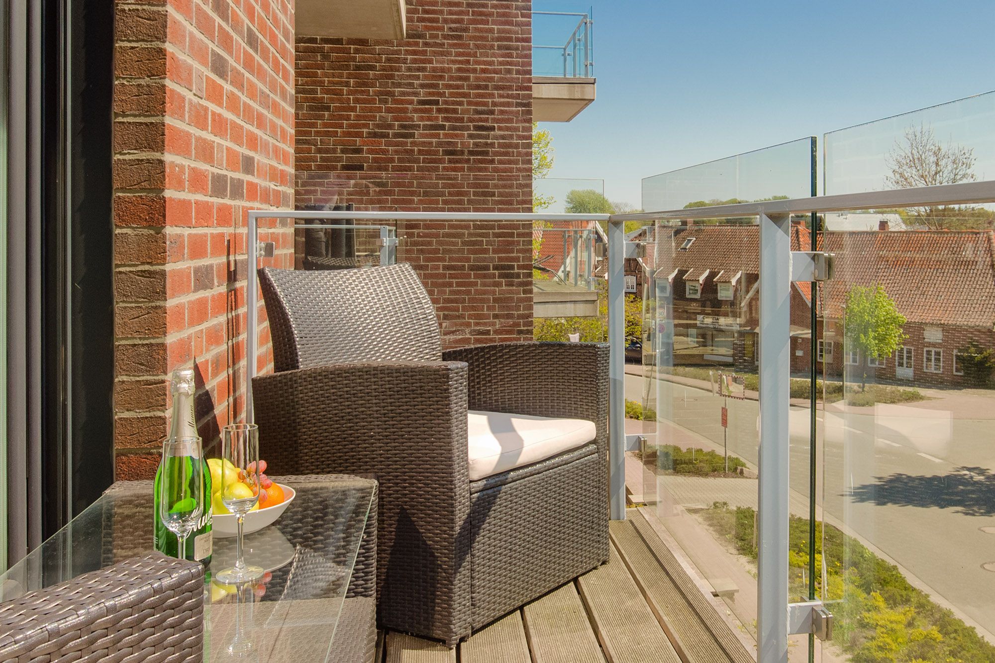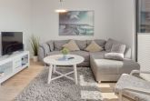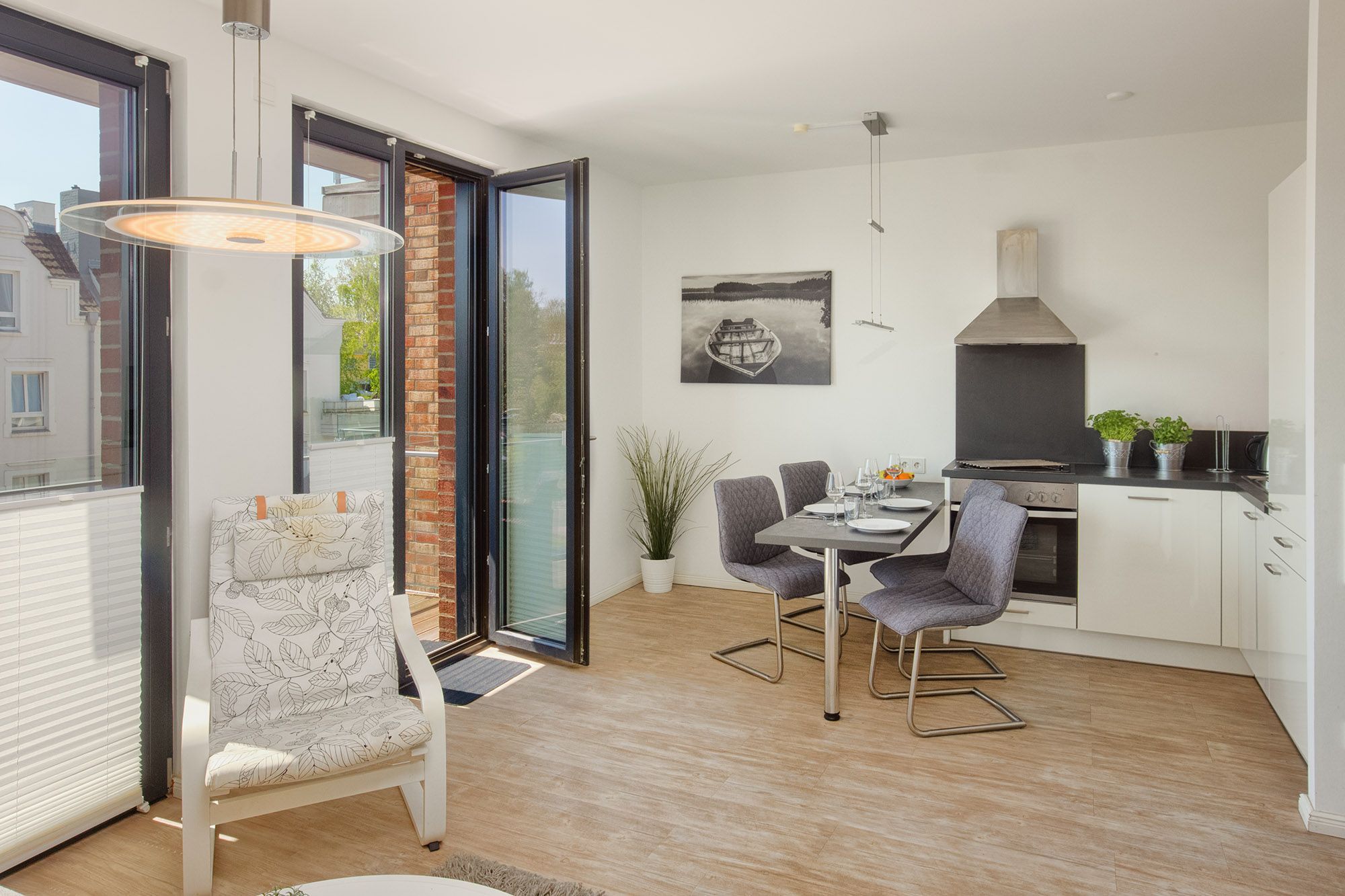 Der offene Wohnbereich lädt mit einer gemütlichen Couch und einem Schwingsessel zum Verweilen ein. Smart-TV, Musikanlage, DVD-Player und WLAN stehen zur Verfügung, sodass auch im Urlaub Serien oder Filme gestreamt werden können. Bodentiefe Fenster lassen viel Tageslicht herein und bieten direkten Zugang zum möblierten Süd-Balkon, auf dem sich die Sonne genießen oder das Treiben der Umgebung beobachten lässt. Für ein angenehmes Wohnklima sorgt die Fußbodenheizung in der gesamten Wohnung.
