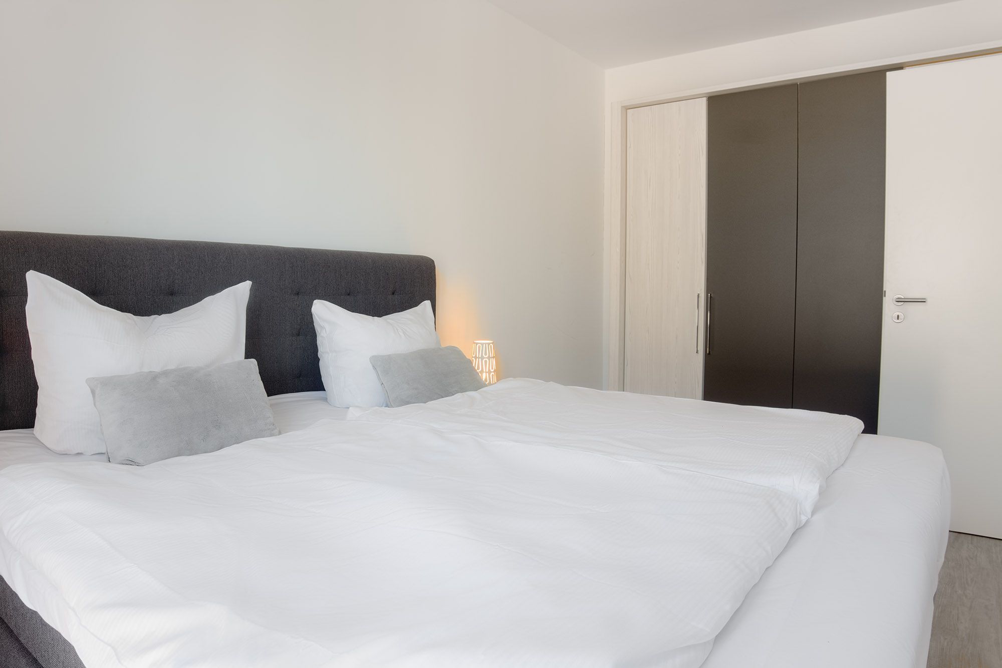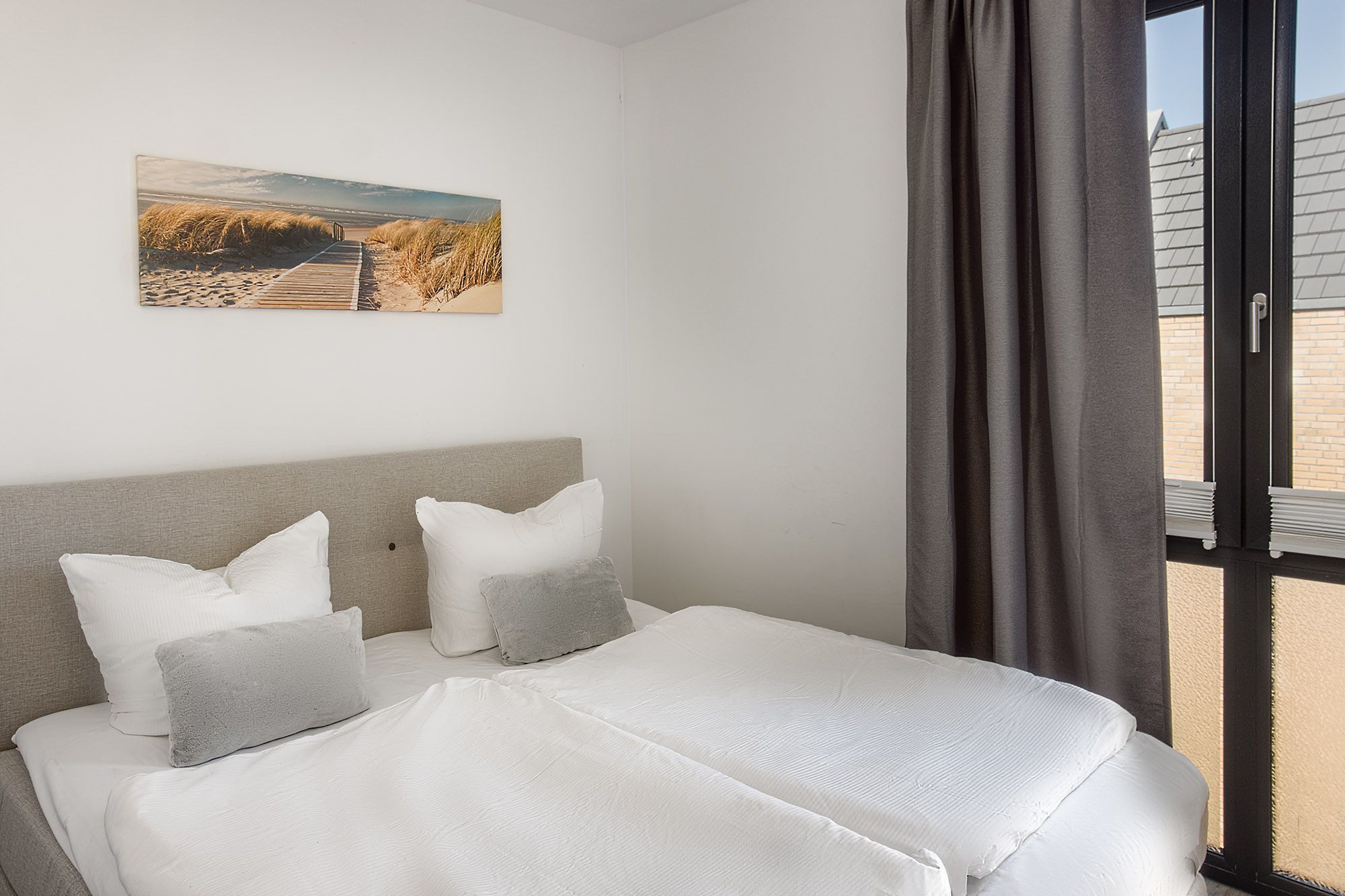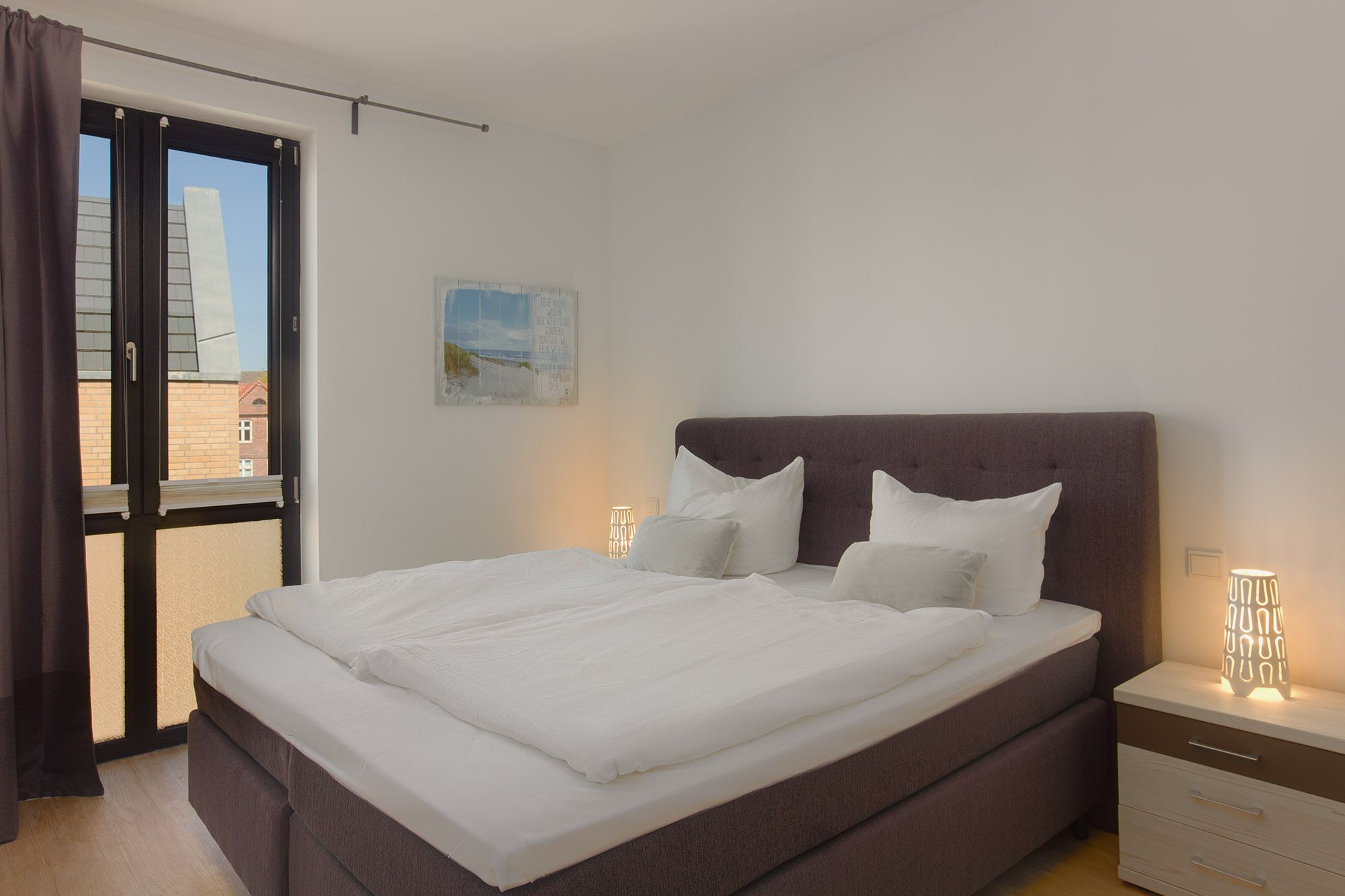 Die Ferienwohnung verfügt über zwei Schlafzimmer mit komfortablen Boxspring-Doppelbetten. Ein Schlafzimmer ist zusätzlich mit einem TV ausgestattet, sodass jeder ungestört seine Lieblingssendung genießen kann. Blickdichte Vorhänge, Plissees und elektrische Außenrollos sorgen für eine angenehme Verdunkelung und erholsame Nächte. Allergikerfreundliche Bettwäsche und Handtuchsets können gegen eine Gebühr geliehen werden. Ein Babyreisebett (ohne 5 cm Matratze) sowie ein Hochstuhl sind ebenfalls vorhanden.