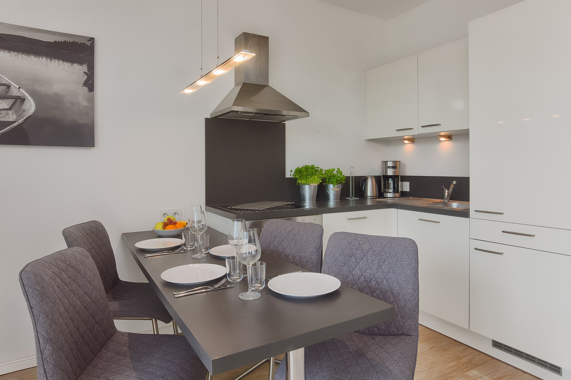 Die offene, voll ausgestattete Küche mit Geschirrspüler bietet alle Annehmlichkeiten für Selbstversorger. Direkt angrenzend befindet sich der Essbereich, der zum gemeinsamen Genießen der Mahlzeiten einlädt.