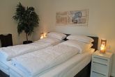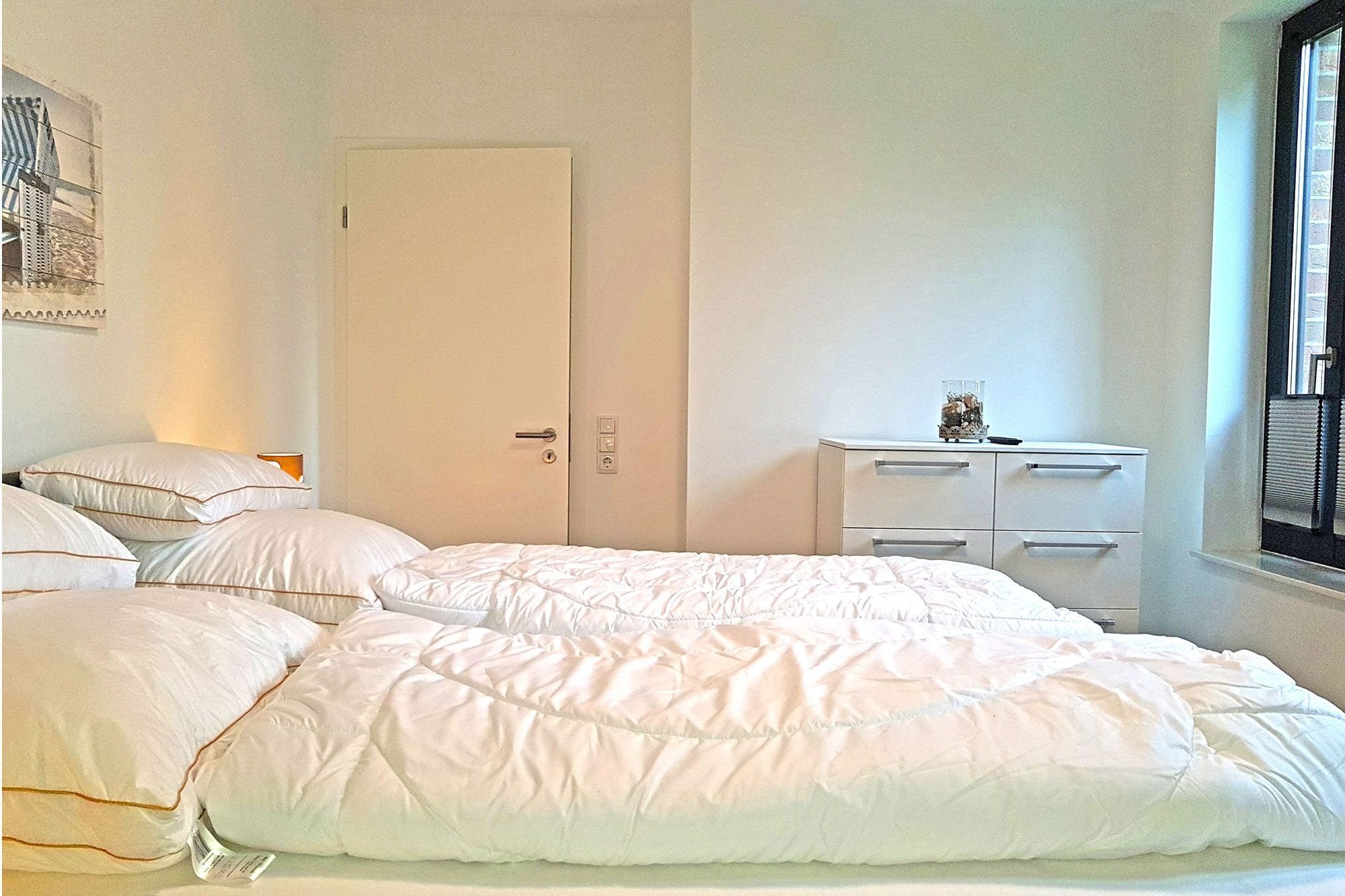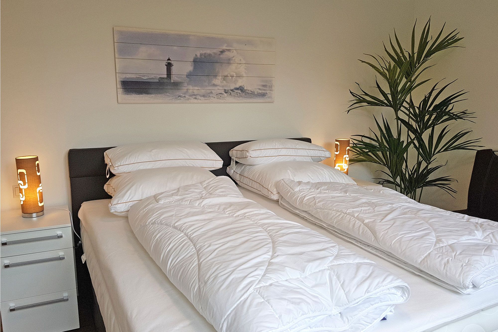Die Ferienwohnung ist ideal für kleine Familien oder Paare, da sie über zwei Schlafzimmer mit komfortablen Doppelboxspringbetten verfügt. Allergiker-geeignete Bettwäsche und Handtuchsets können gegen Gebühr geliehen werden. Ein Baby-Reisebett und ein Hochstuhl gehören ebenfalls zur Ausstattung. Für angenehme Verdunklung und erholsame Nächte sorgen Vorhänge und Plissees.