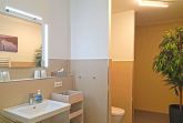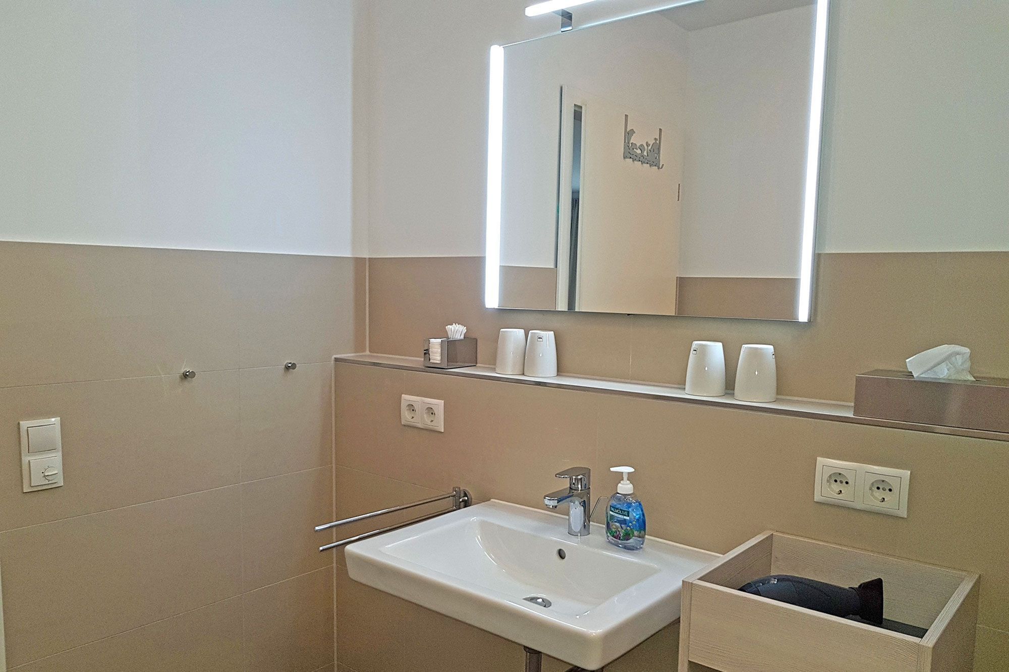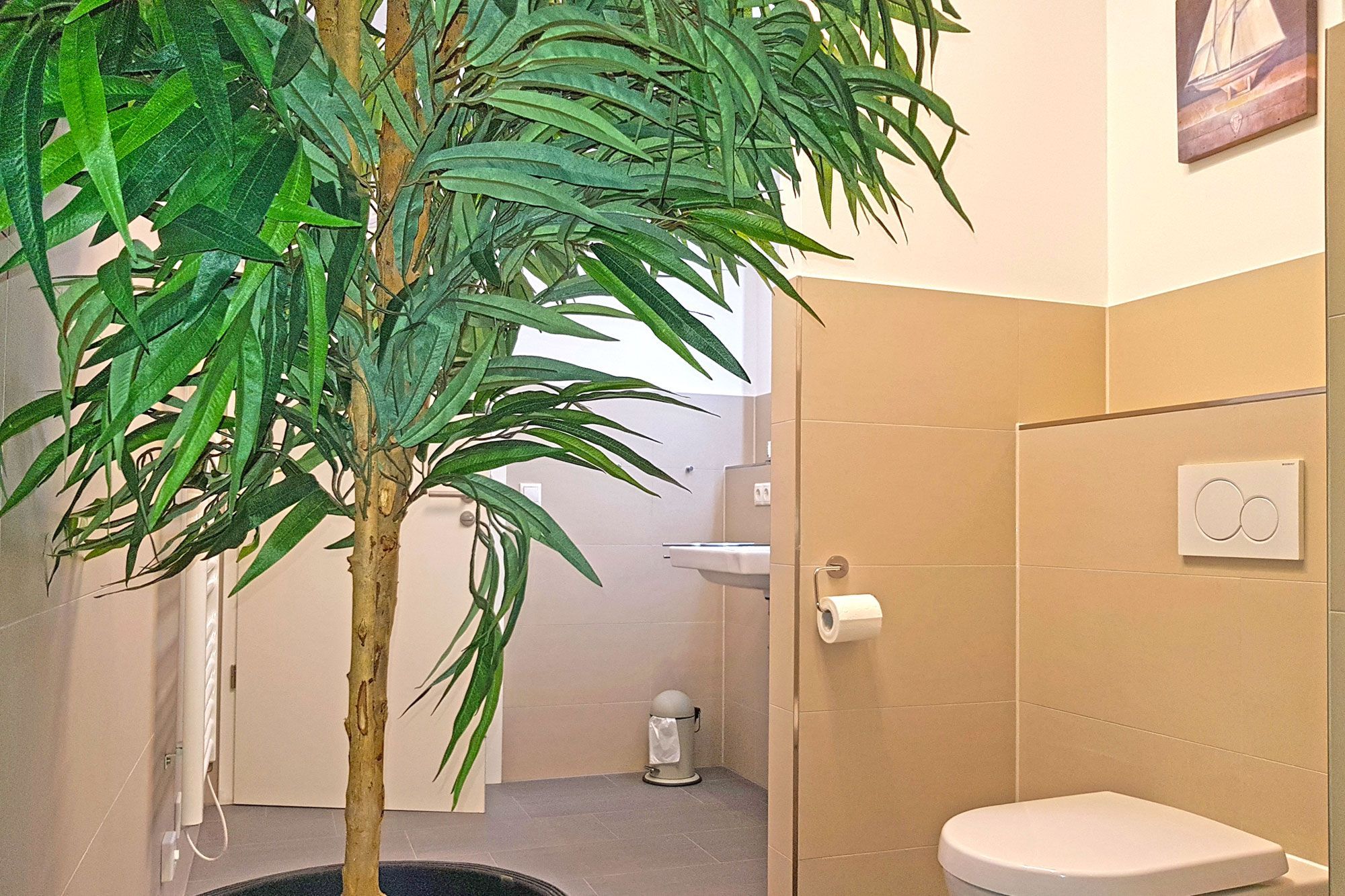 Das geräumige Badezimmer mit ebenerdiger Dusche, Handtuchwärmer, Föhn und WC bietet modernen Komfort. Ein kleiner Abstellraum mit Waschmaschine/Trockner, Staubsauger und weiteren nützlichen Haushaltsgeräten steht zur Verfügung.