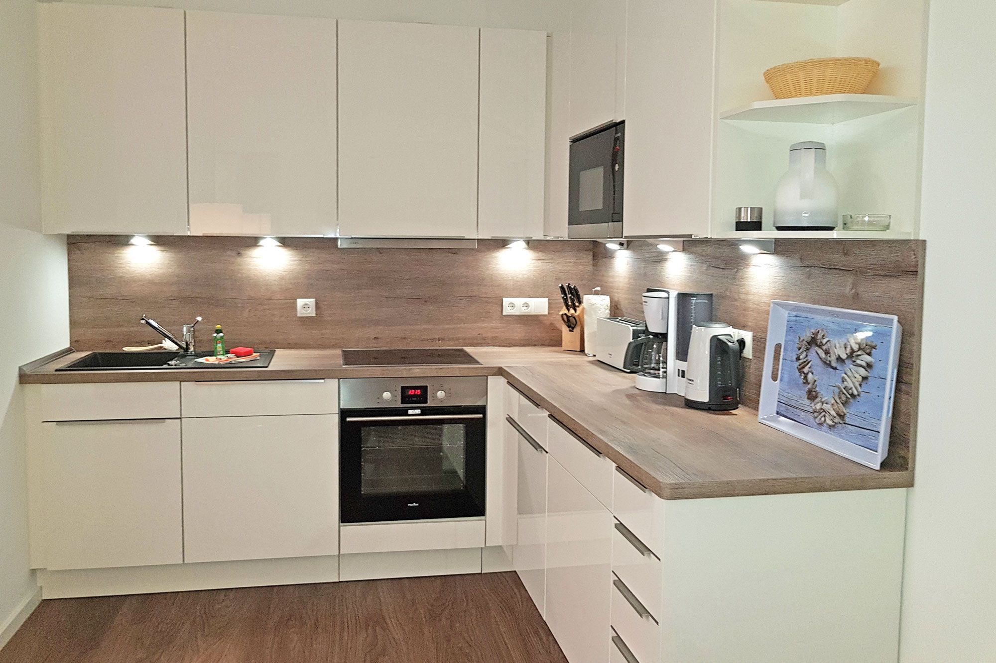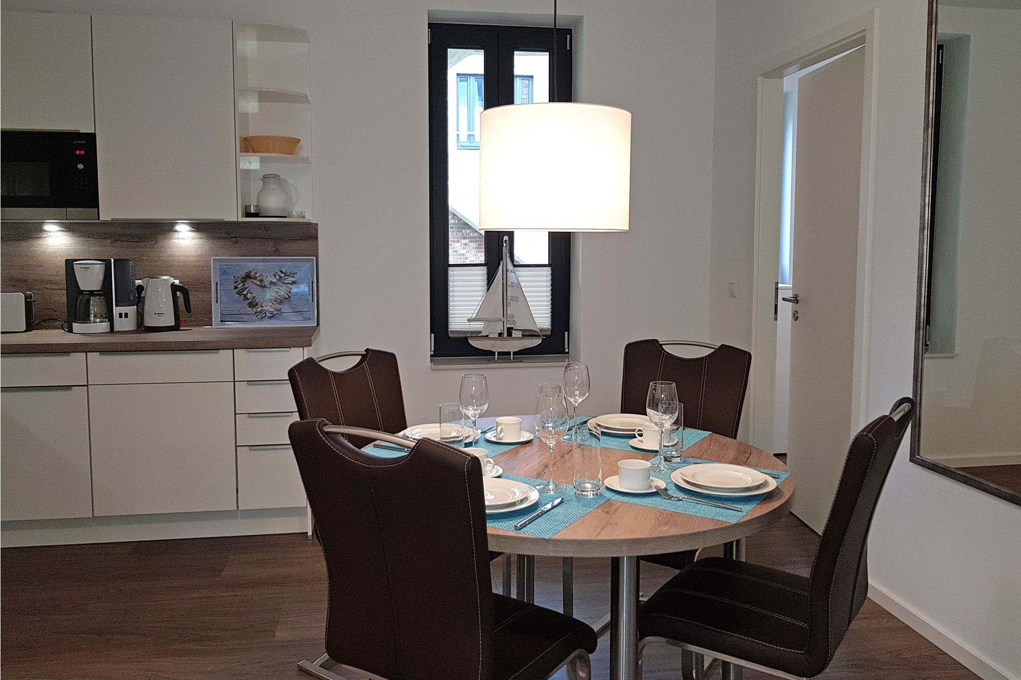Die offene, voll ausgestattete Küche mit angeschlossenem Essbereich lädt zum gemeinsamen Kochen und Genießen ein. Alternativ können Sie Ihre Mahlzeiten auf der Terrasse einnehmen und den Tag mit einem Glas Wein entspannt ausklingen lassen.