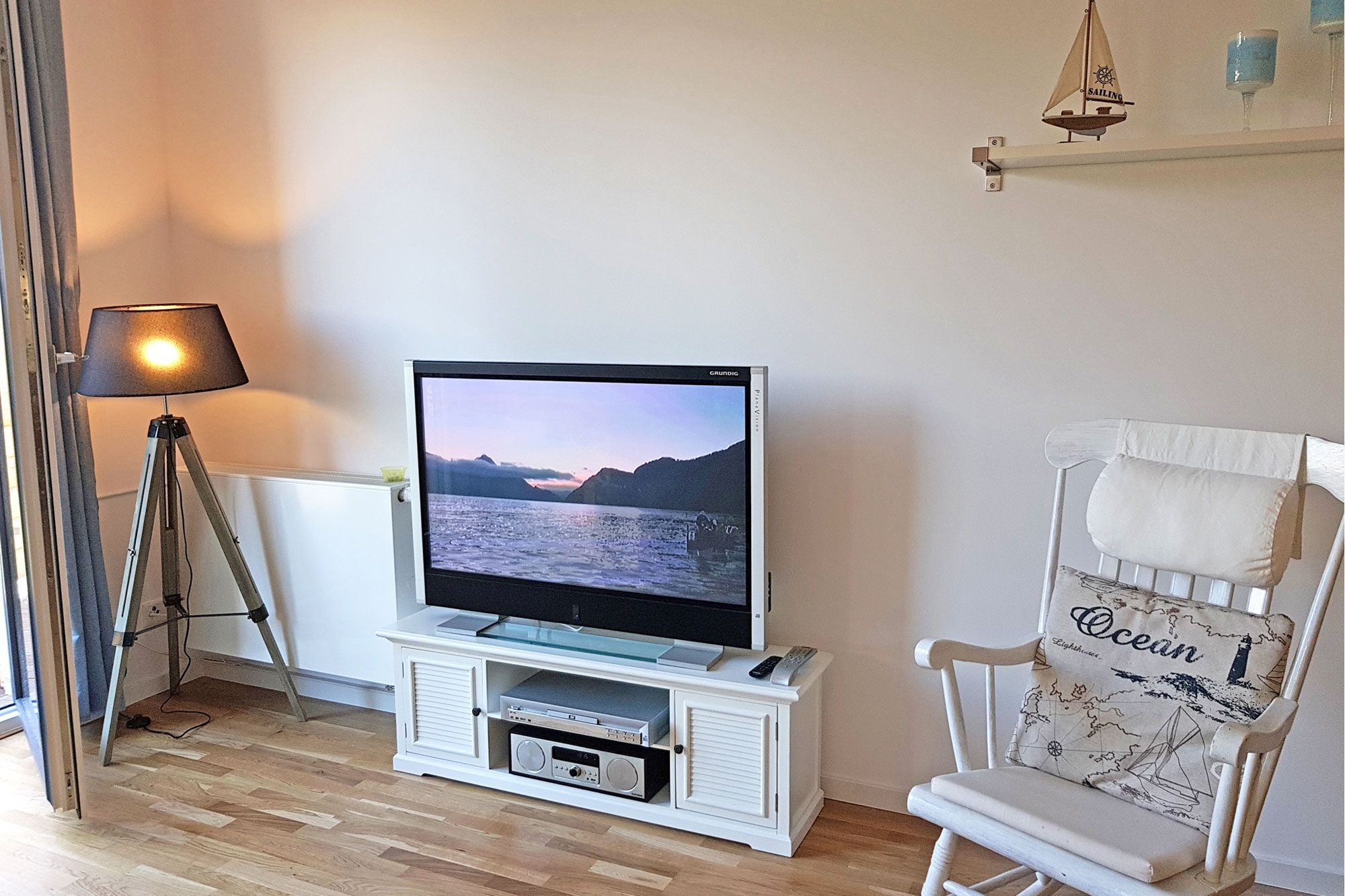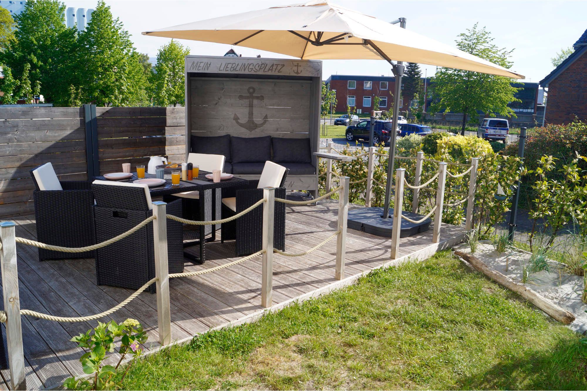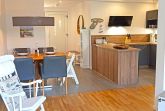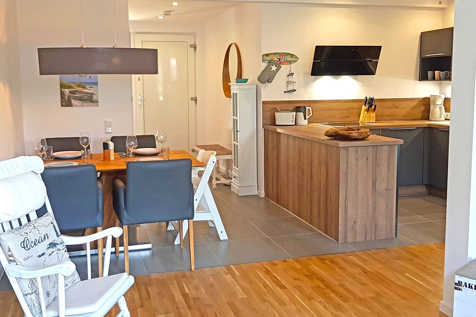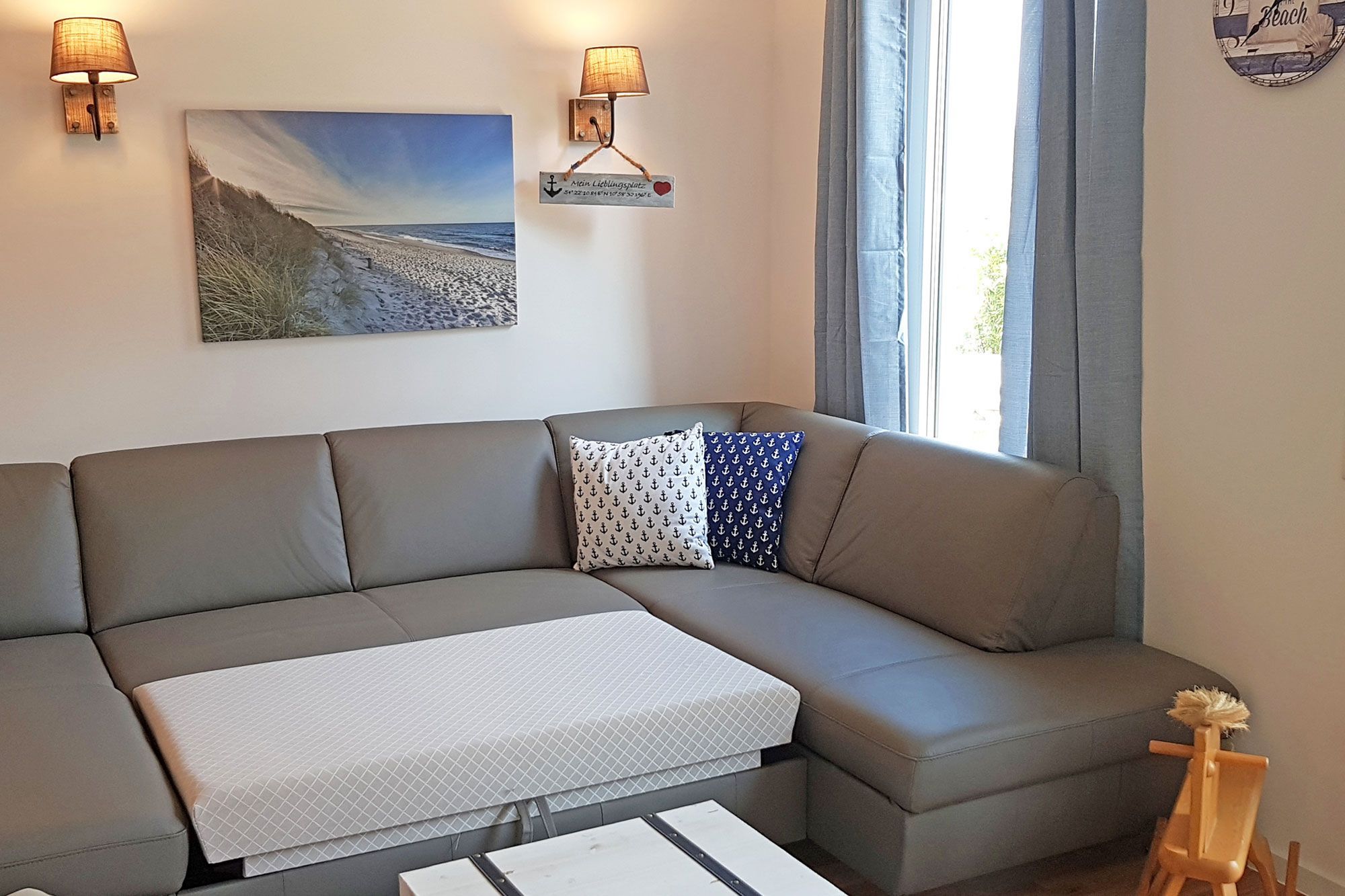 Der offene Wohnbereich lädt mit einer großen, bequemen Couch (Schlaffunktion), TV, DVD-Player, Radio (USB/Bluetooth) und WLAN zum Verweilen ein. Dank bodentiefer Fenster strömt viel Tageslicht in den Raum und gibt den Blick auf die möblierte Terrasse mit Strandkorb, Gasgrill, Sonnenschirm und Gartenbereich frei. Hier können Sie Ihre Mahlzeiten im Freien genießen und den Tag entspannt mit einem Glas Wein in der Abendsonne ausklingen lassen. Alternativ steht Ihnen die offene, voll ausgestattete Küche mit angrenzendem Essbereich zur Verfügung perfekt für kulinarische Genussmomente.