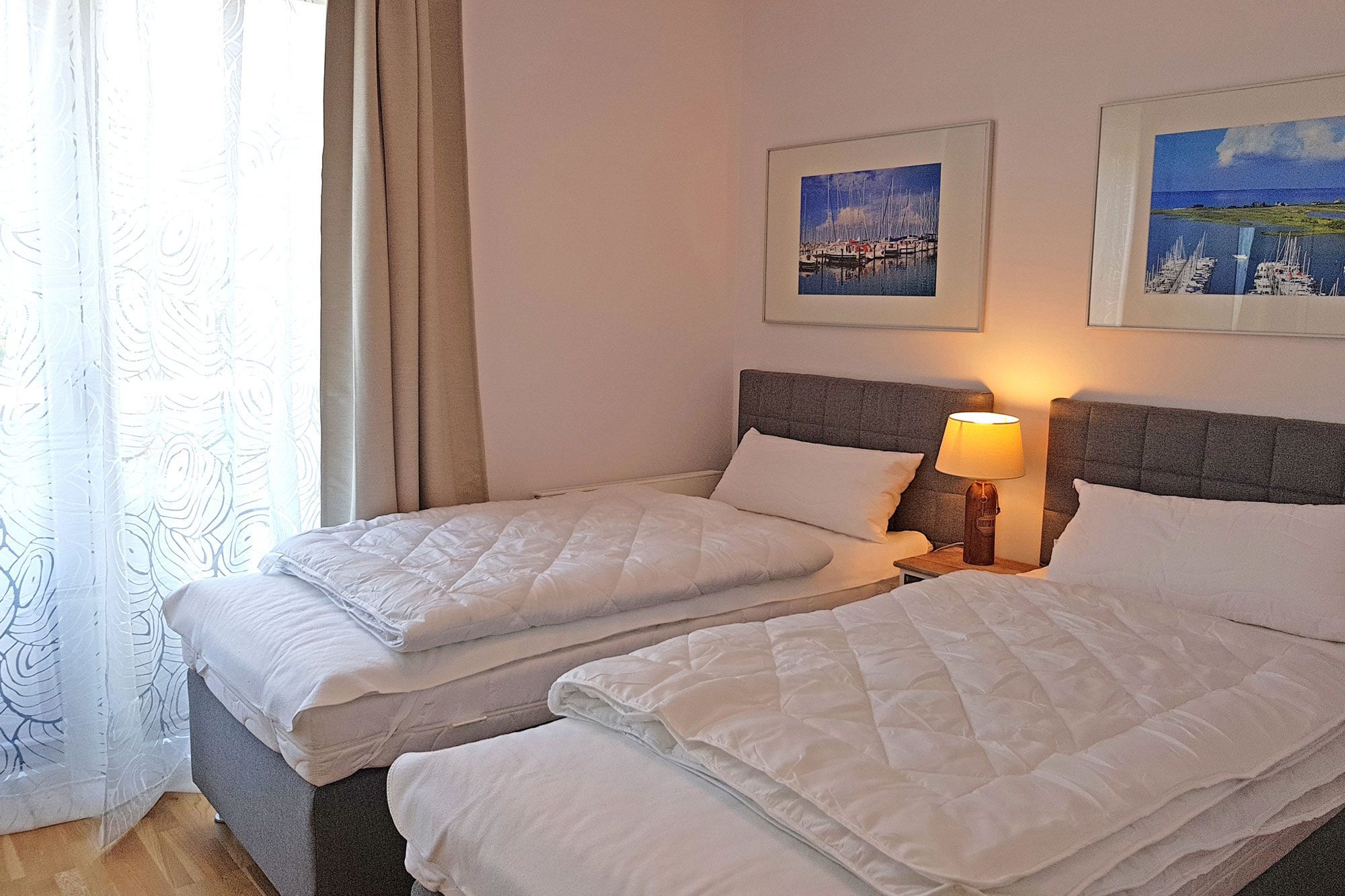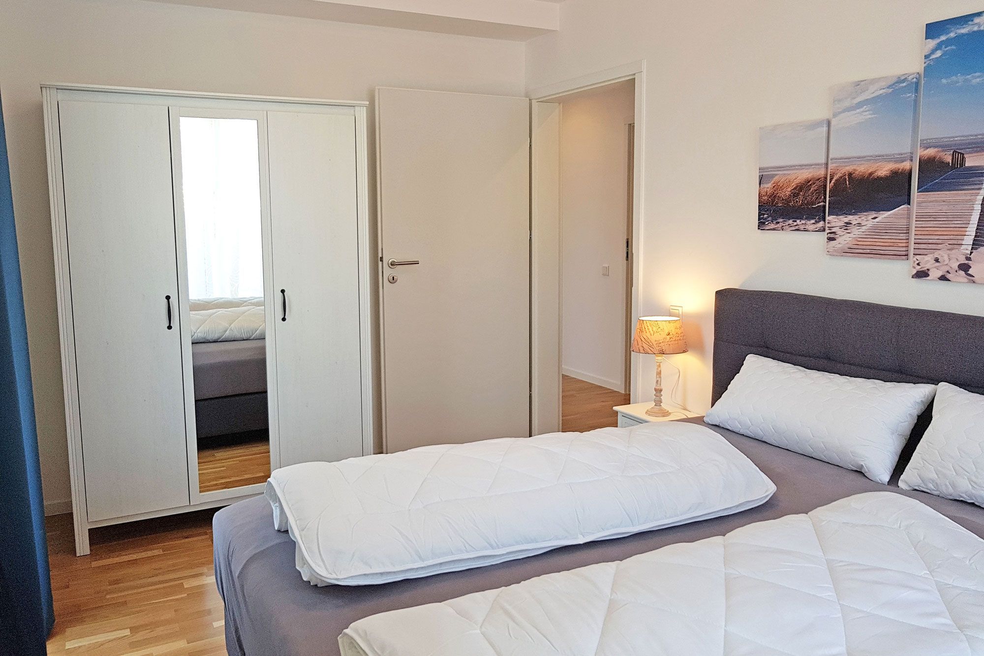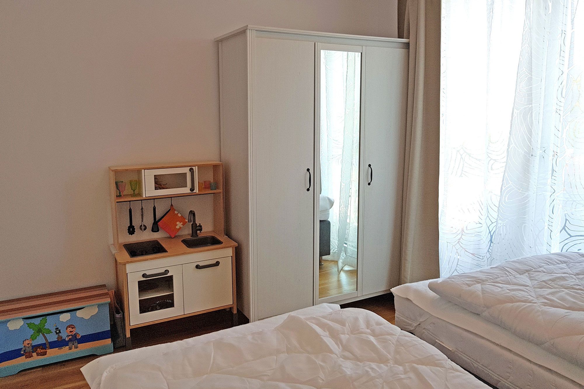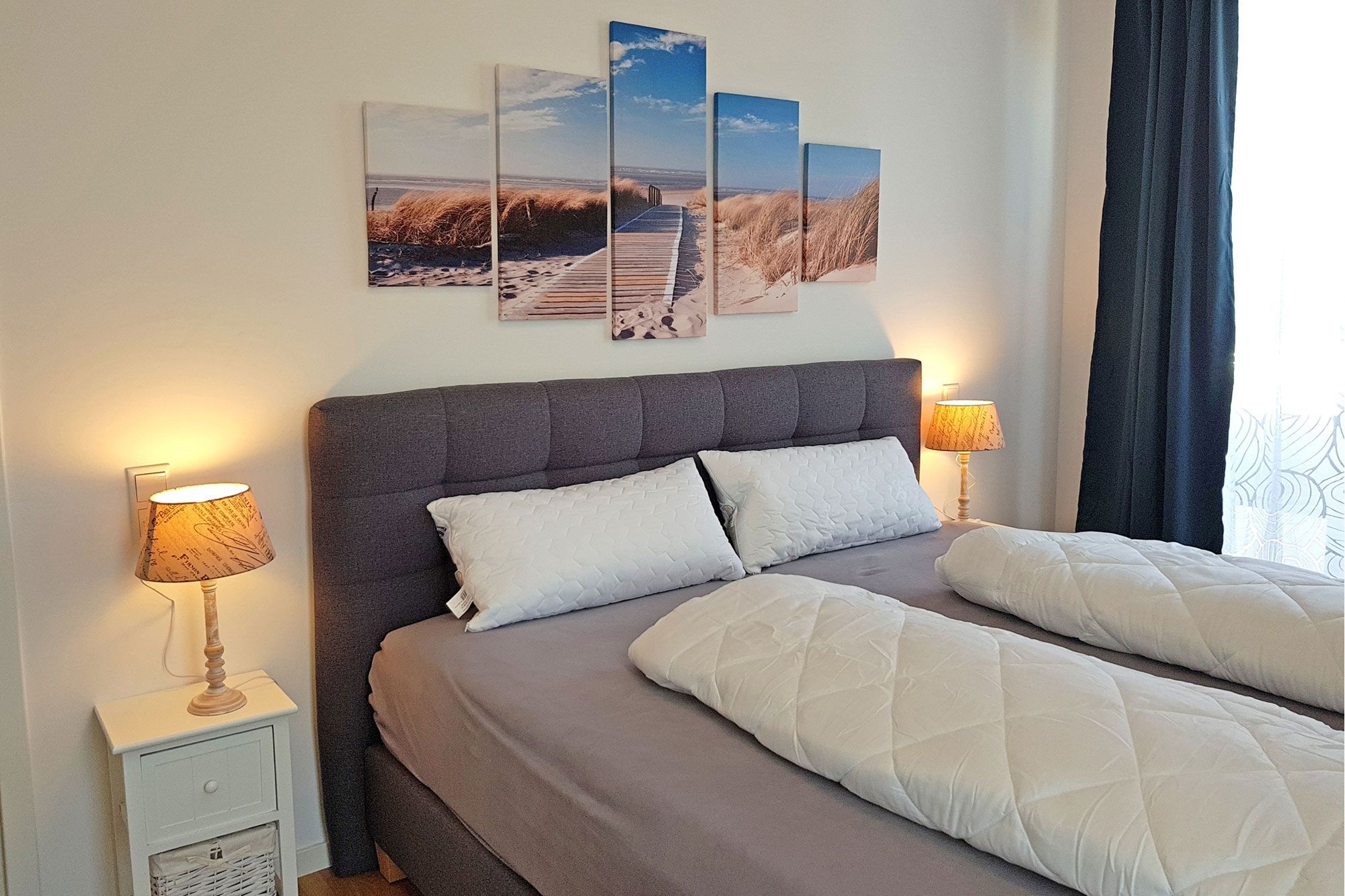 Die Wohnung ist besonders familienfreundlich gestaltet. Zwei Schlafzimmer bieten erholsamen Schlaf: Eines mit einem komfortablen Doppel-Boxspringbett, das andere mit zwei Einzel-Boxspringbetten. Ein Baby-Reisebett und ein Hochstuhl gehören ebenfalls zur Ausstattung. Verdunkelungsvorhänge sorgen für eine angenehme Nachtruhe. Da es sich um eine haustierfreie Nichtraucherwohnung handelt, ist sie auch für Allergiker geeignet. Bettwäsche und Handtuchsets können bei Bedarf gegen Gebühr geliehen werden.