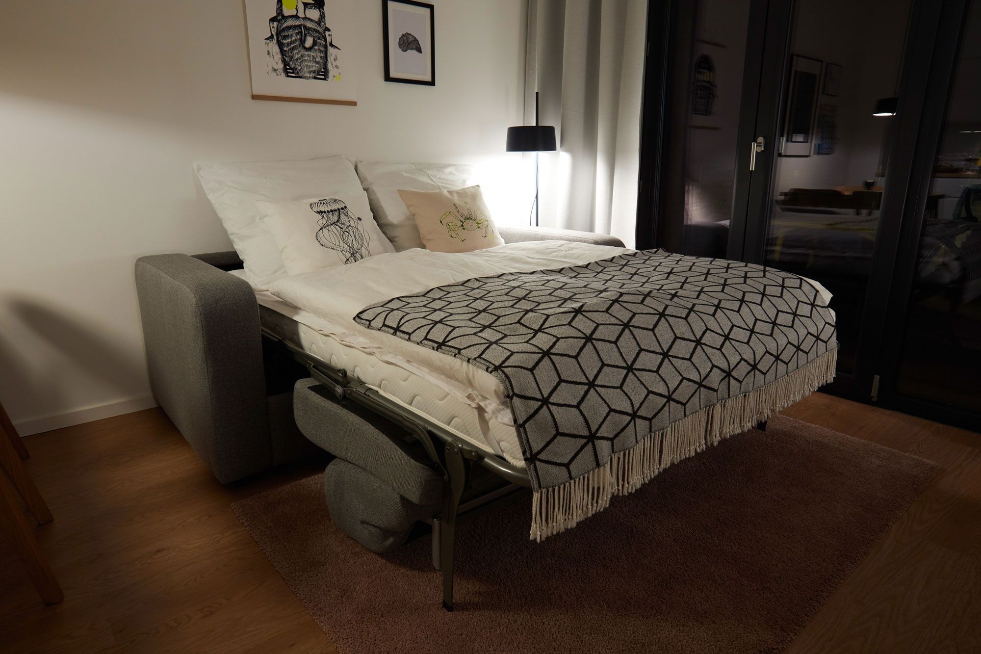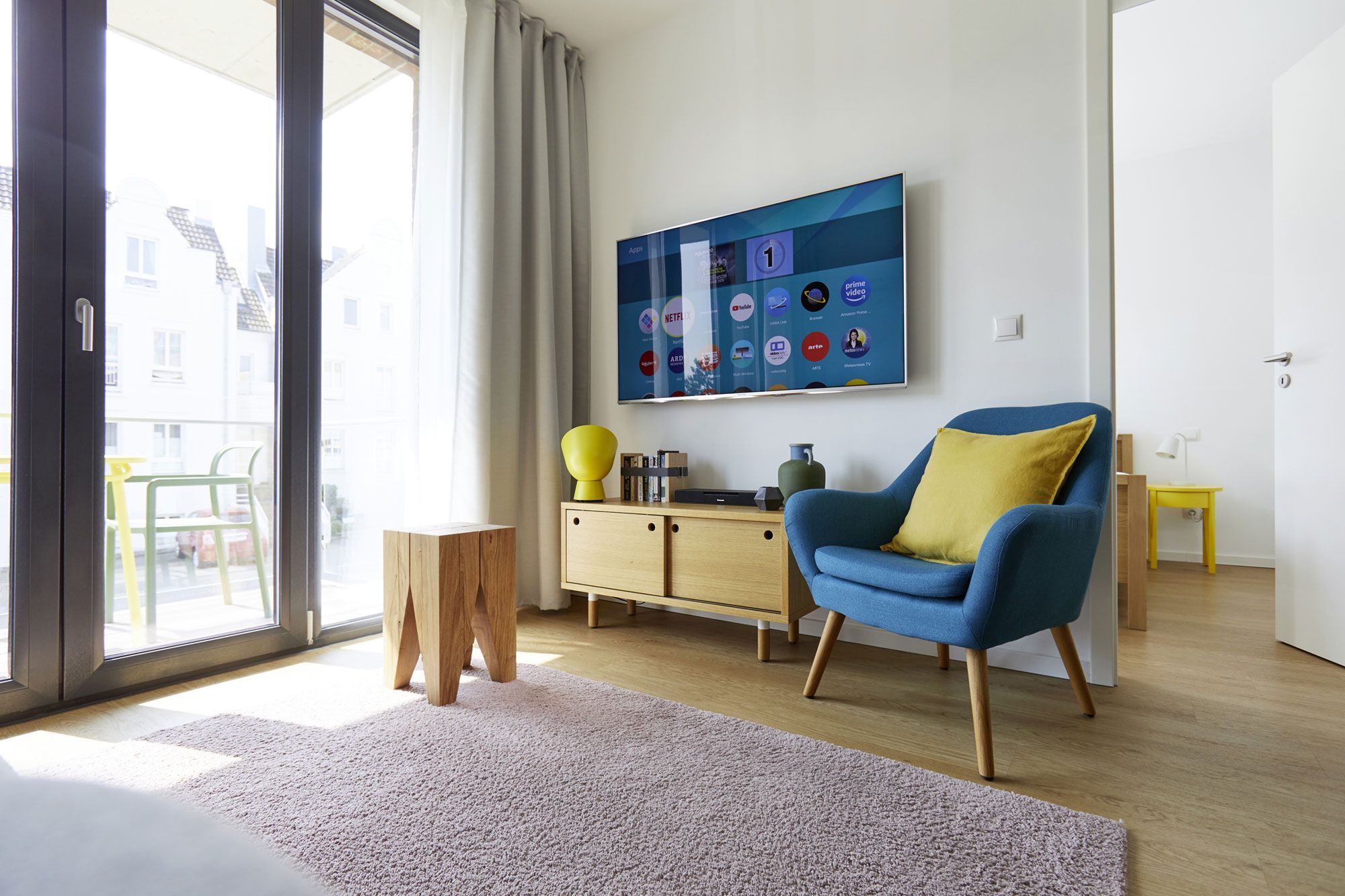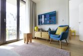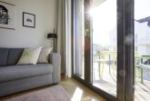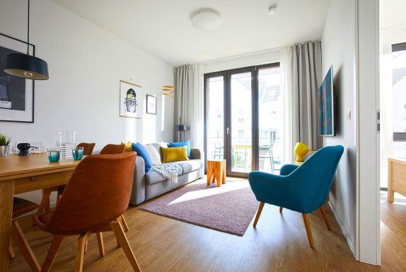 Der geschmackvoll gestaltete Wohnbereich lädt mit einer gemütlichen Couch (mit Schlaffunktion für eine dritte und vierte Person) und einem bequemen Sessel zum Entspannen ein. Zur Unterhaltung stehen Smart-TV, Blu-Ray-Player, Musikanlage und WLAN zur Verfügung, sodass Sie auch im Urlaub Ihre Lieblingsserien oder Filme streamen können. Dank der bodentiefen Fenster ist der Raum lichtdurchflutet und bietet direkten Zugang zum möblierten Süd-Balkon, auf dem Sie die Sonne genießen oder das Treiben in der Umgebung beobachten können. Die gesamte Wohnung ist mit Fußbodenheizung ausgestattet, sodass Sie sich auch an kühleren Tagen rundum wohlfühlen.