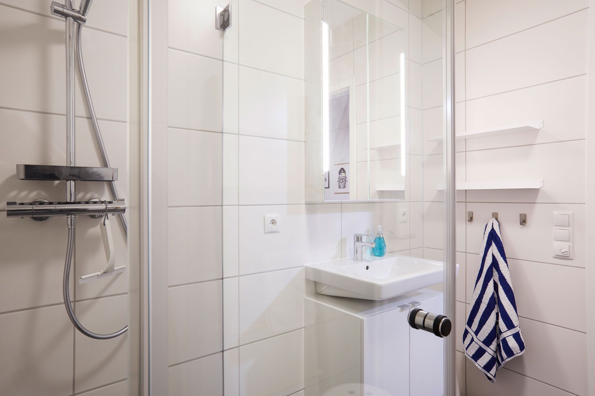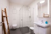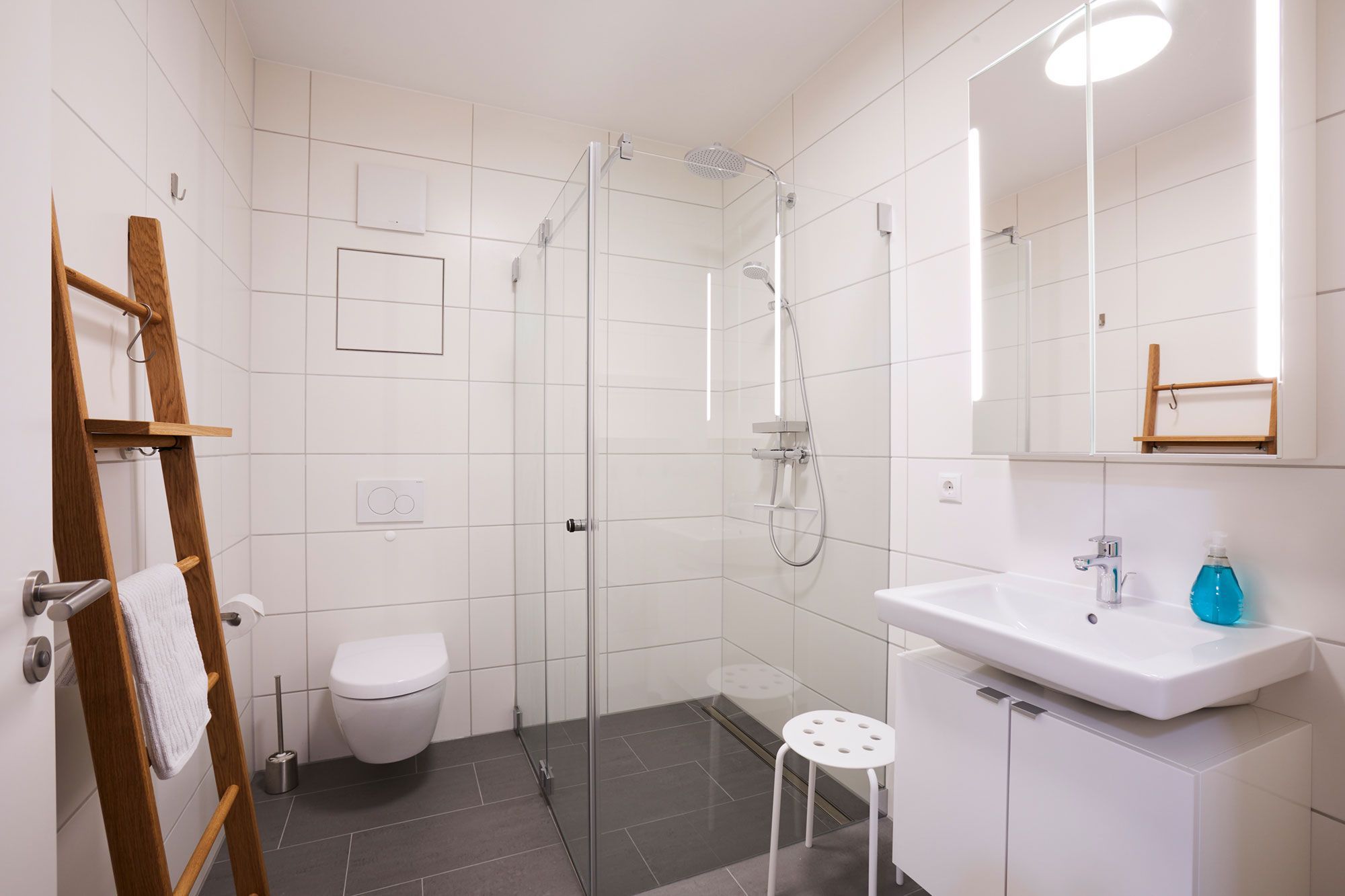 Das moderne Badezimmer ist mit einer großzügigen, ebenerdigen Rainshower-Dusche, einem Waschbecken und einem WC ausgestattet. Nach einem erlebnisreichen Tag an der Ostsee können Sie sich hier wunderbar erfrischen und entspannen.