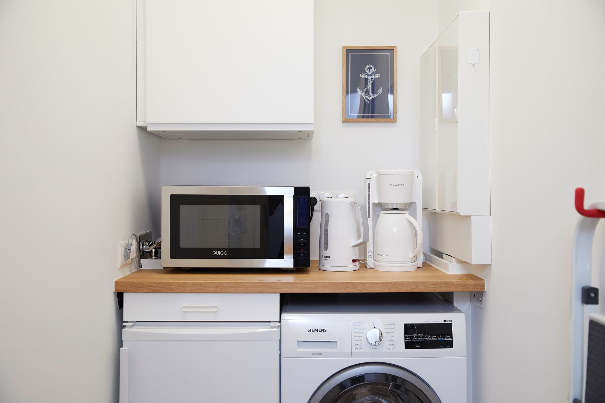 Die Ferienwohnung bietet eine praktische Back-Kitchen mit Kühlschrank, Grill-Mikrowelle, Waschtrockner und Staubsauger, die gleichzeitig den Übergang zum offenen Küchenbereich bildet. Dieser ist mit einem Geschirrspüler, Induktionsherd und einem Minigrill für den Balkon bestens ausgestattet, sodass auch im Urlaub für kulinarischen Genuss gesorgt ist. Der angrenzende Essbereich lädt zu gemeinsamen Mahlzeiten und geselligen Abenden ein.