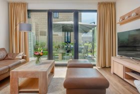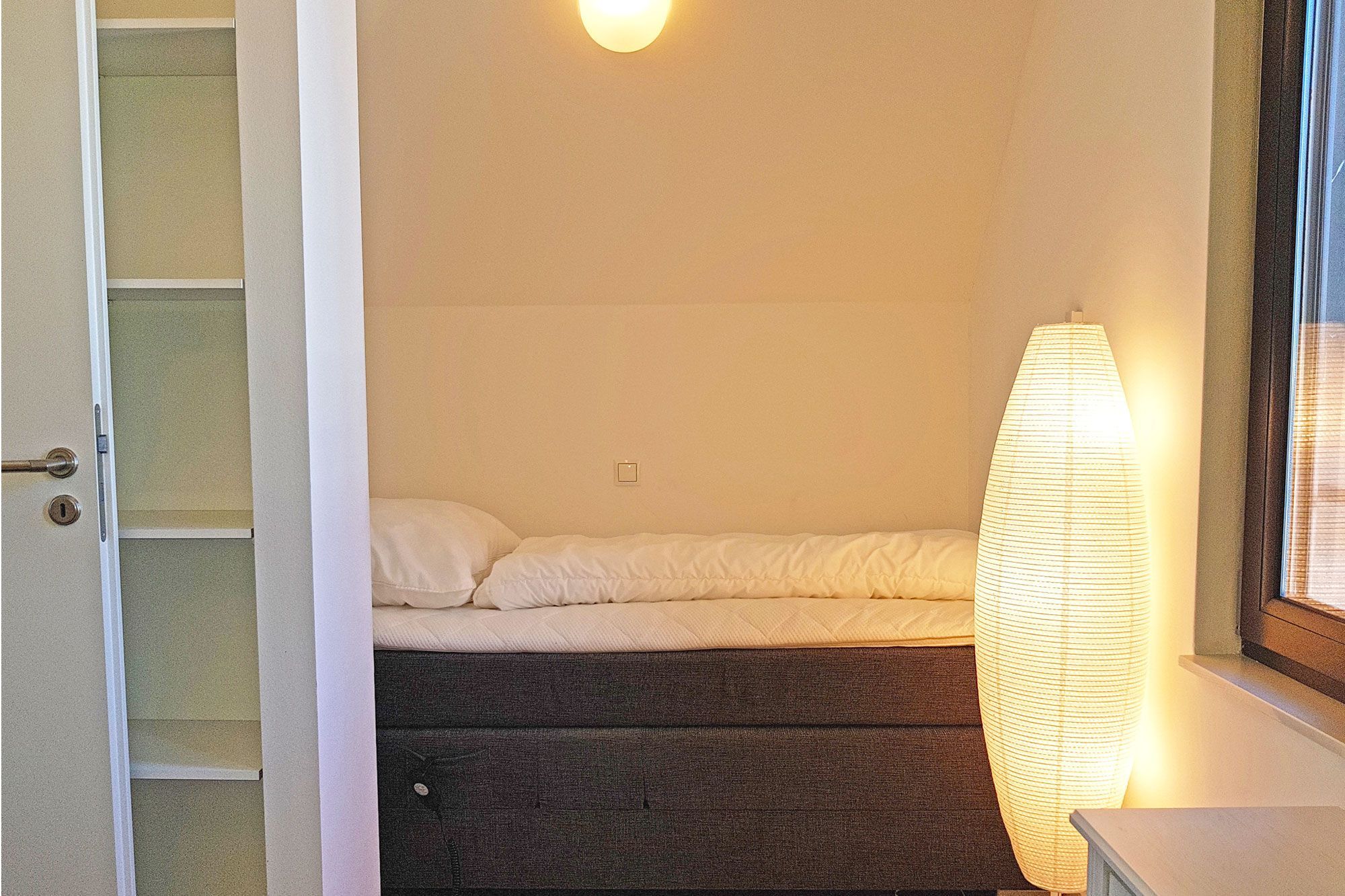 Die Schlafräume sind so gestaltet, dass sie Komfort bieten. Im ersten Obergeschoss erwartet Sie ein gemütliches Schlafzimmer mit einem Doppel-Boxspringbett. Das Dachgeschoss verfügt über ein weiteres Schlafzimmer mit Doppel-Boxspringbett sowie ein zusätzliches Zimmer mit zwei einzelnen Boxspringbetten. Besonders praktisch: Alle Betten sind elektrisch verstellbar und ermöglichen somit eine individuelle Liegeposition für erholsamen Schlaf. Für Kleinkinder stehen Babyreisebetten (gegen Gebühr) sowie ein Hochstuhl bereit. Bodentiefe Fensterfronten sorgen für eine freundliche und helle Atmosphäre, während Verdunklungsvorhänge und Rollos für erholsame Nächte und Privatsphäre sorgen.