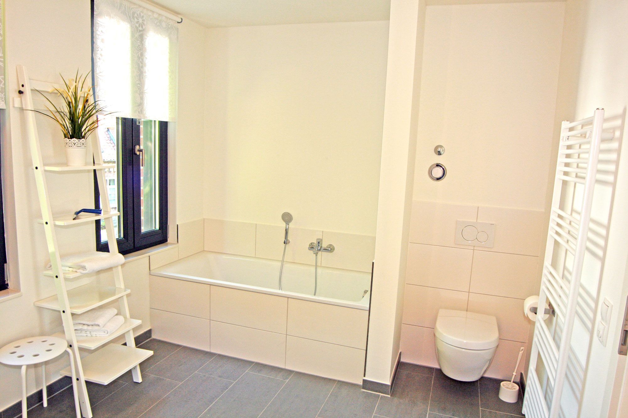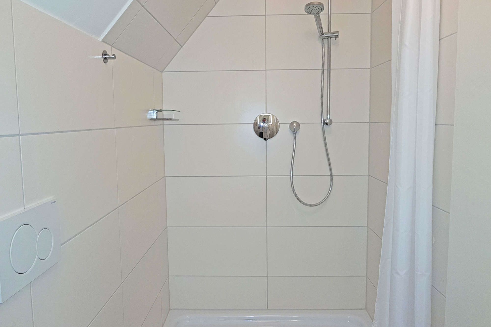 Die zwei Badezimmer in den oberen Etagen sind modern ausgestattet. Nach einem erlebnisreichen Tag können Sie im großzügigen Hauptbad mit Sauna (gegen Gebühr), Badewanne oder ebenerdiger Dusche entspannen. Das zweite Badezimmer im Dachgeschoss verfügt über eine Dusche und bietet somit zusätzlichen Raum für die tägliche Pflege. Handtuchwärmer und WC sind in beiden Bädern vorhanden. Im Erdgeschoss sorgt ein zusätzliches Gäste-WC für weiteren Komfort. Das gesamte Haus wird beim Warmwasser über Durchlauferhitzer versorgt.
