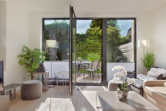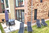 Auf der voll möblierten Terrasse in Süd-West-Ausrichtung genießen Sie sonnige Stunden und laue Abende. Sonnenliegen, ein Sonnenschirm und ein Gasgrill stehen bereit, sodass entspannten Grillabenden im Garten nichts im Wege steht.