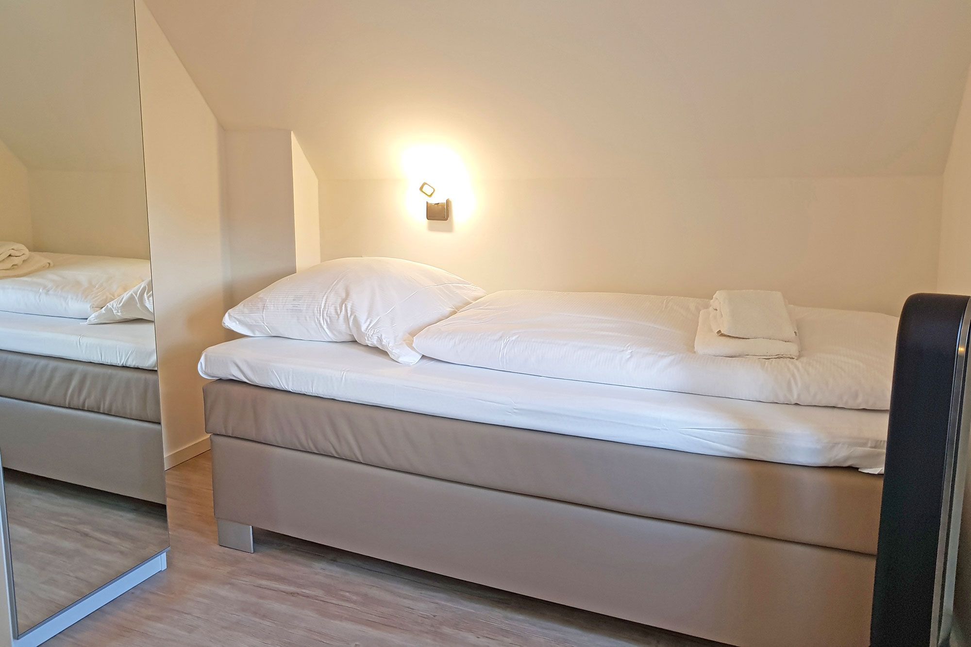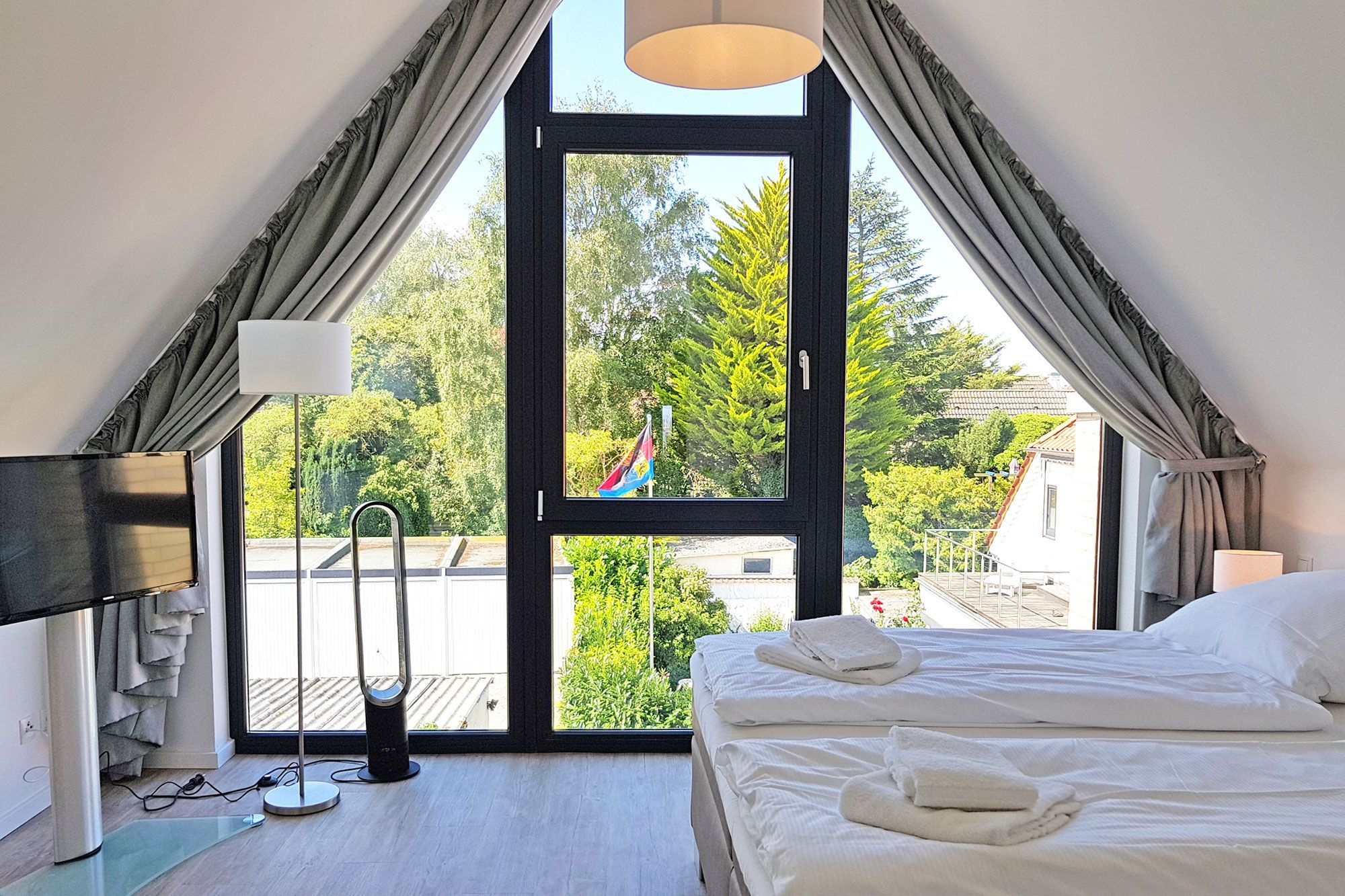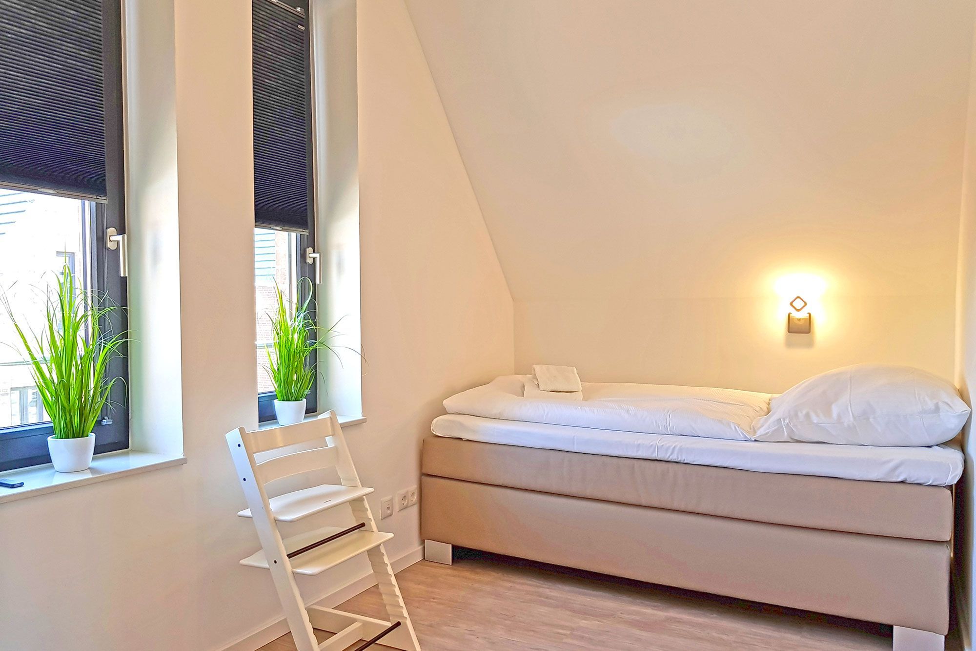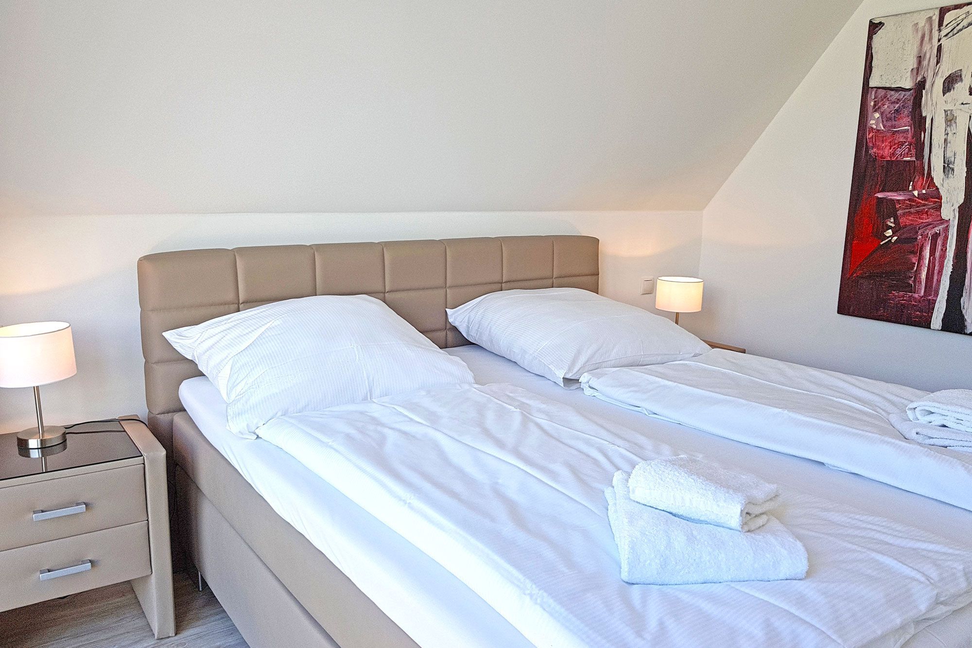 Die Ostsee Perle 35 eignet sich ideal für Familien und kleine Gruppen, denn das Haus verfügt über drei komfortable Schlafzimmer mit hochwertigen Boxspringbetten. Im ersten Obergeschoss befindet sich ein großzügiges Doppelboxspringbett mit eigenem TV, während das Dachgeschoss weitere Schlafmöglichkeiten bietet ein Doppelboxspringbett mit TV sowie zwei Einzelbetten in getrennten Räumen. Für die Kleinsten stehen ein Baby-Reisebett und ein Hochstuhl bereit. Große Fensterfronten sorgen in allen Schlafzimmern für lichtdurchflutete Räume und eine angenehme Atmosphäre. Vorhänge und Plissees garantieren eine verdunkelte Umgebung für erholsame Nächte.
