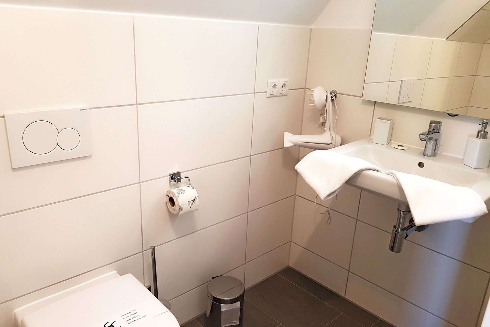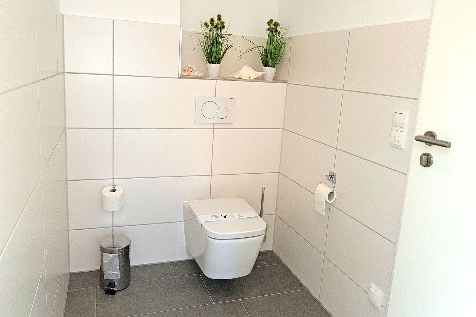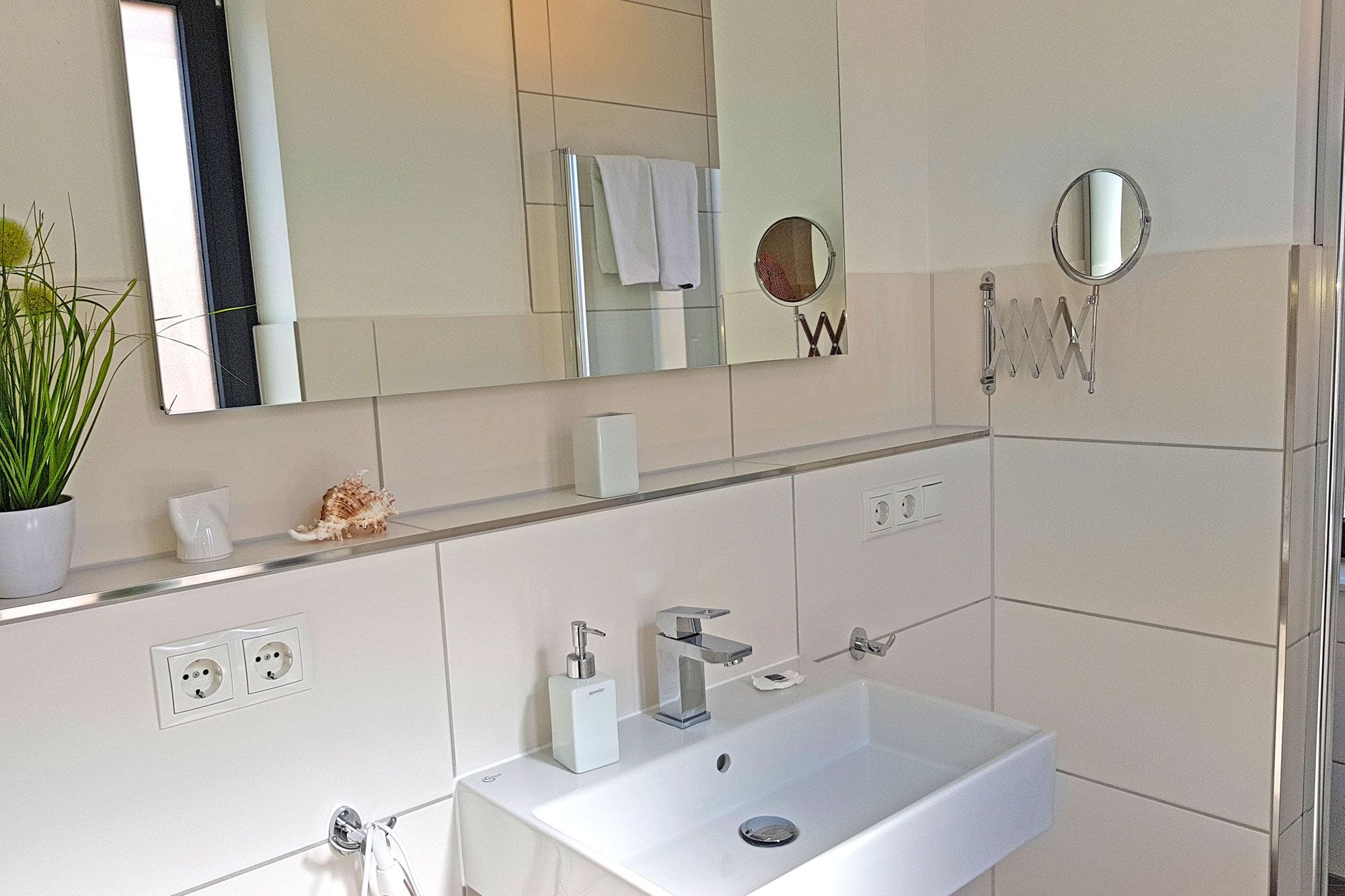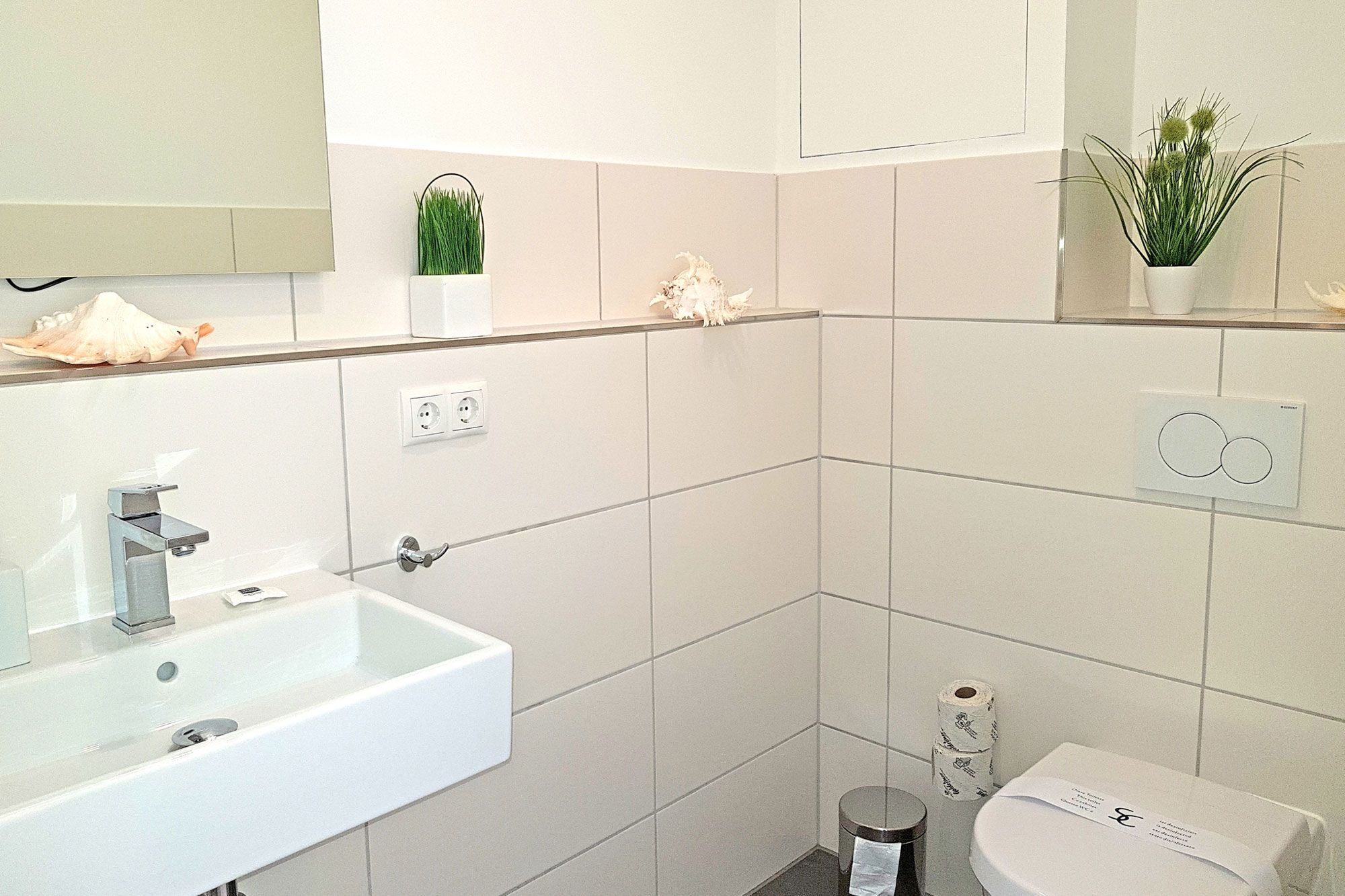 Die drei Bäder des Hauses eines auf jeder Etage sind komfortabel ausgestattet. Zwei davon verfügen über eine Dusche, während das Highlight des großen Badezimmers die integrierte Sauna ist perfekt, um nach einem erlebnisreichen Tag an der Ostsee zu entspannen. Handtuchwärmer und WC sind selbstverständlich vorhanden. Ein zusätzliches Gäste-WC im Erdgeschoss bietet weiteren Komfort.