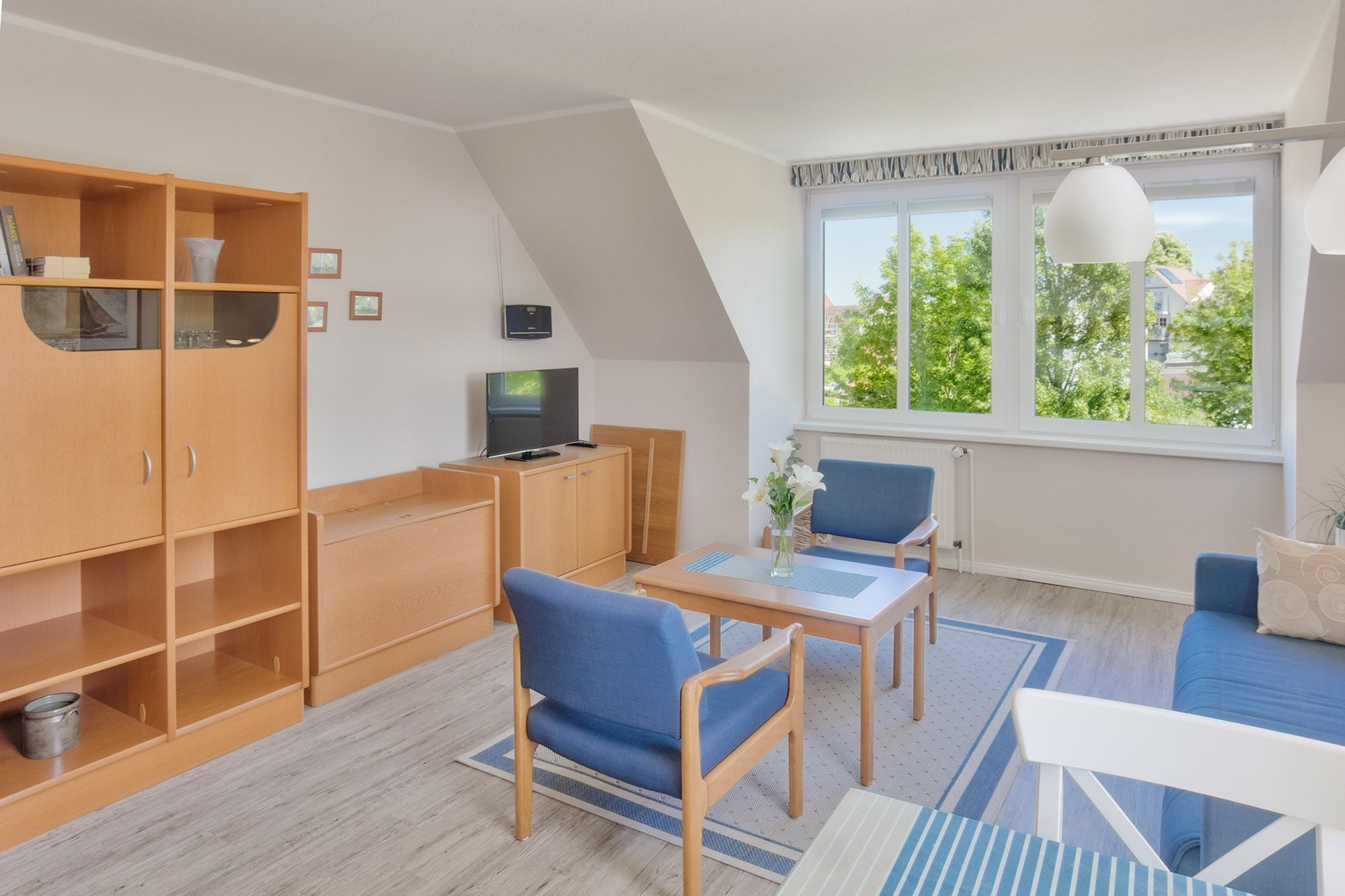 Das Apartment 13 im zweiten Obergeschoss bietet auf etwa 55 Quadratmetern ausreichend Platz für bis zu fünf Personen. Das Schlafzimmer ist mit einem Doppelbett und einem großen Kleiderschrank ausgestattet. Im Wohnbereich sorgen eine großzügige Schlafcouch für zwei Personen sowie eine weitere einzelne Schlafcouch für erholsame Nächte.