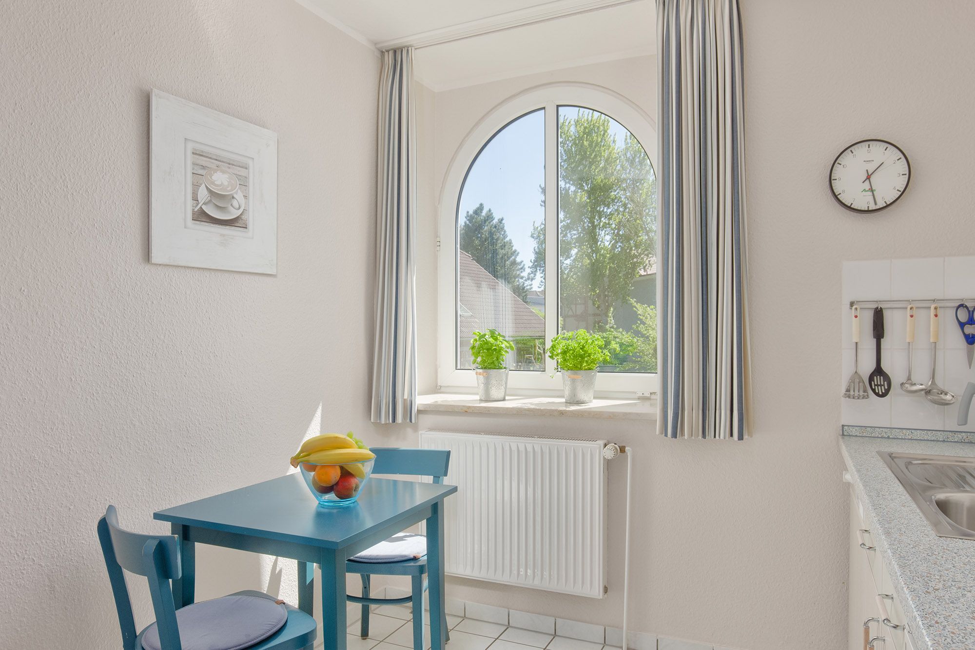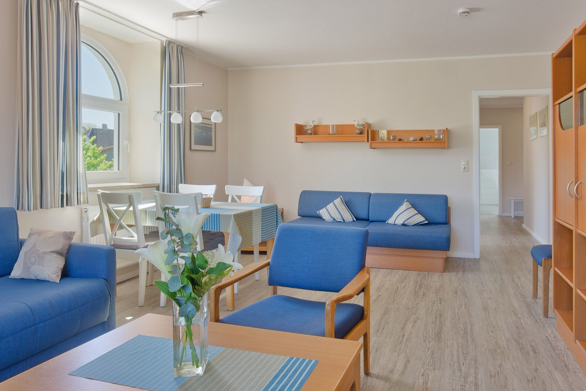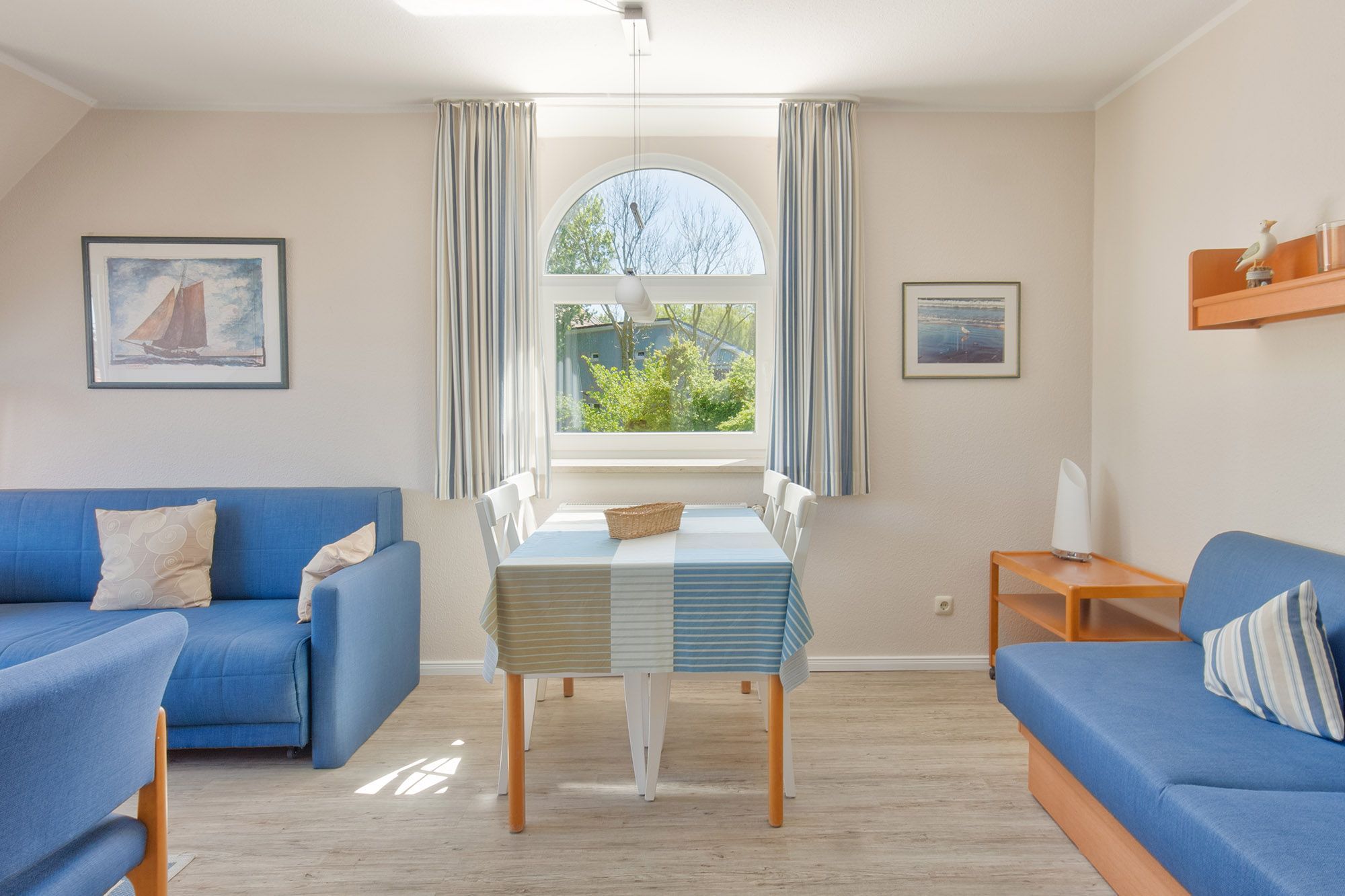 Zur Unterhaltung stehen ein Sat-TV, ein CD-Player und ein WLAN-Hotspot zur Verfügung. Die offene, voll ausgestattete Küche mit Geschirrspüler lässt keine Wünsche offen und bietet viel Raum für kulinarische Entfaltung. Ein kleiner Essbereich befindet sich direkt in der Küche, während im Wohnzimmer eine größere Essecke für gesellige Runden bereitsteht.