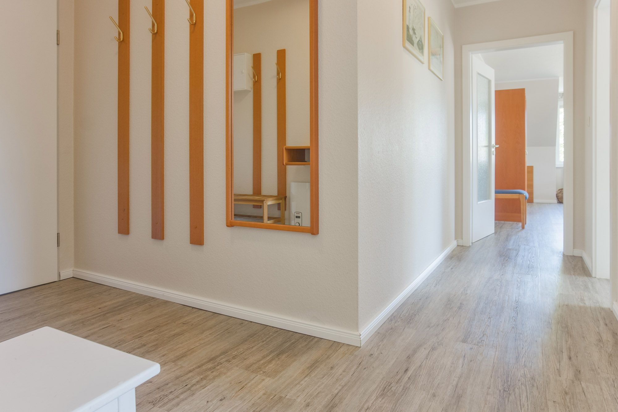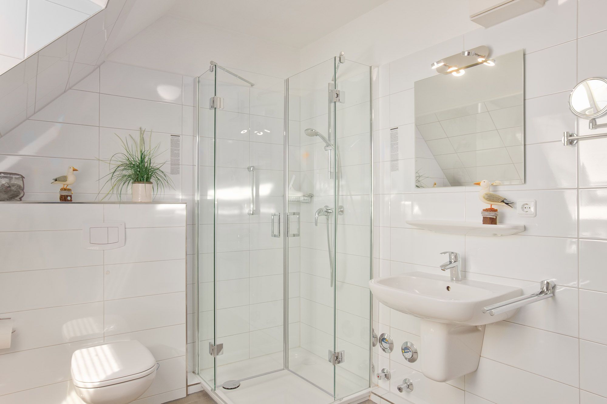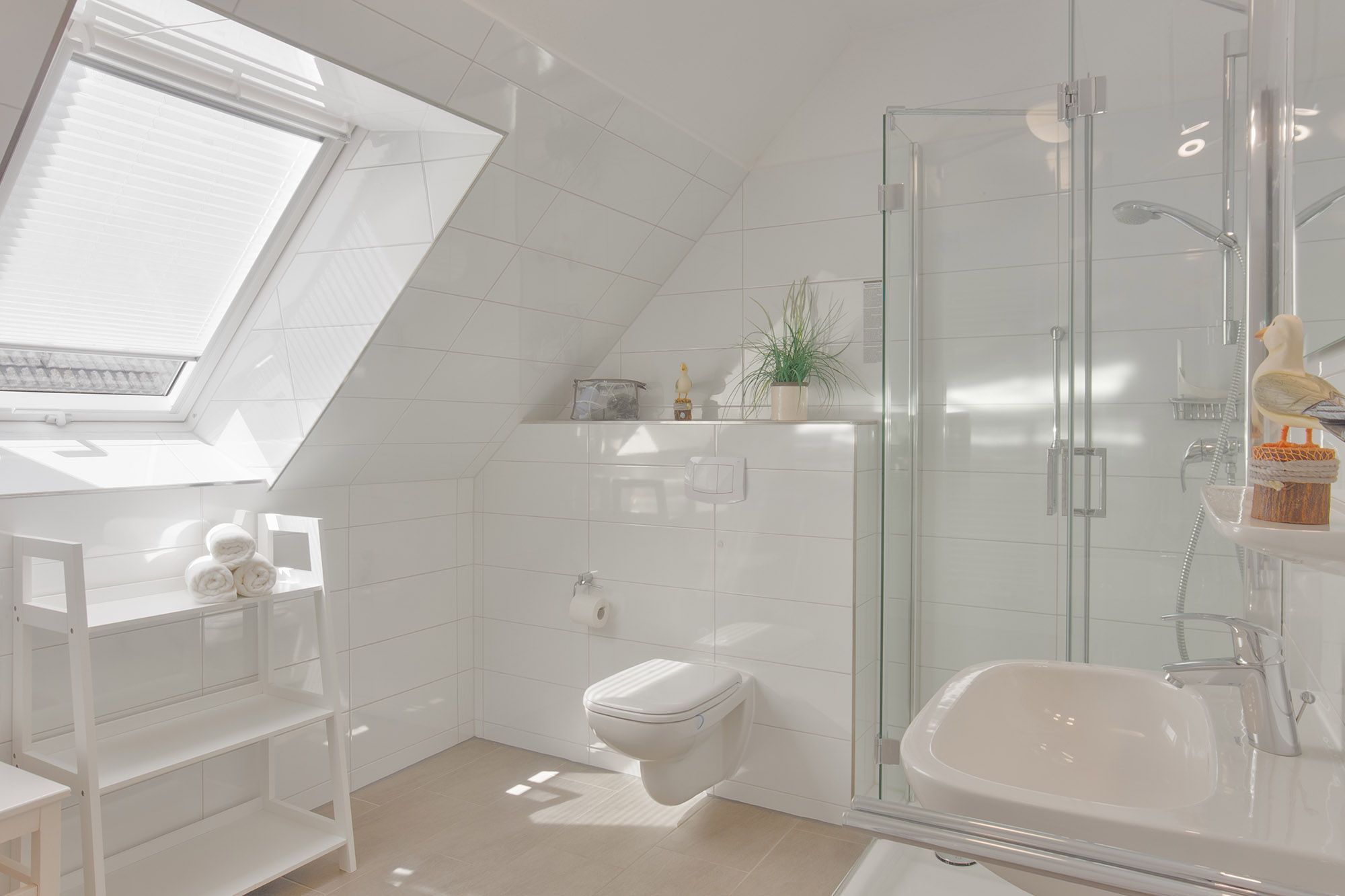 Das helle, moderne Duschbad mit Föhn, Rasierspiegel, Handtuchwärmer und Dachfenster sorgt für zusätzlichen Komfort. Pflegeleichte Böden tragen zum Wohlfühlambiente bei. Eine gemeinschaftlich nutzbare Waschmaschine, ein Trockner und eine Gefriertruhe stehen allen Gästen des Hauses kostenlos zur Verfügung. Im eigenen Abstellraum befinden sich zudem ein Bügeleisen, ein Bügelbrett und ein Wäscheständer.