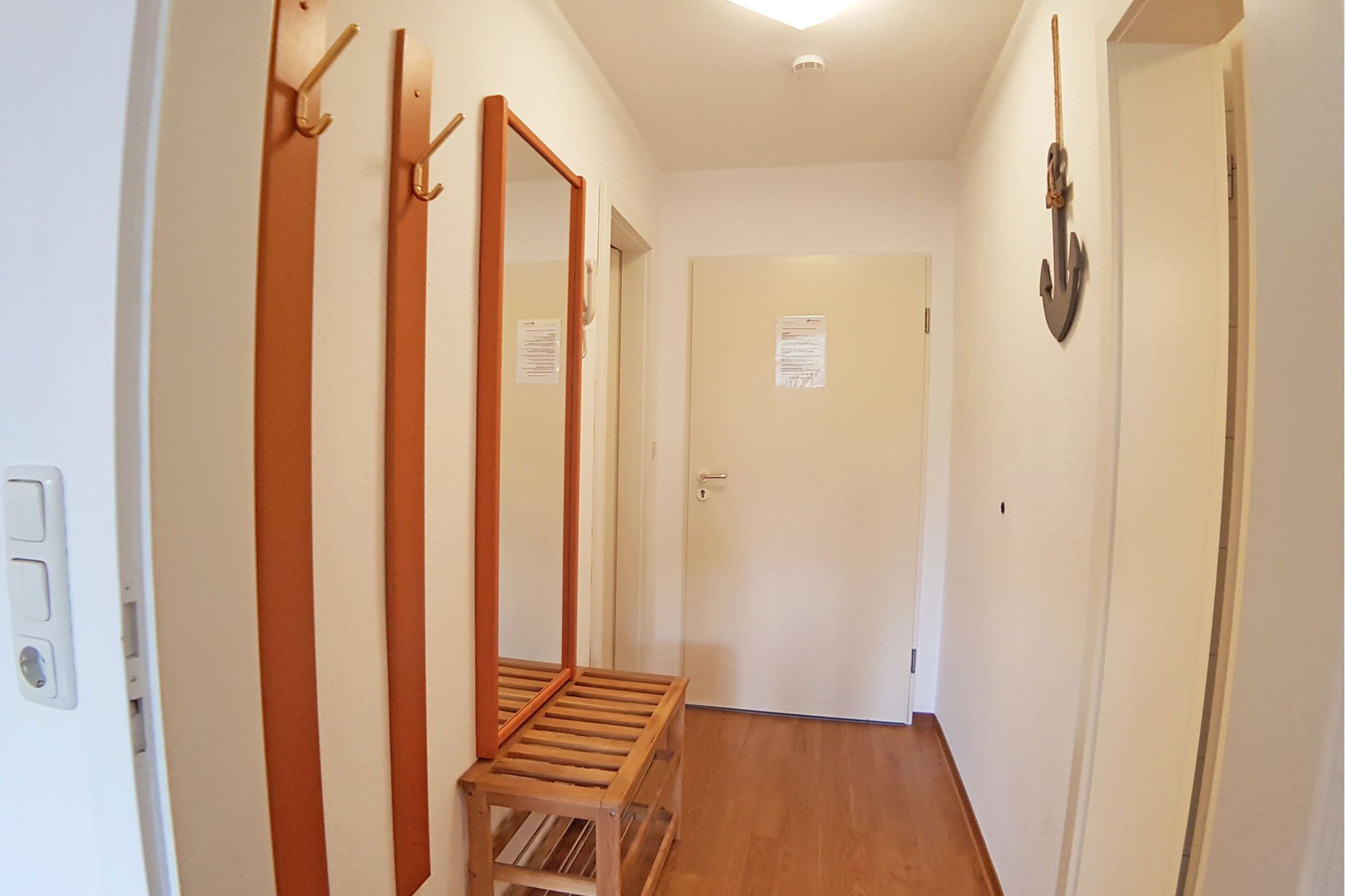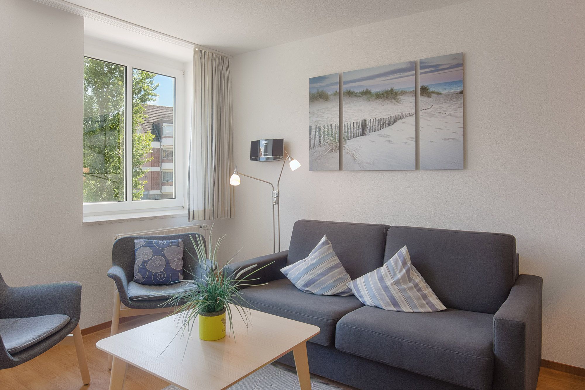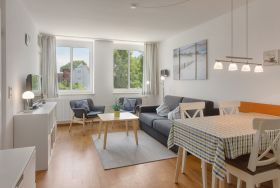 Das Ferienapartment 7 im ersten Obergeschoss bietet auf etwa 40 Quadratmetern ein gemütliches und gut durchdachtes Platzangebot für bis zu drei Personen. Ein helles Schlafzimmer mit komfortablem Doppelbett und geräumigem Kleiderschrank sorgt für erholsame Nächte, während eine großzügige Schlafcouch im Wohnbereich eine weitere Schlafmöglichkeit bietet.