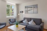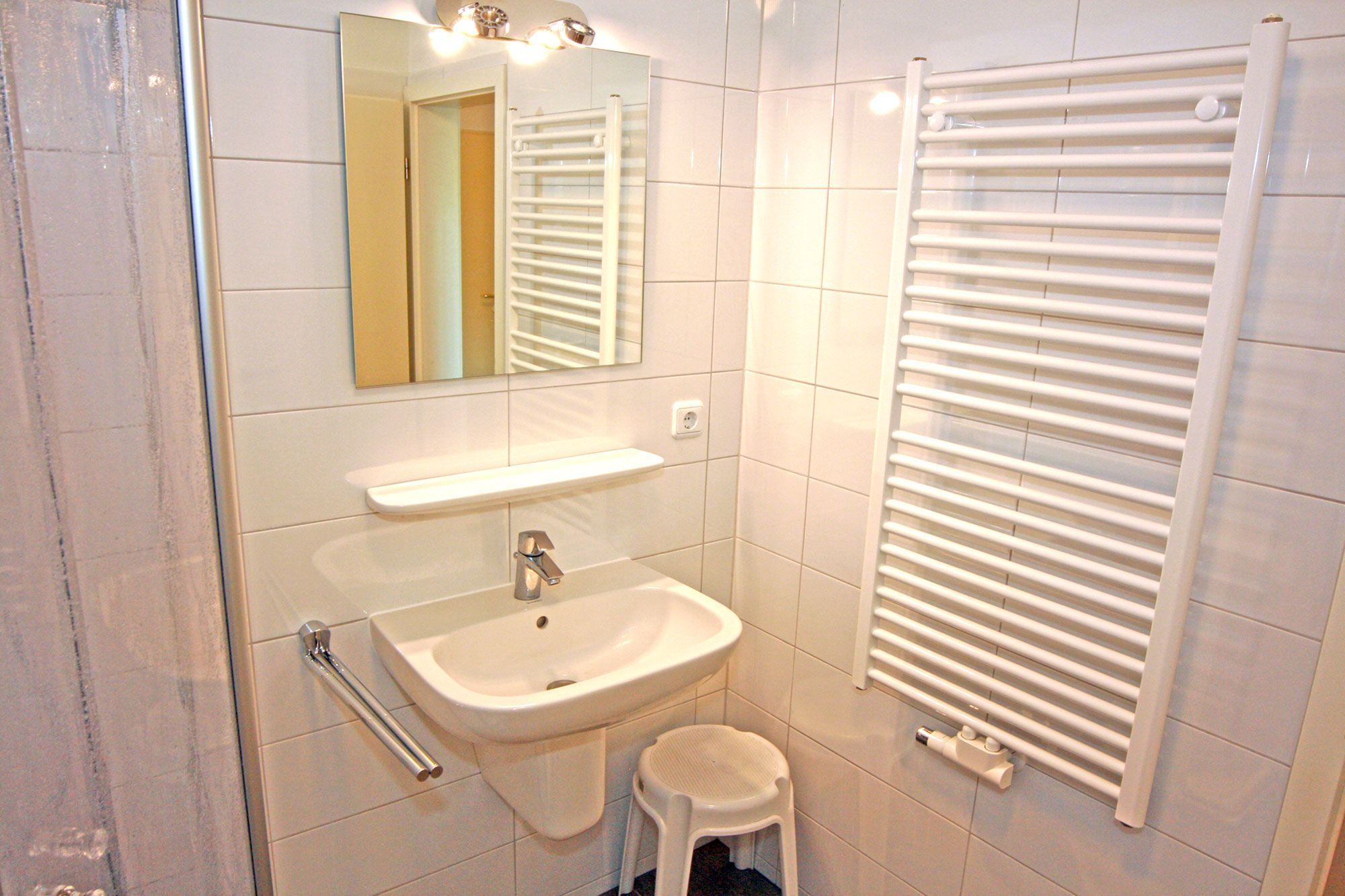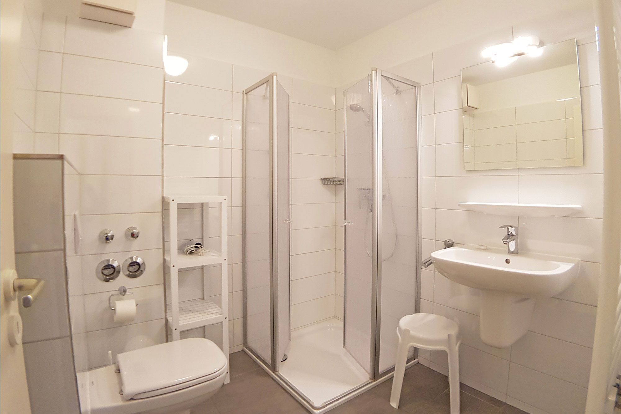 Das moderne Duschbad überzeugt mit einem großen Spiegel, Fön und einem praktischen Handtuchwärmer. Pflegeleichte Böden tragen zusätzlich zum Wohnkomfort bei. Für längere Aufenthalte stehen eine gemeinschaftlich nutzbare Waschmaschine, ein Trockner und eine Gefriertruhe kostenlos im Apartmenthaus zur Verfügung. Ein Abstellraum innerhalb der Wohnung hält zudem ein Bügeleisen, ein Bügelbrett und einen Wäscheständer bereit.