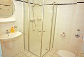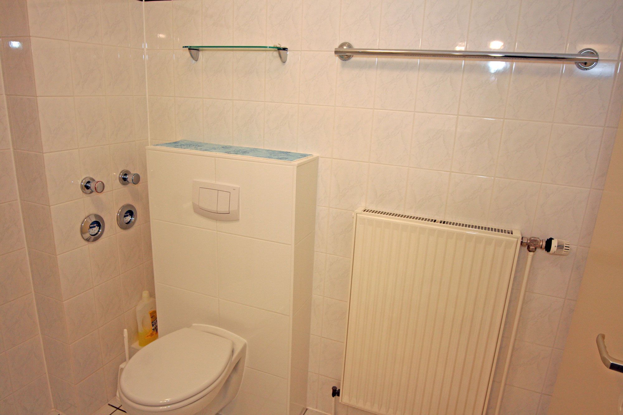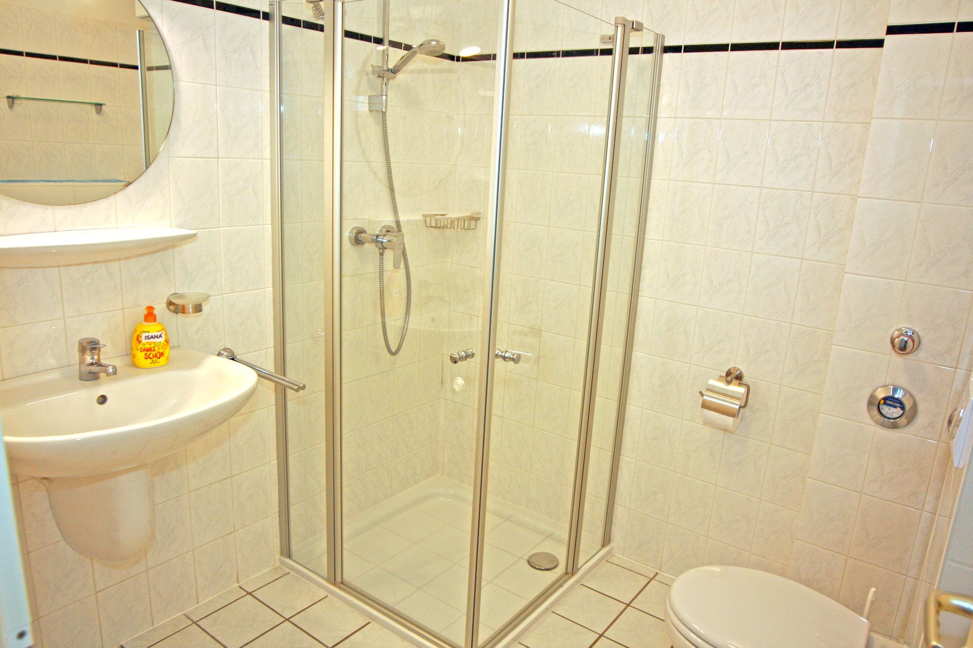Das helle, moderne Duschbad verfügt über einen Föhn, einen Spiegel und eine Heizung zum Handtuchwärmen, sodass zusätzlicher Komfort gewährleistet ist. Pflegeleichte Böden sorgen für eine angenehme Wohnatmosphäre.
