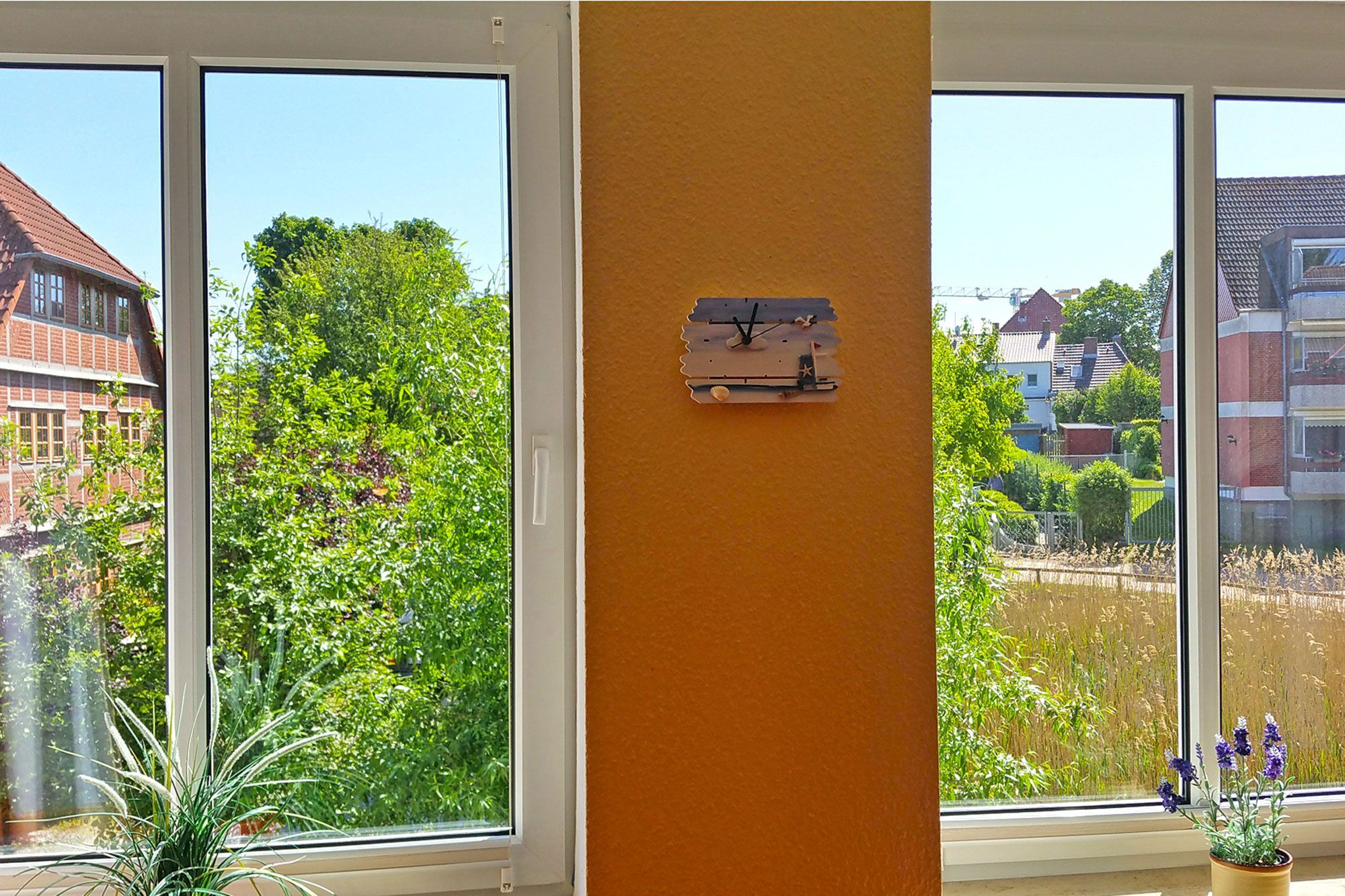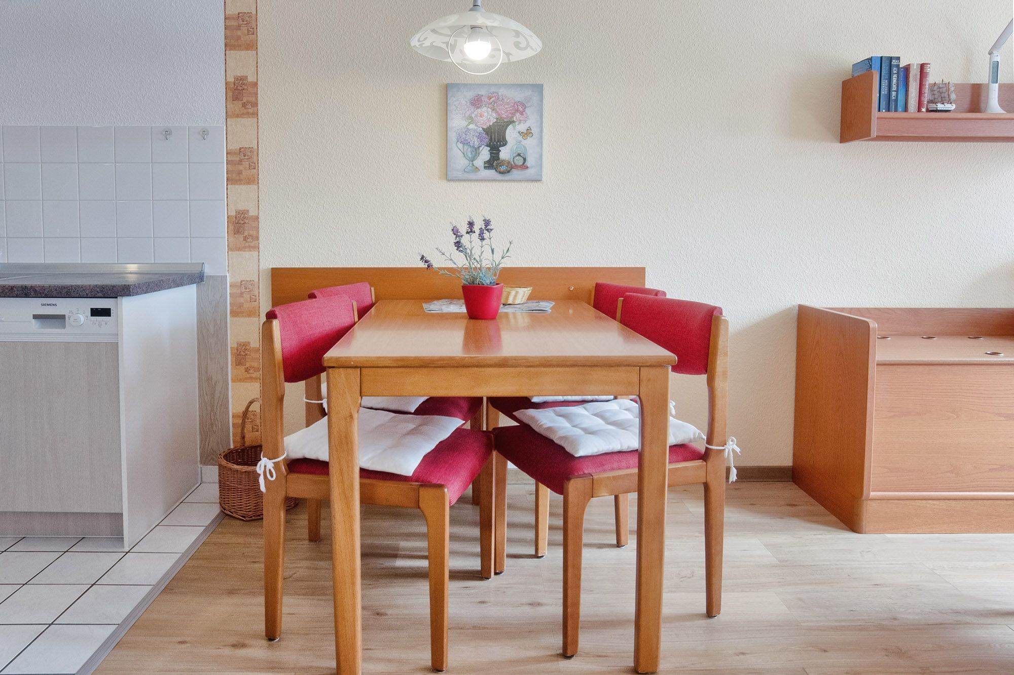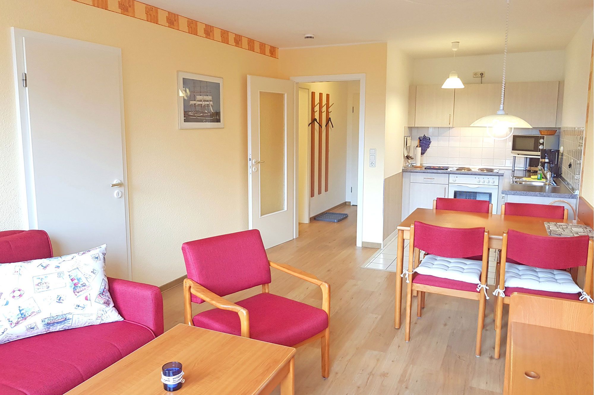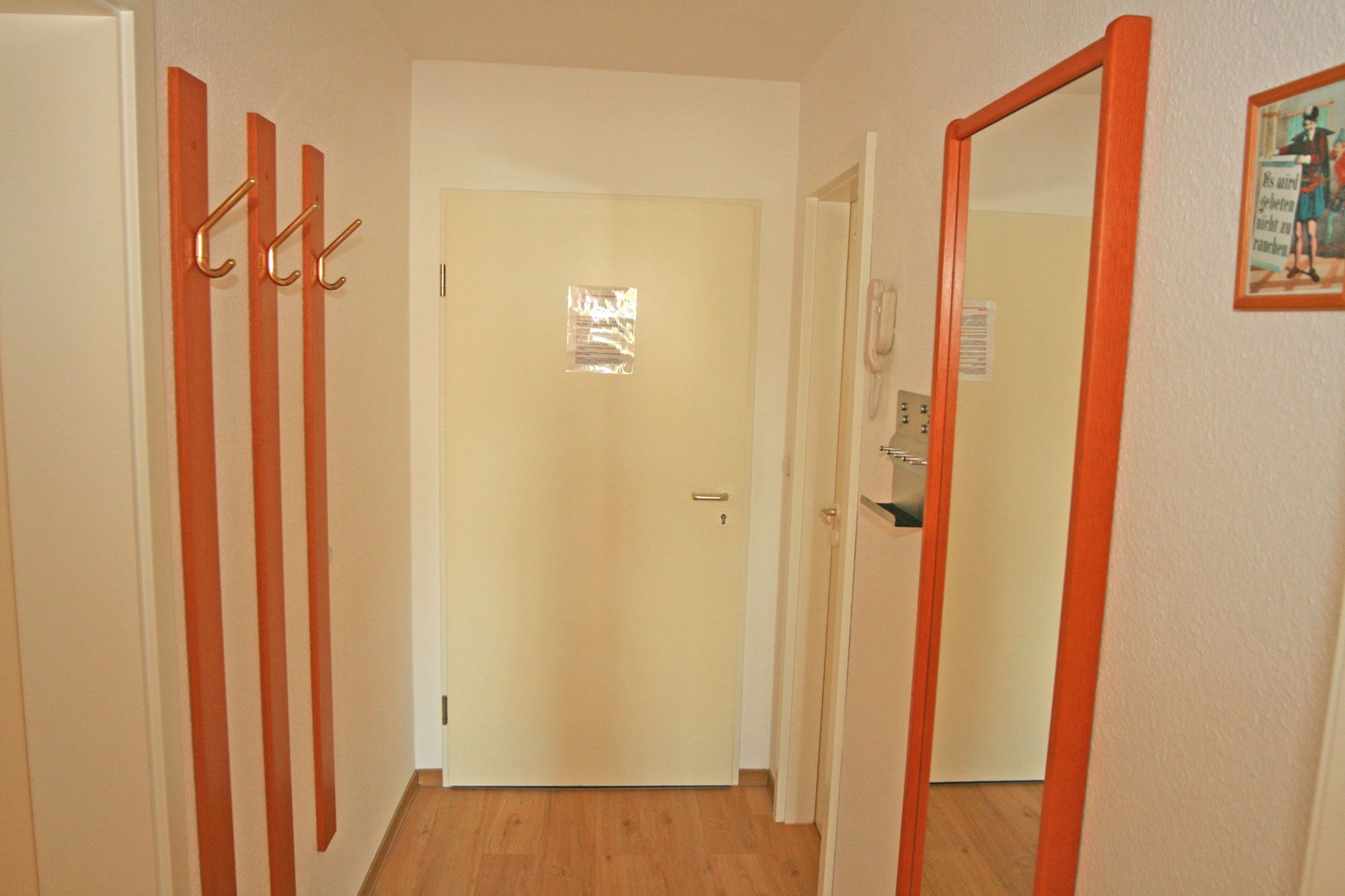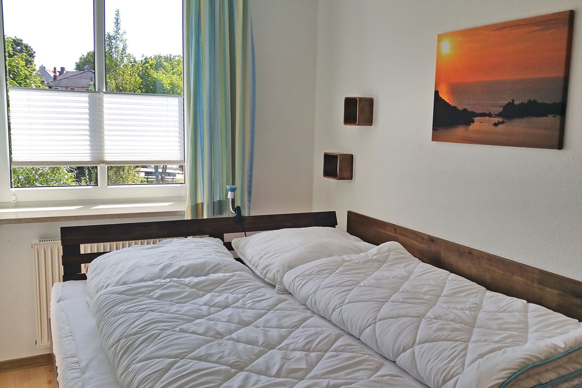 Das Apartment 8 im ersten Obergeschoss bietet auf etwa 40 Quadratmetern ausreichend Platz für bis zu vier Personen, ideal für zwei Erwachsene und zwei Kinder. Das Schlafzimmer ist mit einem 1,60 Meter breiten Doppelbett und einem großen Kleiderschrank ausgestattet. Eine großzügige Schlafcouch im Wohnbereich bietet zwei weiteren Personen eine komfortable Schlafmöglichkeit.