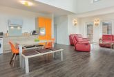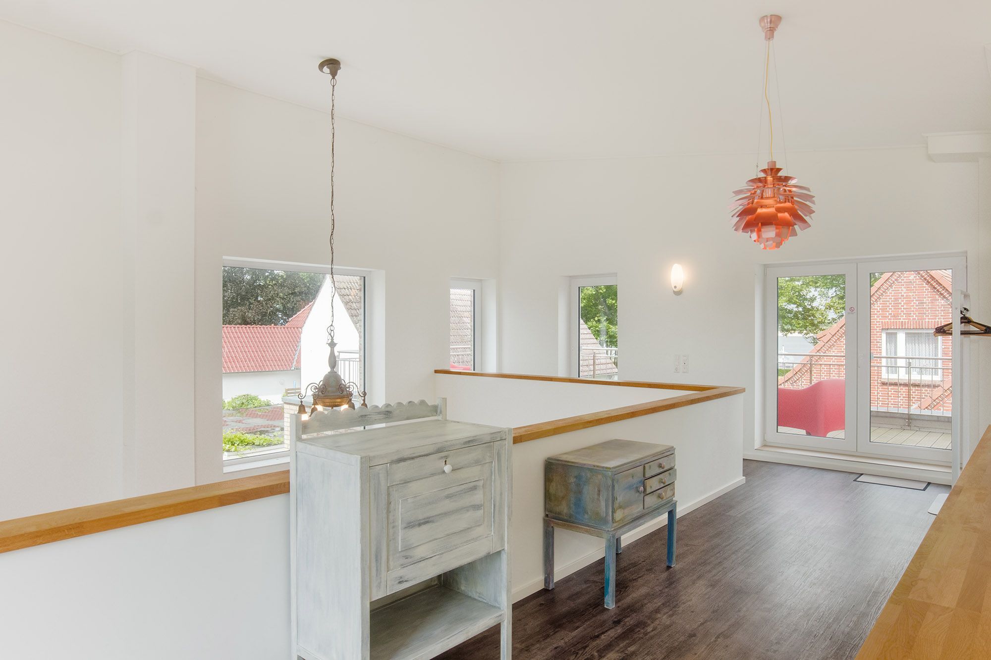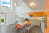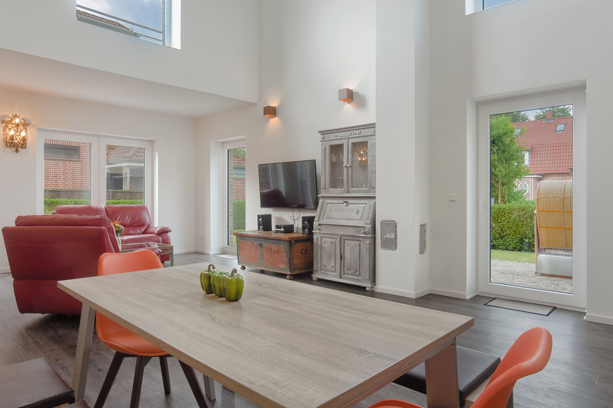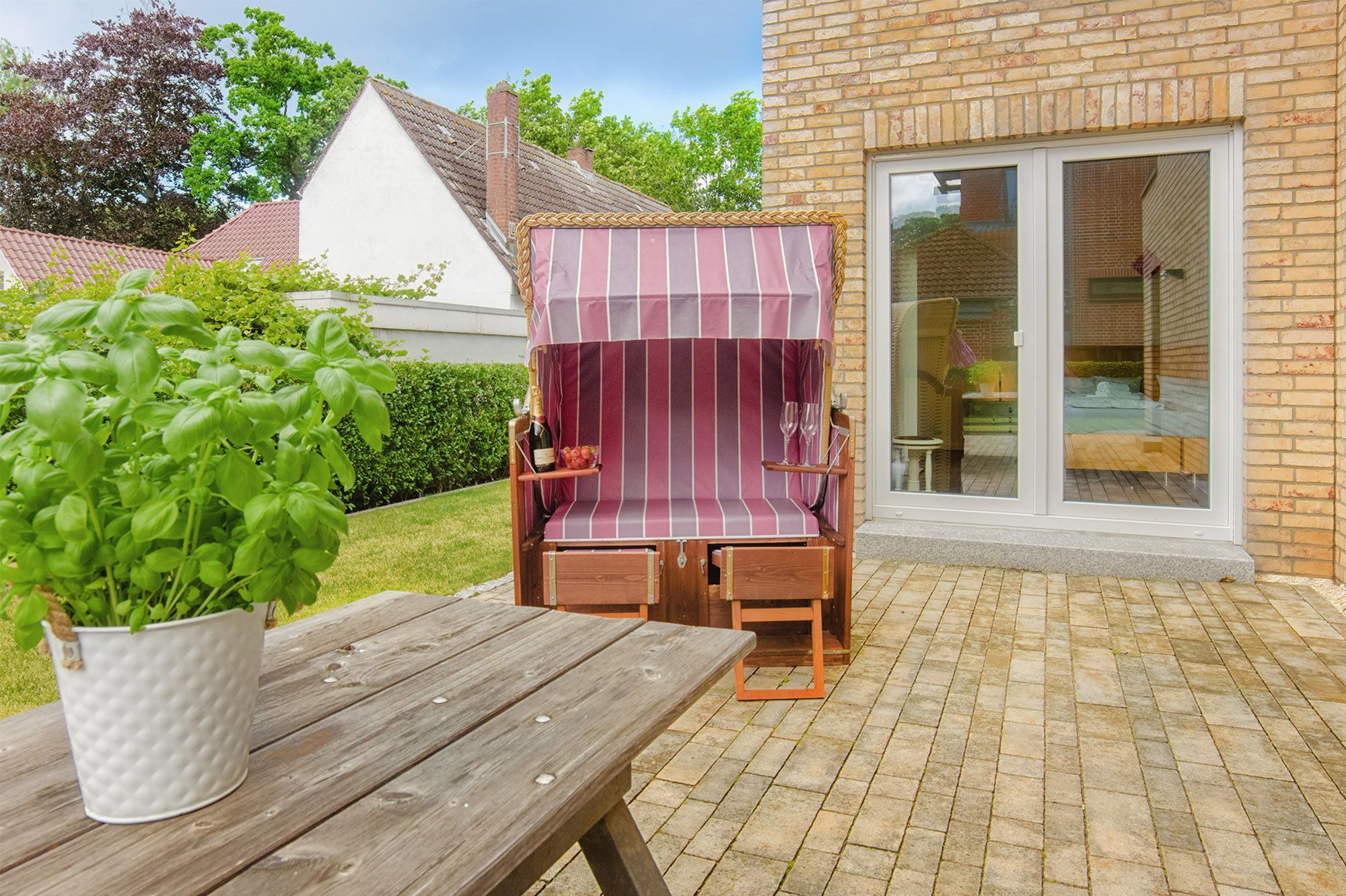 Das neue und topmoderne Ferienhaus Kehrwieder No.5 bietet sehr viel Platz auf ca. 158m² Wohnfläche und ist besonders für Familien, Allergiker oder Zweisamkeit-Suchende interessant. Der Wohnbereich strahlt die gehobene Atmosphäre zur Entspannung mit Relax-Ledercouchs und Fernsehsessel geradezu aus. Dabei lässt sich Gemütlichkeit bei HD-SmartTV oder WLAN-Nutzung leben. Kulinarisch steht Ihnen im ca. 60 m² großen und offenen Wohnküchen-Essbereich, mit offener Decke zum Obergeschoss, nichts im Wege. Dafür sorgt die hochwertige und voll ausgestattete Küche, die geradezu zum Kochen einlädt. Der große Esstisch mit zwei Sitzbänken und zwei Stühlen für mindestens 6 Personen schafft einen Treffpunkt für Ihren Aufenthalt. Hier lässt sich der Urlaub beim Essen bestens planen. Für die nächtliche Erholung stehen zwei Schlafzimmer im Erdgeschoss, sowie ein Schlafzimmer im Obergeschoss zur Verfügung. Die Schlafzimmer sind sämtlich mit Doppelboxspringbetten für den entsprechenden Liegekomfort und TV zum relaxten Einschlummern ausgestattet. Allergiker geeignete Bettwäsche und Handtücher sind gg. Gebühr möglich. Das große Schlafzimmer verfügt über einen begehbaren Kleiderschrank, sowie direkten Garten- und Badezimmerzugang. Ebenso erreichen Sie das Badezimmer vom gegenüberliegenden Schlaf-/Kinderzimmer. Die Schlafzimmer im EG sind mit Schiebetüren versehen und nicht abschließbar! Ein zusätzliches Gäste-WC im Erdgeschoss sorgt auch hier für die nötige Ungestörtheit. Über die Diele gelangen Sie ins Obergeschoss, wo sich weitere High-Lights des Hauses befinden. Über die fantastische Galerie im Obergeschoss erreichen sie die ca. 40 m² Nordterrasse mit Blick auf den Binnensee oder die ca. 20 m² Südterrasse mit Blick zum Kurpark oder zur Stadtkirche. Das dritte Schlafzimmer, sowie ein weiteres Duschbad mit Doppelwaschbecken und WC schaffen hier einen Rückzug für Wellness und Entspannung. Verdunklung ist in allen Zimmern über elektrische Rollläden möglich. Ein Baby-Reisebett und ein Hochstuhl können optional dazu gebucht werden. Vom Wohnbereich oder Schlafzimmer im Erdgeschoss geht es hinaus in den großzügigen Garten (ca. 350 m²) mit einer ca. 100 m² großen und möblierten Gartenterrasse in Südwest-Lage. Hier genießen Sie die Sonne in den zwei Liege-Strandkörben und relaxen nahezu perfekt. Auf abendliches Grillen müssen Sie ebenfalls nicht verzichten! Auf den Dachterrassen stehen Gartensessel zur weiteren Verfügung. Hier verleben Sie den Sonnenuntergang oder Abend bei einem herrlichen Glas Wein oder kühlem Getränk. Zusätzlich steht ein Saisonstrandkorb (15.Mai - 15.Sep) am Strand nahe der Seebrücke kostenlos zum Strandvergnügen zu Verfügung.