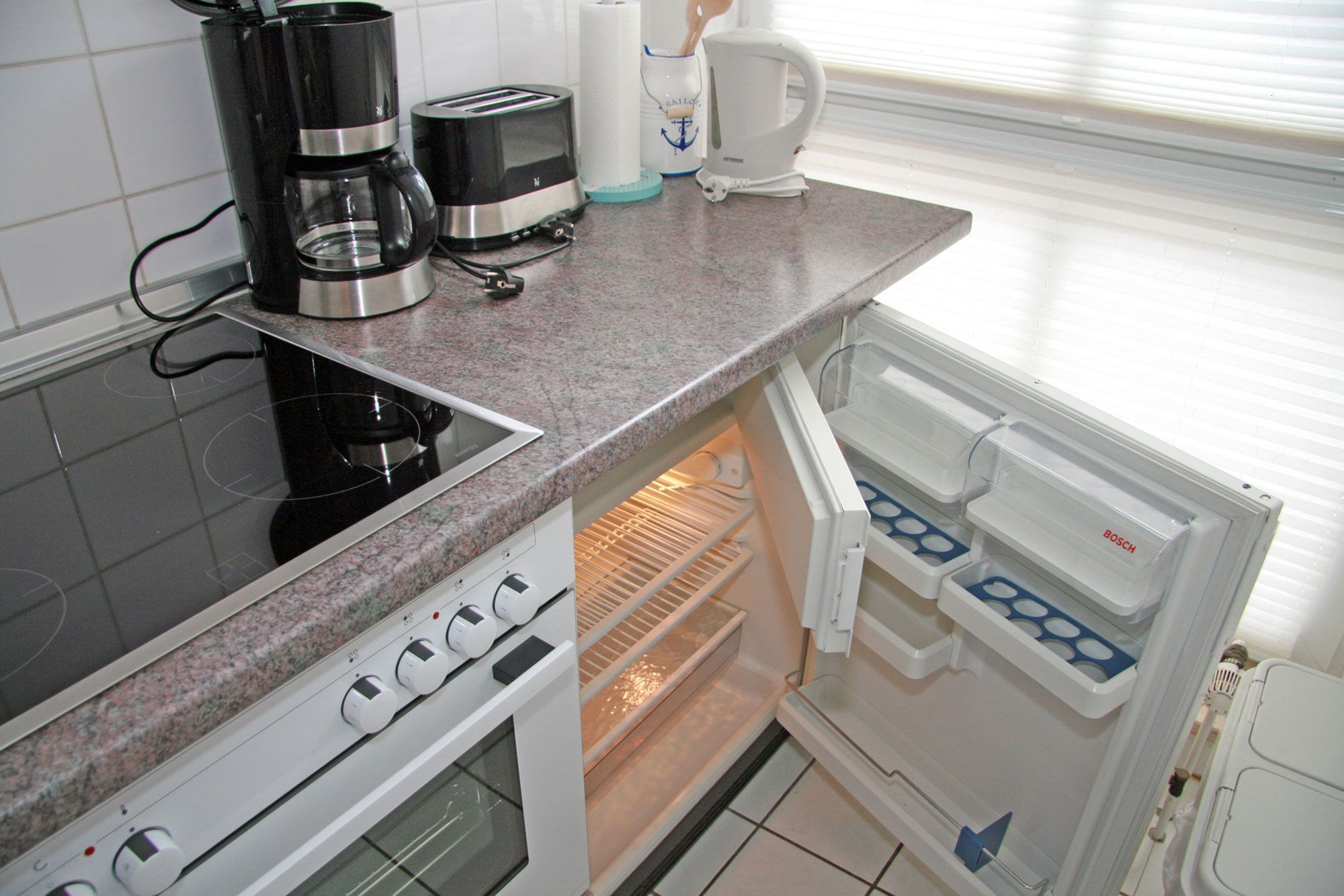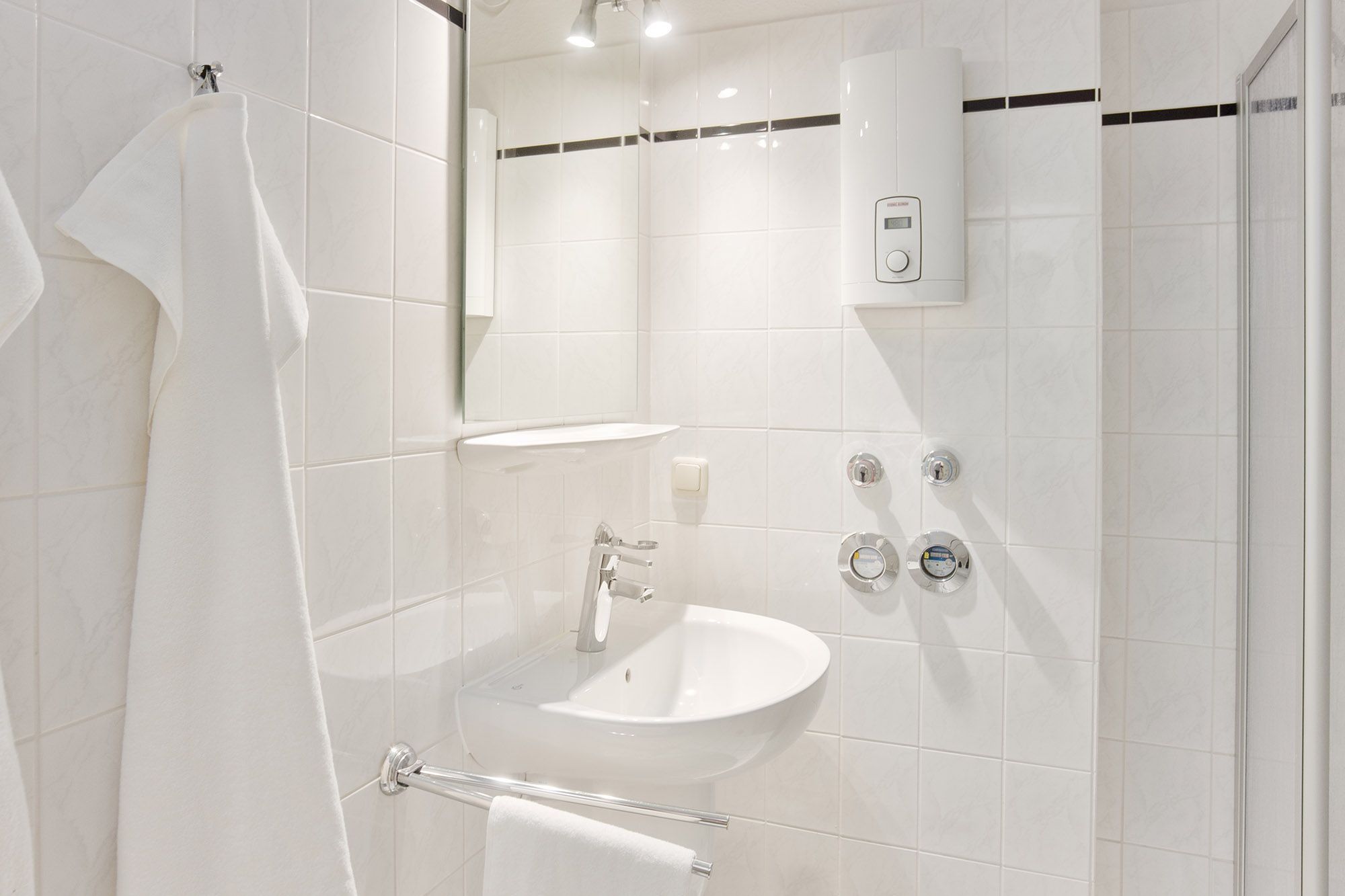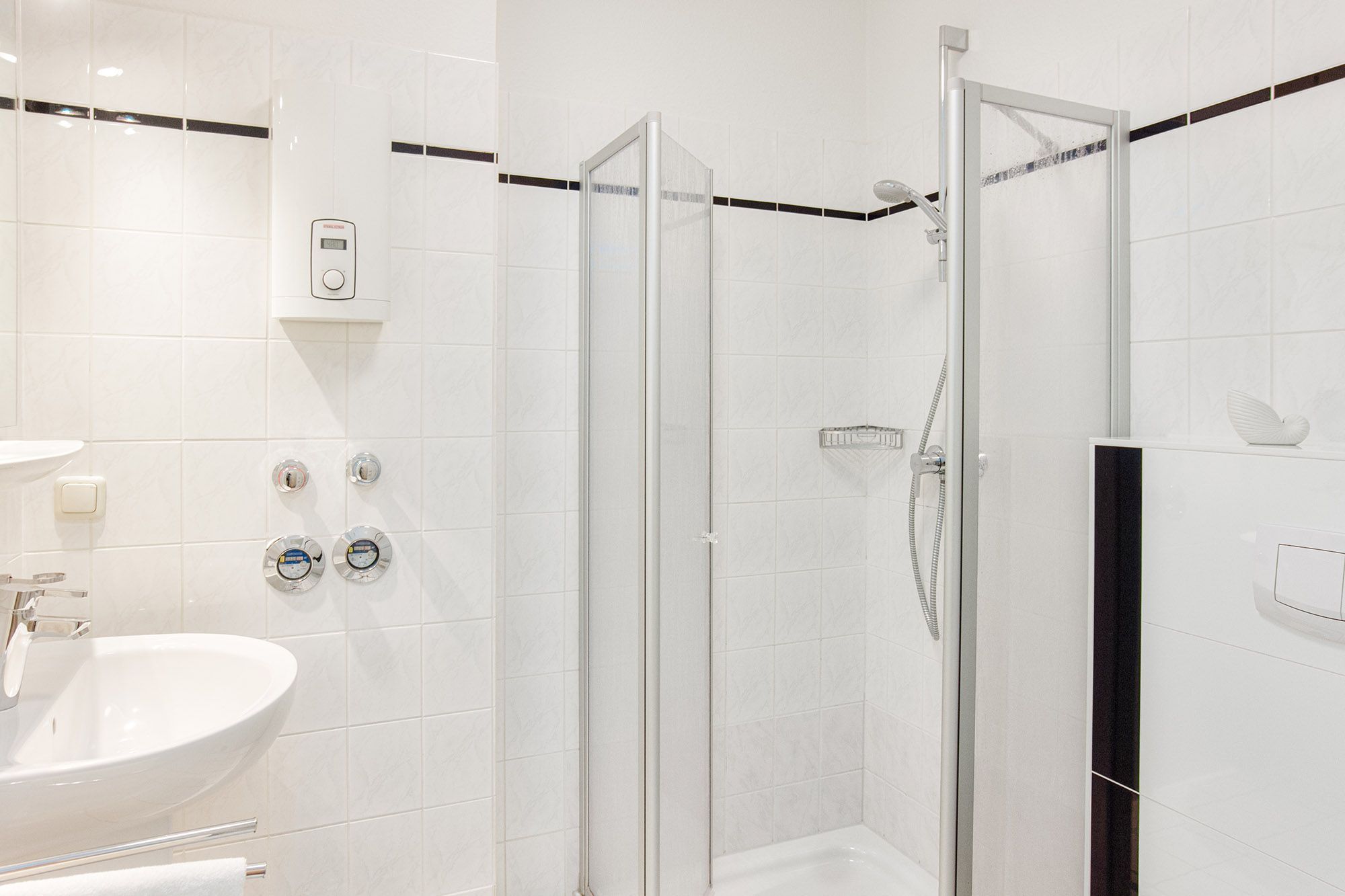 Das helle, moderne Duschbad mit WC sorgt für zusätzlichen Komfort. Pflegeleichte Böden tragen zum Wohlfühlambiente bei. Eine gemeinschaftlich nutzbare Waschmaschine, ein Trockner und eine Gefriertruhe stehen allen Gästen des Hauses kostenlos zur Verfügung. Ein eigener Abstellraum innerhalb der Wohnung hält außerdem ein Bügeleisen, ein Bügelbrett und einen Wäscheständer bereit.