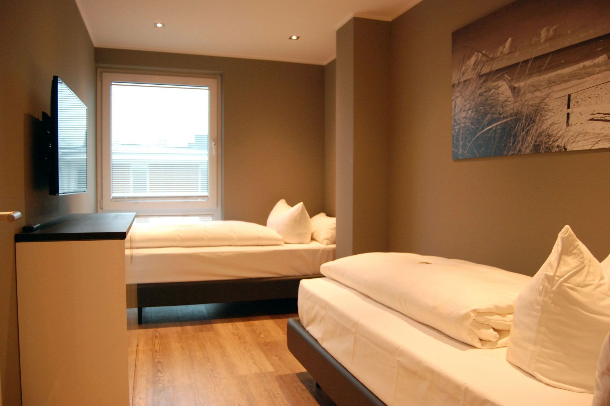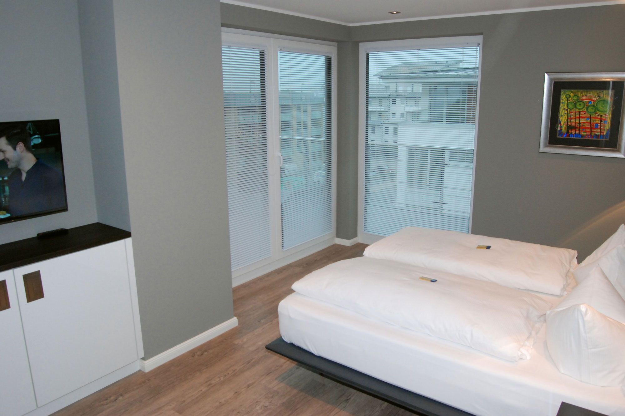 Die Wohnung bietet zwei komfortable Schlafzimmer eines mit Doppelbett, das andere mit zwei Einzelbetten jeweils mit eigenem TV. Allergiker-geeignete Hotelbettwäsche und Handtücher können optional dazu gebucht werden. Das großzügige Bad ist mit Fußbodenheizung, Handtuchwärmer und einer geräumigen Dusche ausgestattet ideal, um nach einem Tag am Meer zu entspannen. Eine integrierte Waschmaschine befindet sich in der Küche.