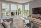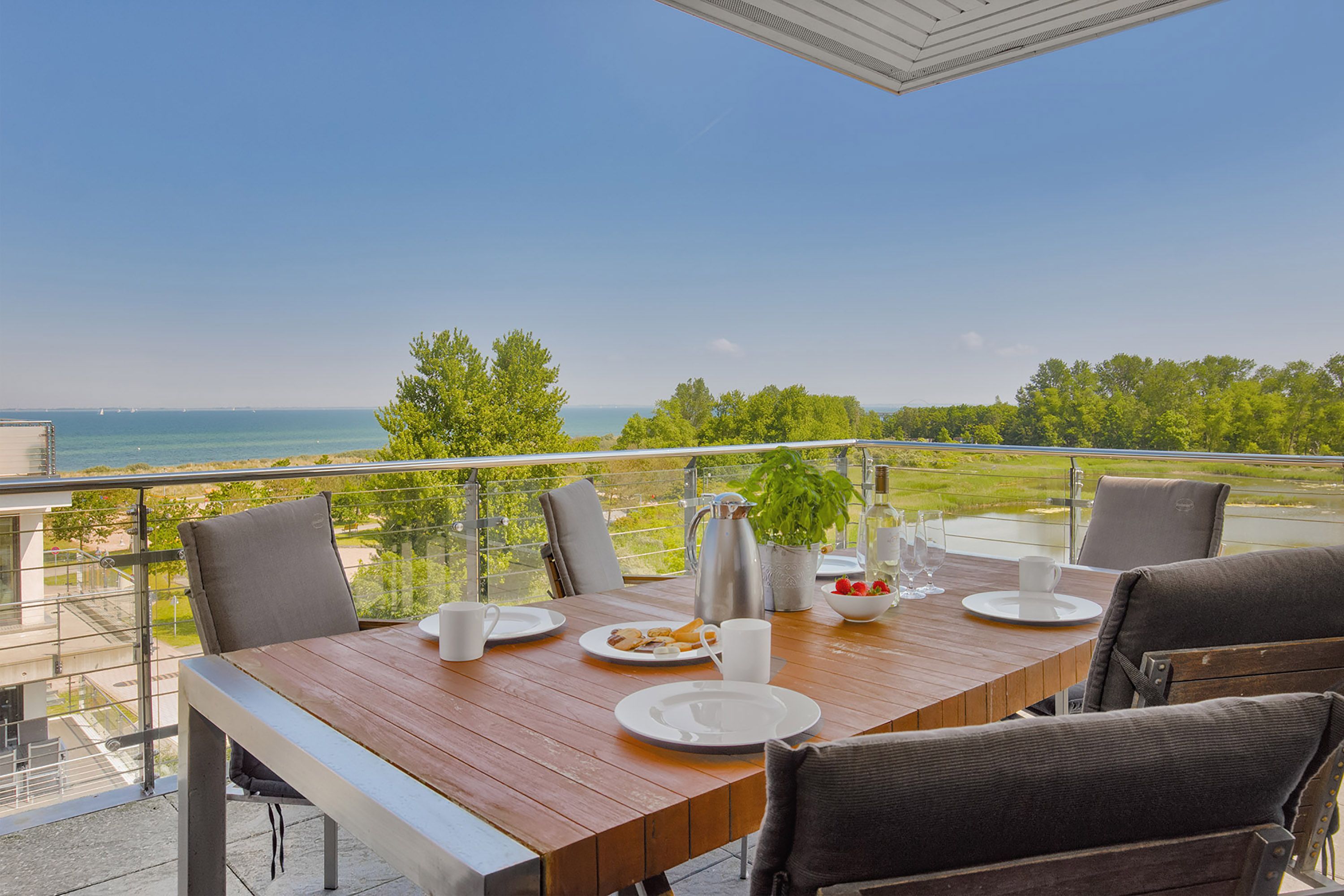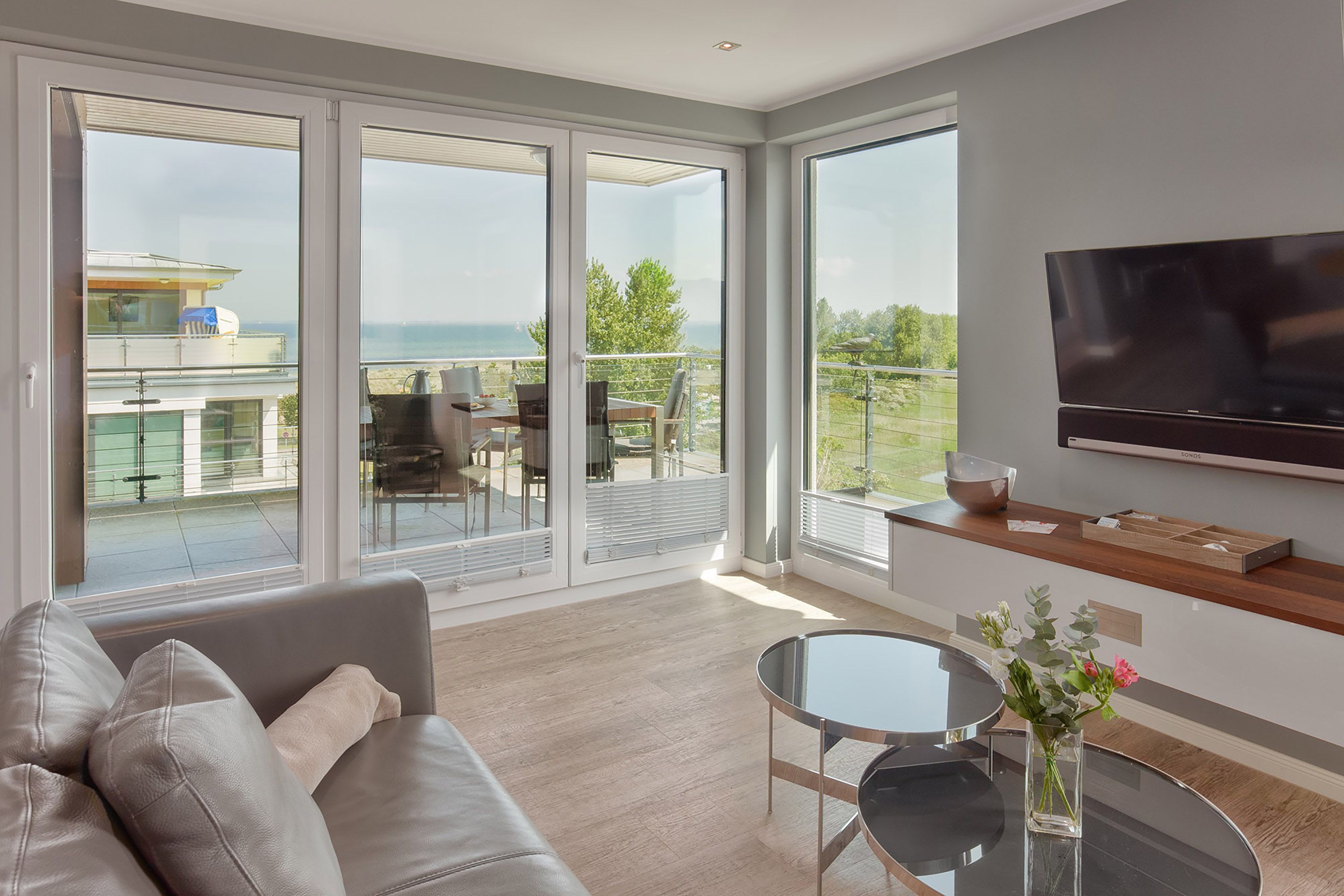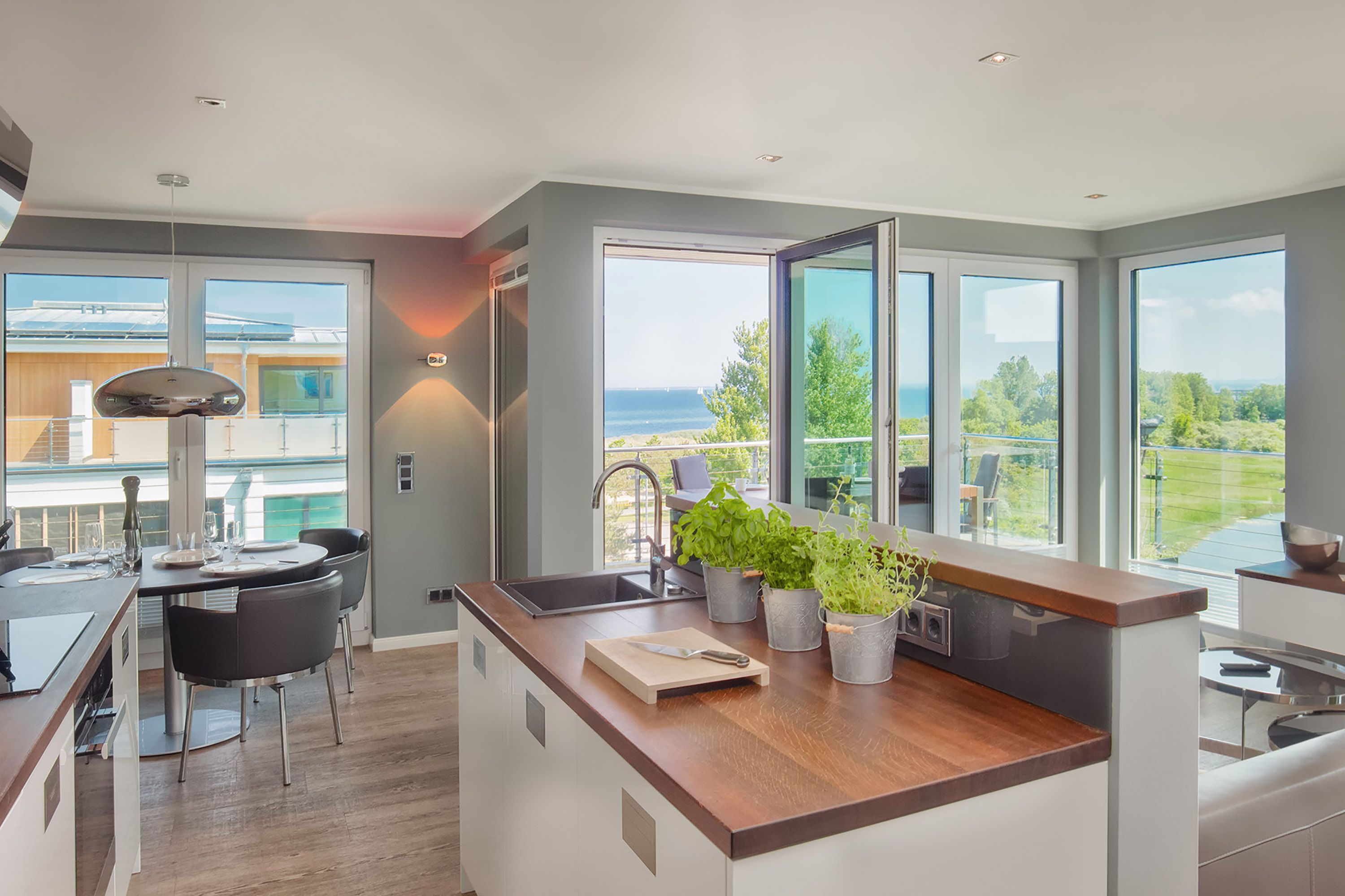 Der lichtdurchflutete Wohnbereich lädt mit zwei bequemen Couches, einem 3D-TV (inklusive Brillen), einer SONOS-Soundanlage und einem Blu-Ray-Player zum Entspannen ein. Die angrenzende, offene Designerküche ist voll ausgestattet und verfügt über ein Induktionskochfeld, hochwertige WMF-Küchenutensilien und zahlreiche Extras, um höchsten kulinarischen Ansprüchen gerecht zu werden. Der Essbereich bietet einen direkten Ostseeblick und schafft eine besondere Atmosphäre beim Speisen.
