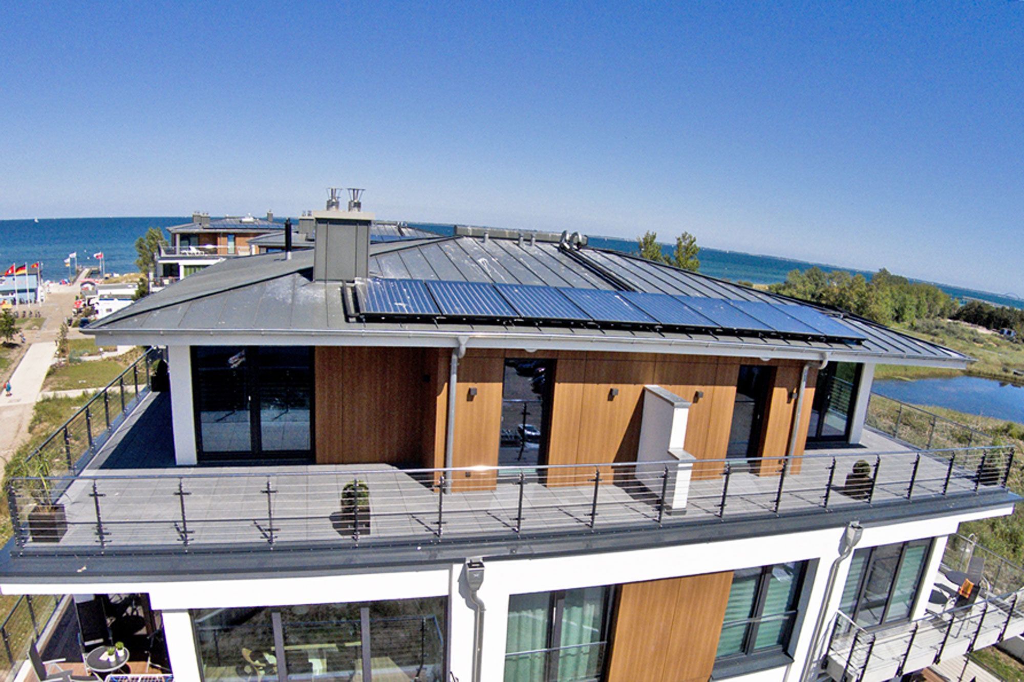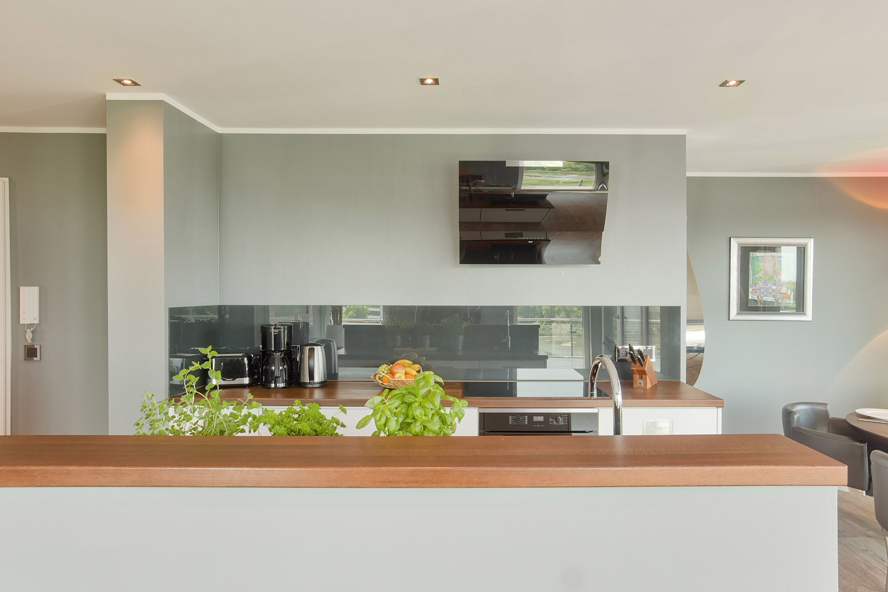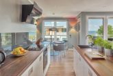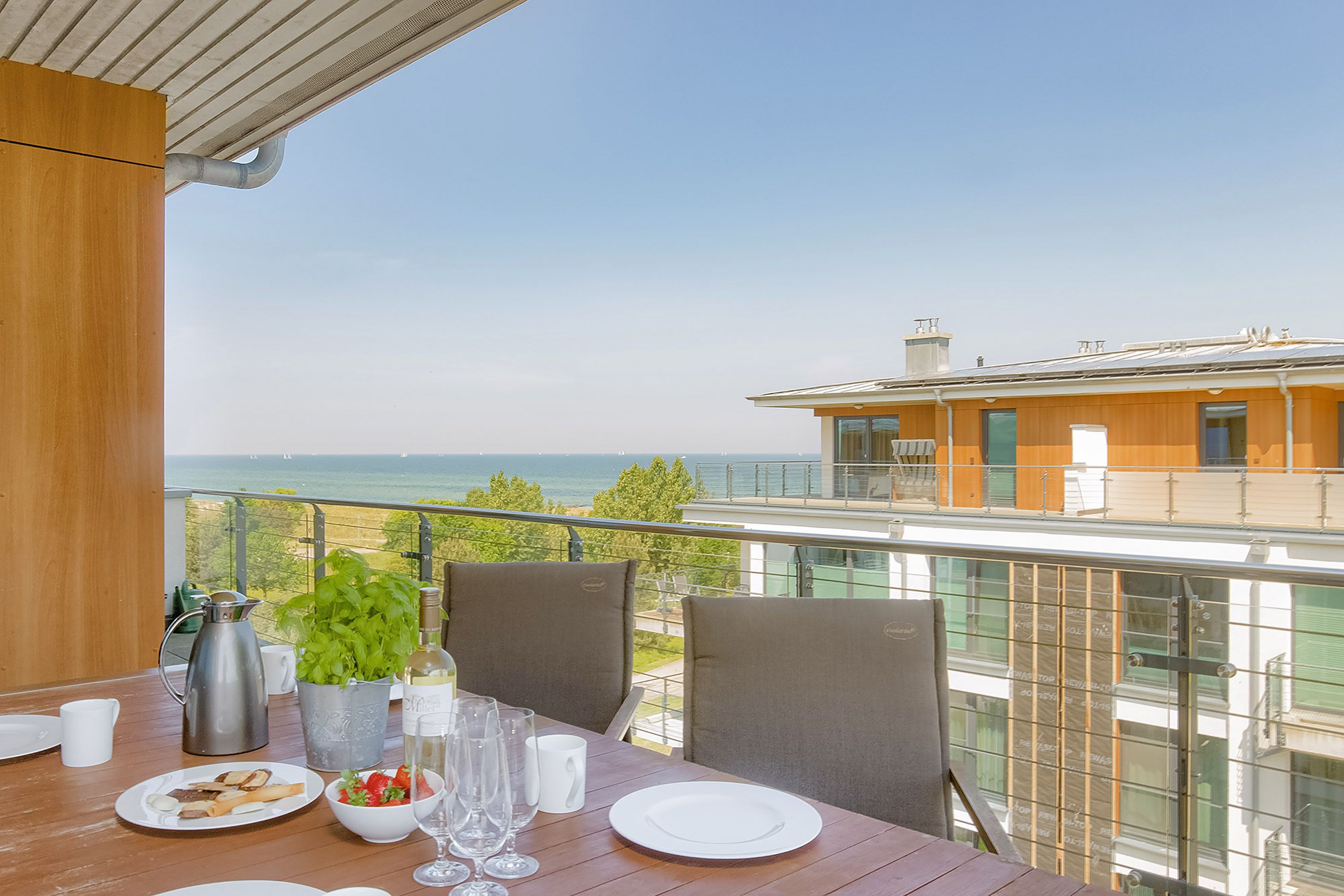 Der lichtdurchflutete Wohnbereich lädt mit zwei bequemen Couches, einem 3D-TV (inklusive Brillen), einer SONOS-Soundanlage und einem Blu-Ray-Player zum Entspannen ein. Die angrenzende, offene Designerküche ist voll ausgestattet und verfügt über ein Induktionskochfeld, hochwertige WMF-Küchenutensilien und zahlreiche Extras, um höchsten kulinarischen Ansprüchen gerecht zu werden. Der Essbereich bietet einen direkten Ostseeblick und schafft eine besondere Atmosphäre beim Speisen.