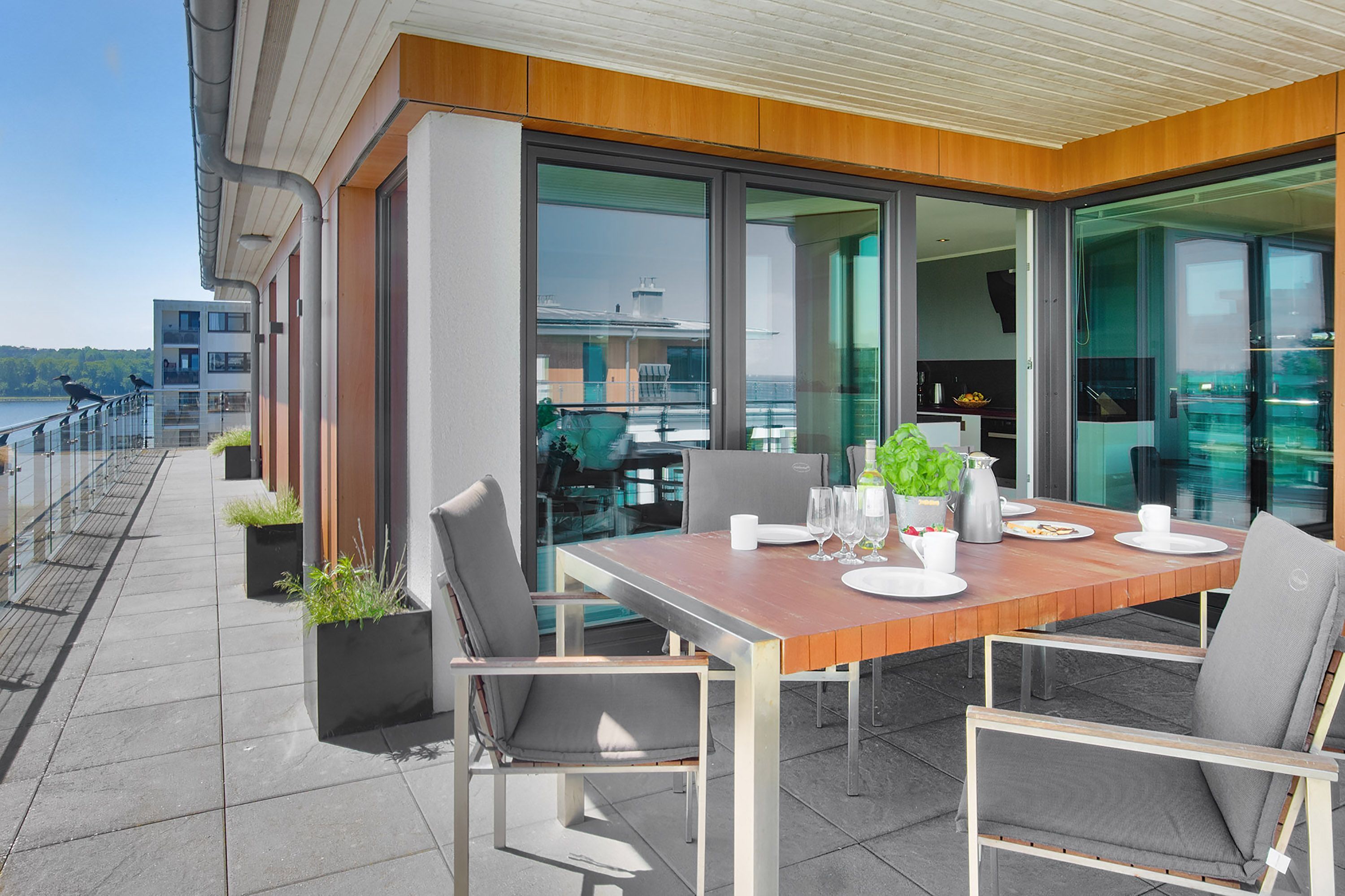 Die halbseitig umlaufende Terrasse ist von allen Räumen aus zugänglich und ermöglicht ein einzigartiges Ostsee-Feeling. Mit stilvollen Gartenmöbeln ausgestattet, lädt sie zum Verweilen ein, während der exklusive Gasgrill für das leibliche Wohl sorgt. Ob eine frische Tasse Kaffee am Morgen oder ein kühles Glas Wein beim Sonnenuntergang hier lässt sich das maritime Flair in vollen Zügen genießen.