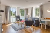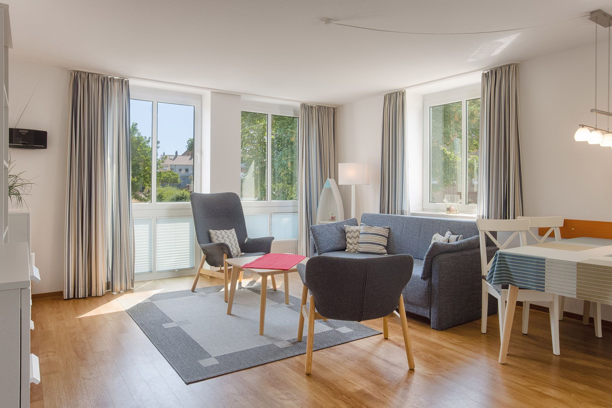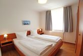 Das Apartment 9 im ersten Obergeschoss bietet auf etwa 50 Quadratmetern ausreichend Platz für bis zu vier Personen. Das Schlafzimmer ist mit einem Doppelbett und einem großen Kleiderschrank ausgestattet. Im Wohnbereich sorgt eine großzügige Schlafcouch für zwei weitere Personen für erholsame Nächte.