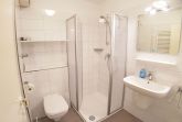 Das helle, moderne Duschbad mit ebenerdiger Dusche, Föhn, Rasierspiegel und Handtuchwärmer sorgt für zusätzlichen Komfort. Pflegeleichte Böden tragen zum Wohlfühlambiente bei. Eine gemeinschaftlich nutzbare Waschmaschine, ein Trockner und eine Gefriertruhe stehen allen Gästen des Hauses kostenlos im Erdgeschoss zur Verfügung. Im eigenen Abstellraum befinden sich zudem ein Bügeleisen, ein Bügelbrett und ein Wäscheständer.